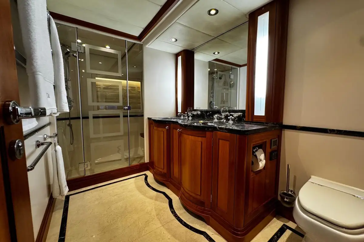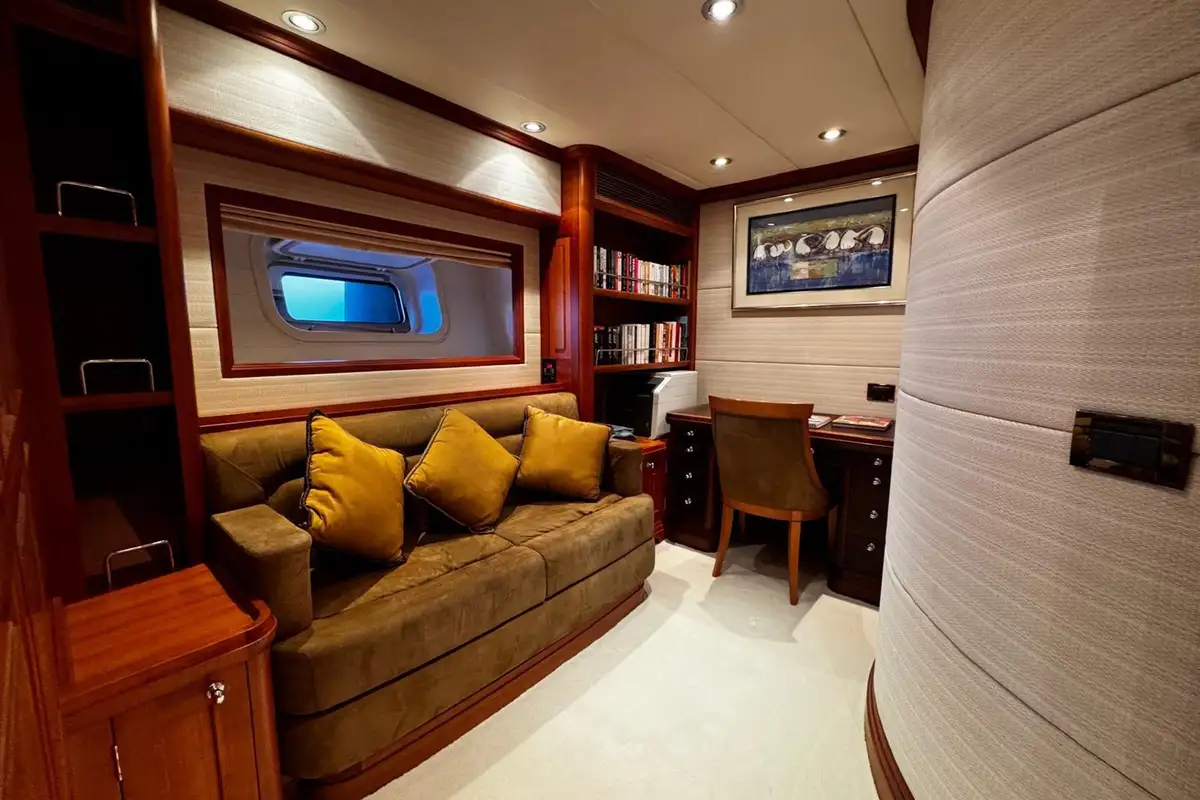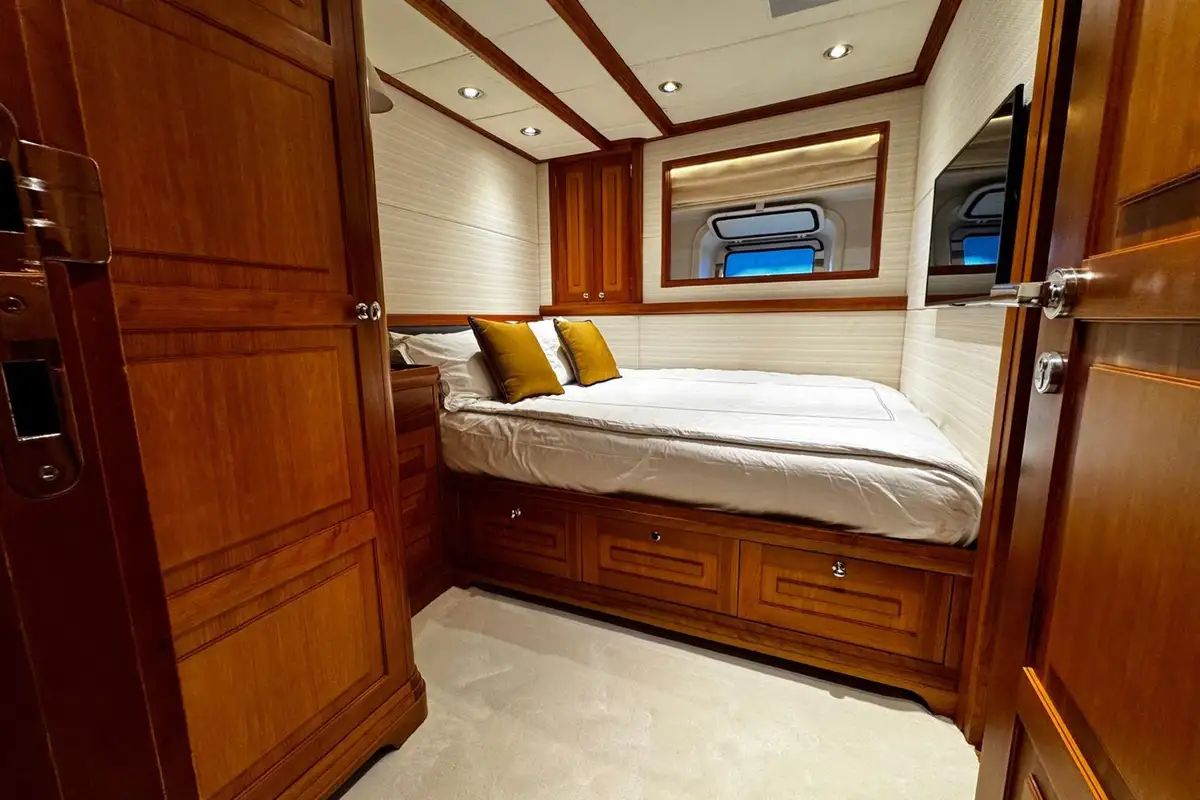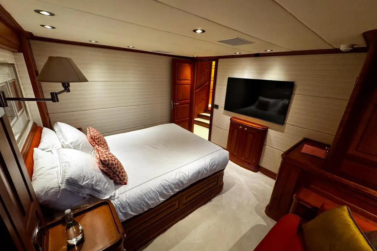 Her sophisticated interior by Redman Whiteley Dixon accommodates up to eight guests in four beautifully appointed cabins, including a full-beam owner’s suite complete with a private office and spacious en suite. Two additional double and a smaller double cabin, ensuring a comfortable and private experience for all onboard.