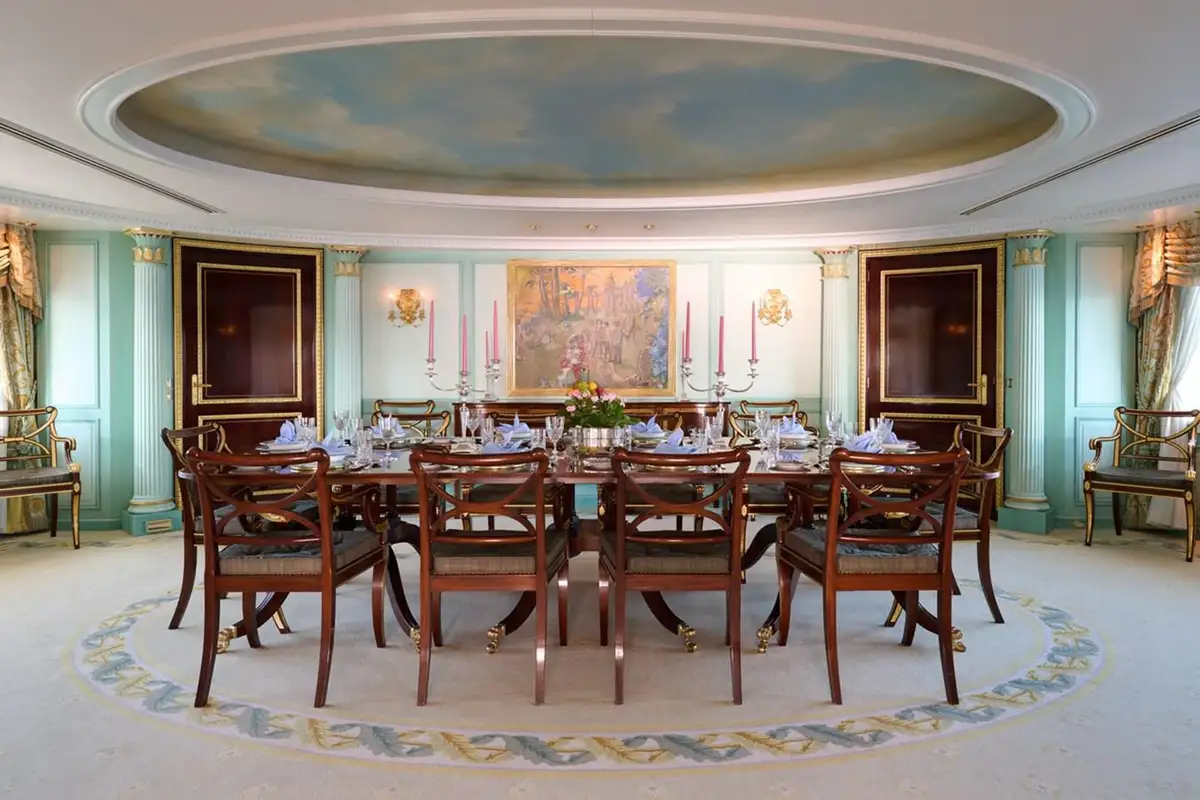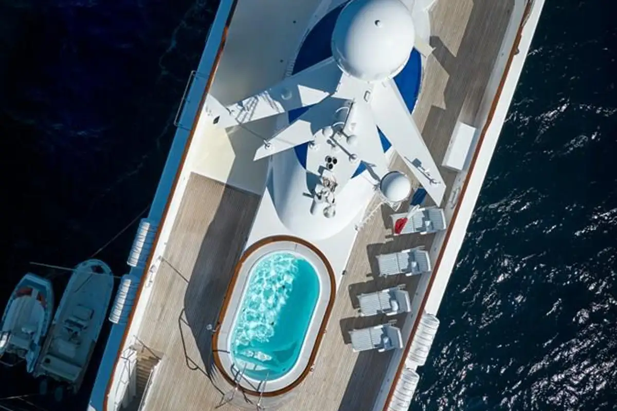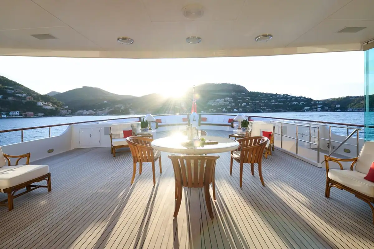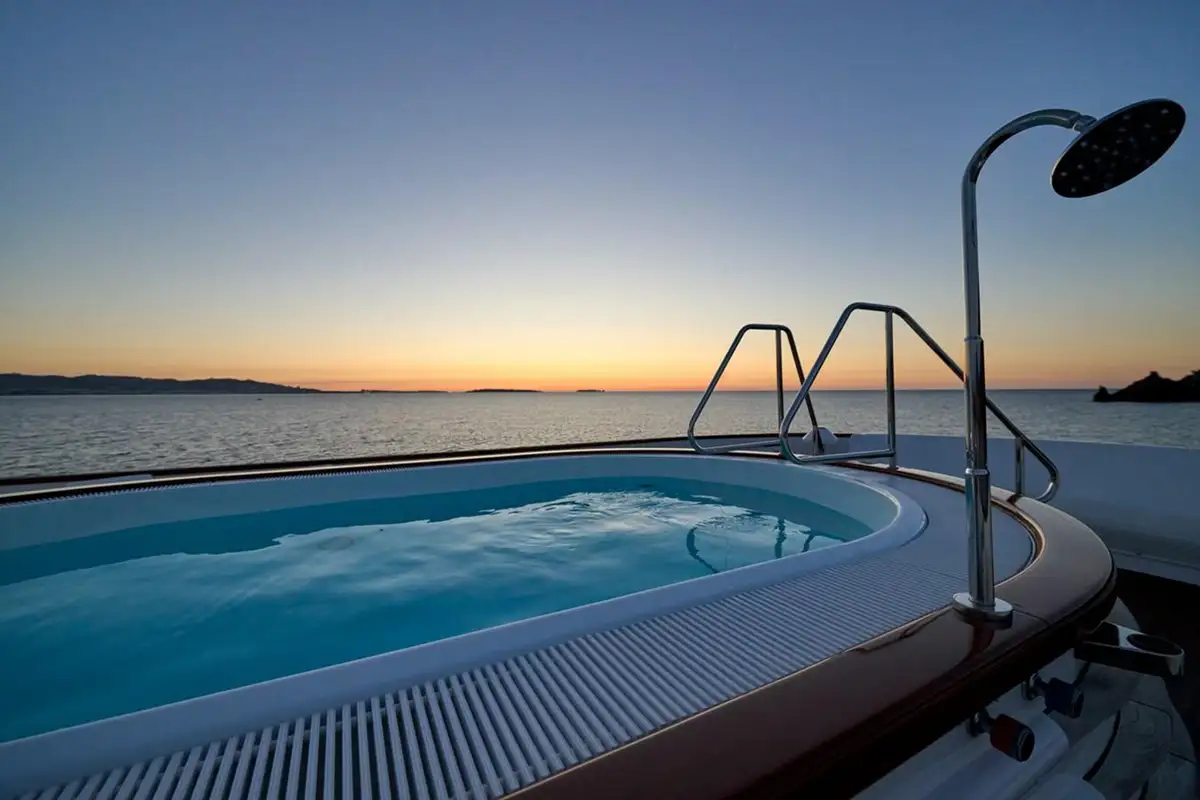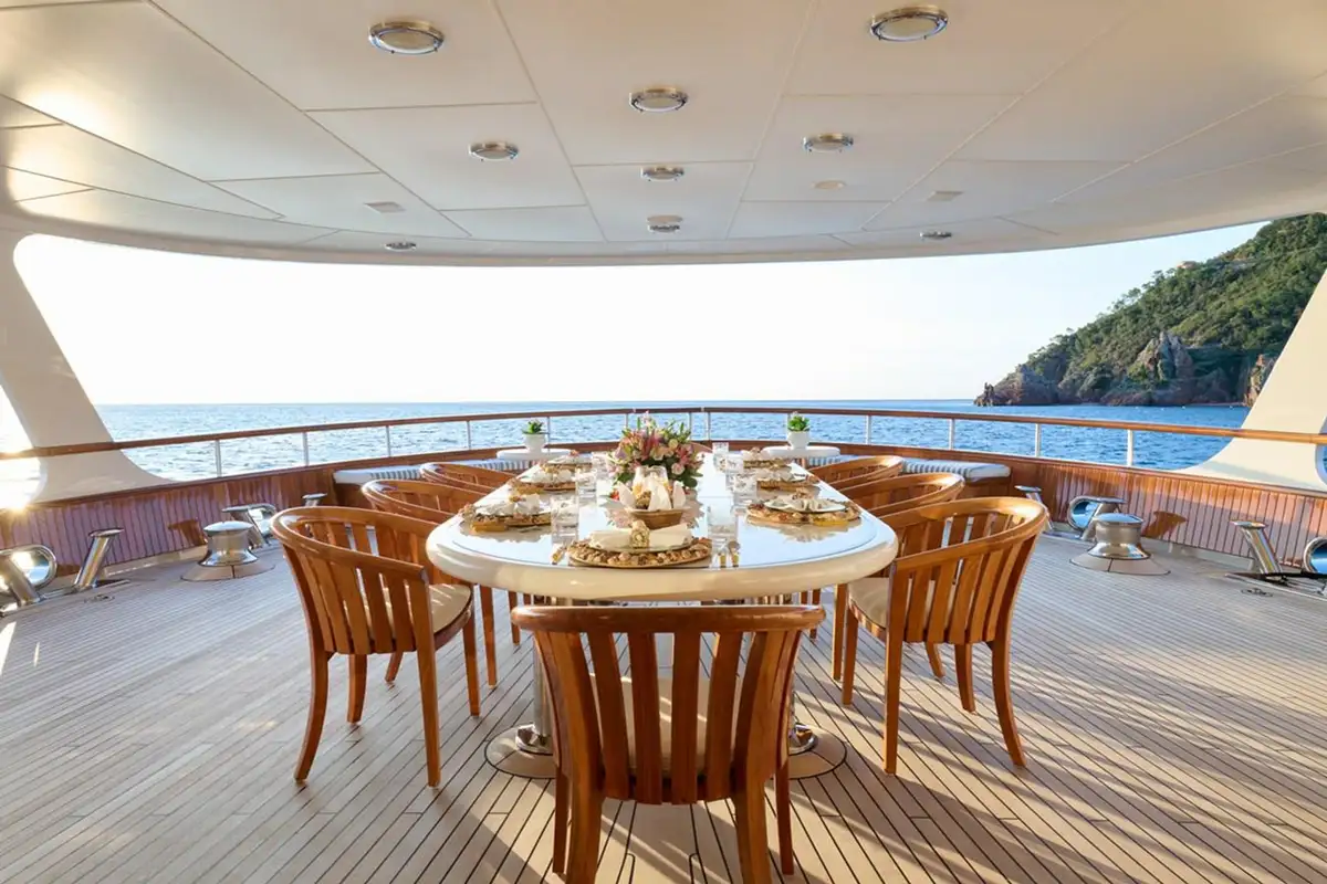 There’s a large, comfortable flybridge lounge at the forward end of her sundeck with commanding views over the seascape, and an elevated oval pool facing aft where you can float while sipping sundowners with a sweeping, panoramic view. The spacious open-air lounge on the upper aft deck is ideal for social gatherings or simply for relaxation. The main deck aft is a stunning outdoor dining space with perfectly framed views of the sea.