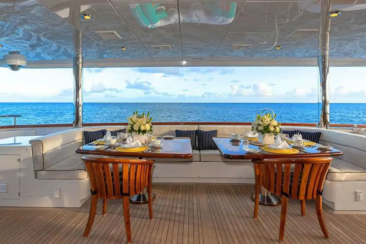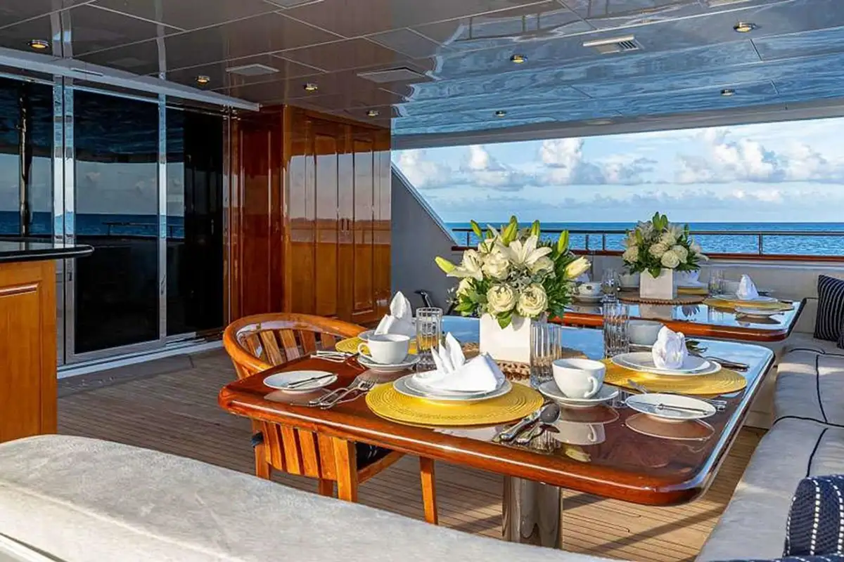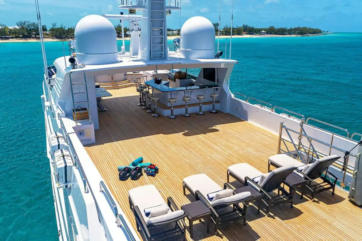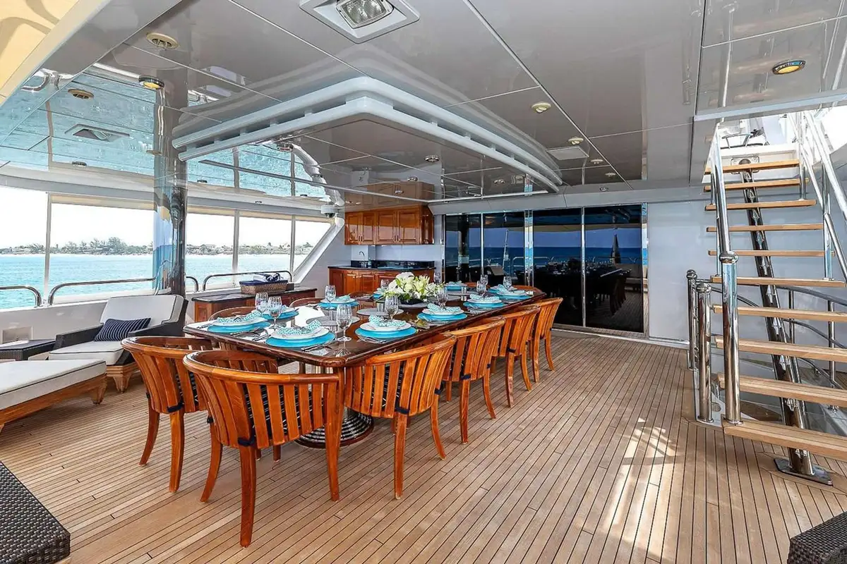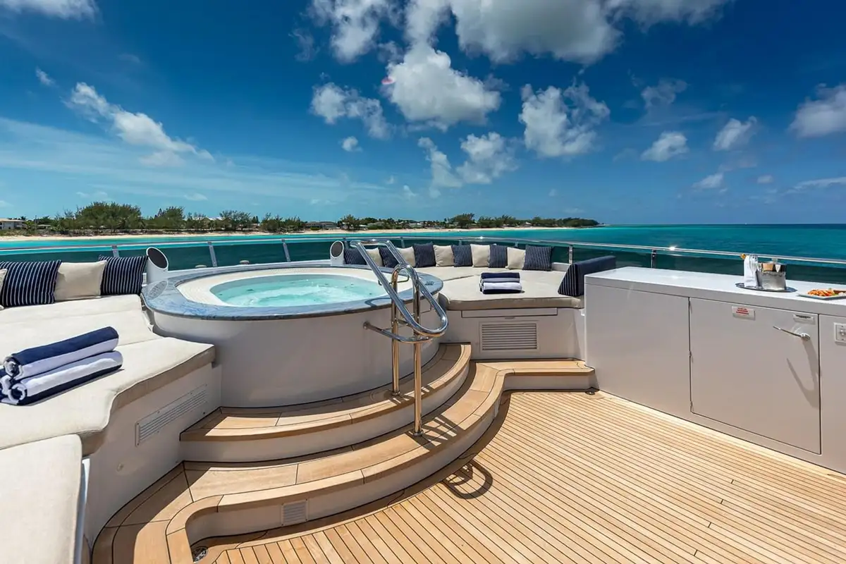Her spacious sun deck is perfect for relaxing and entertaining, featuring a large jacuzzi with surrounding sun pads, a wet bar with barstools, cocktail seating, and sunloungers aft. In addition, she offers al fresco dining options on two expansive decks below
