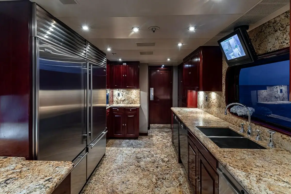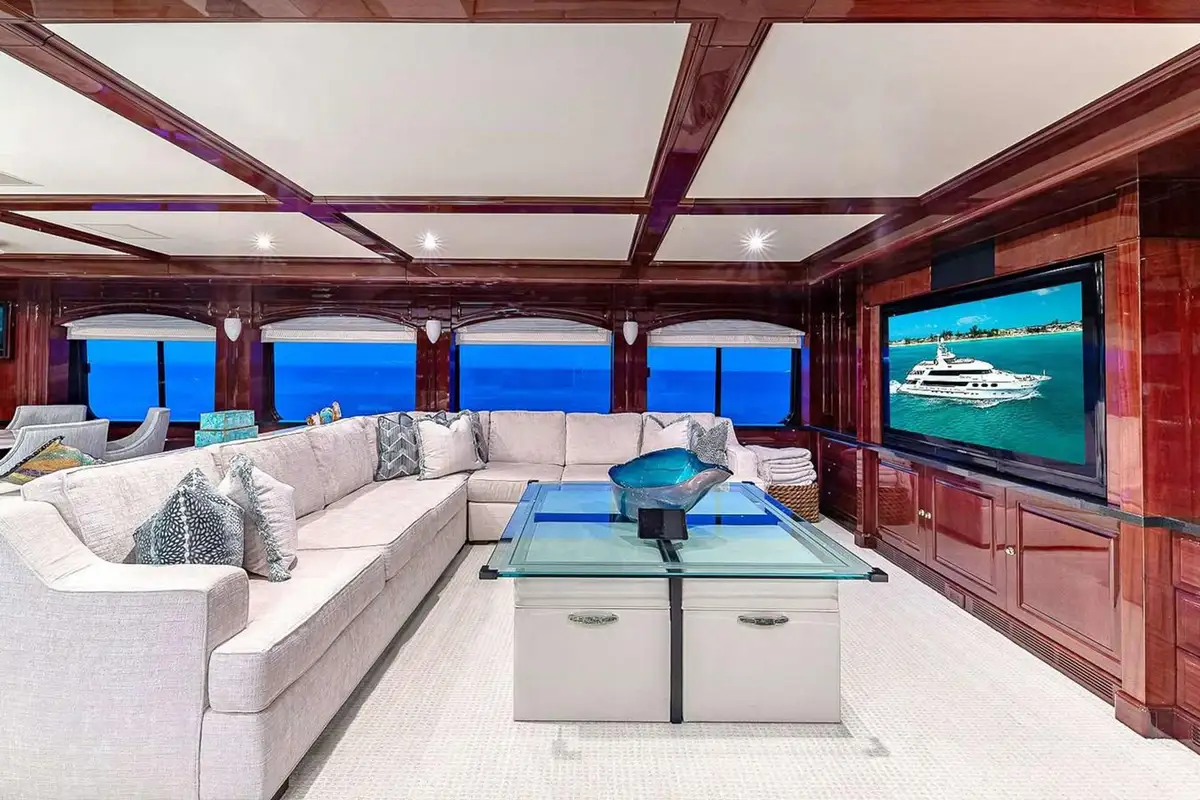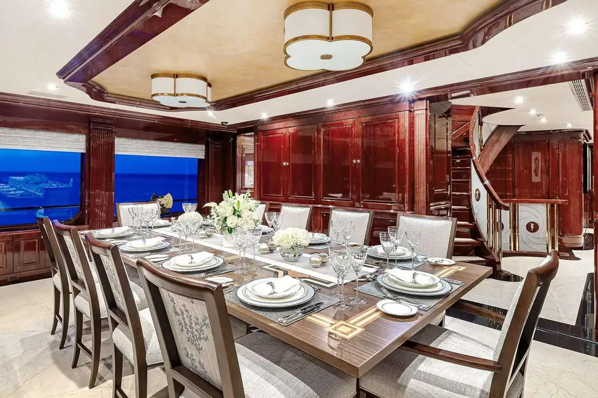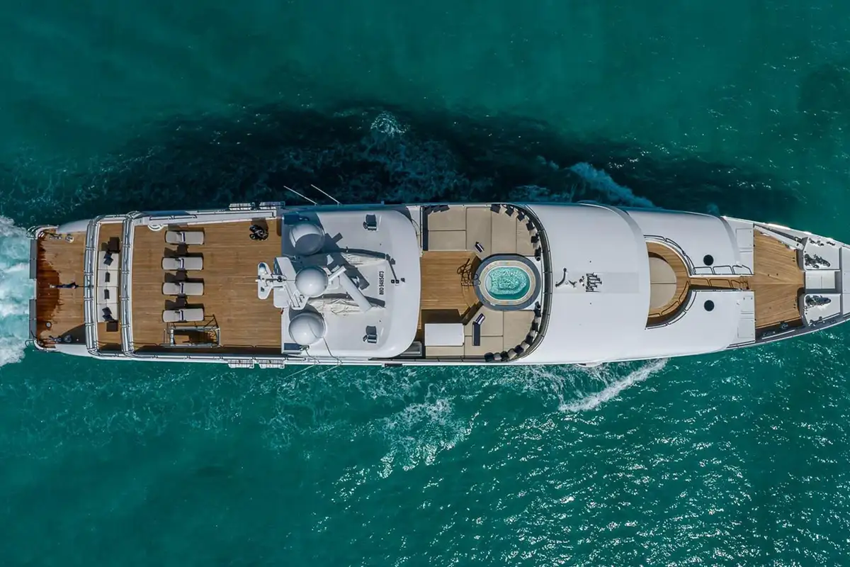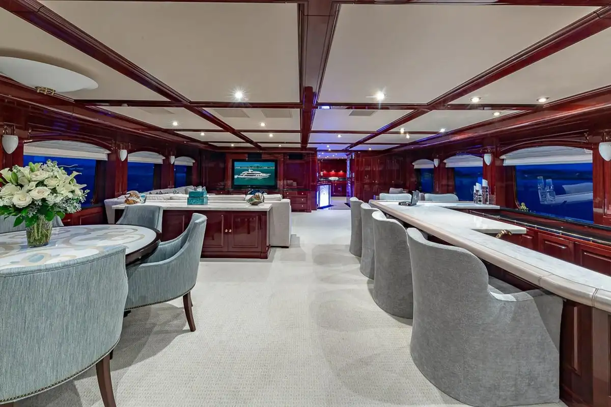 Her spacious sun deck is perfect for relaxing and entertaining, featuring a large jacuzzi with surrounding sun pads, a wet bar with barstools, cocktail seating, and sunloungers aft. In addition, she offers al fresco dining options on two expansive decks below
