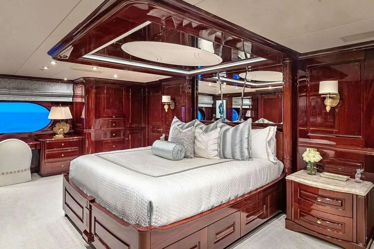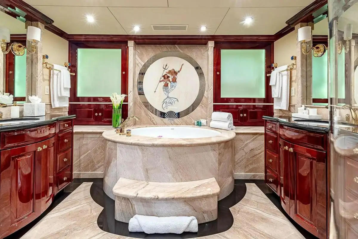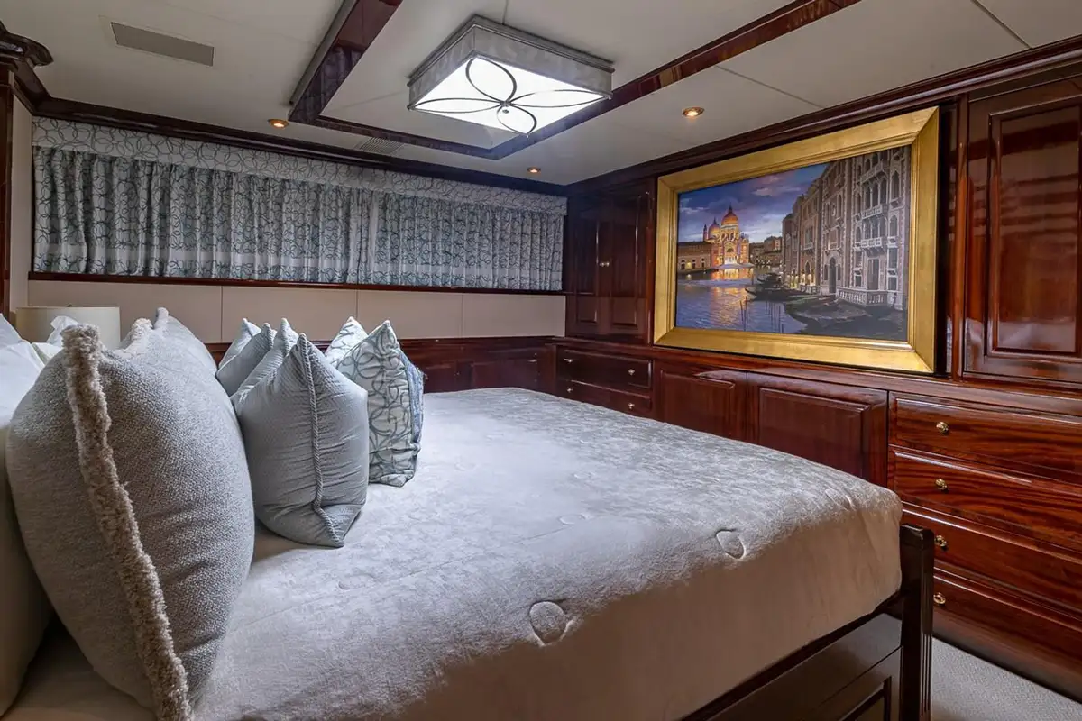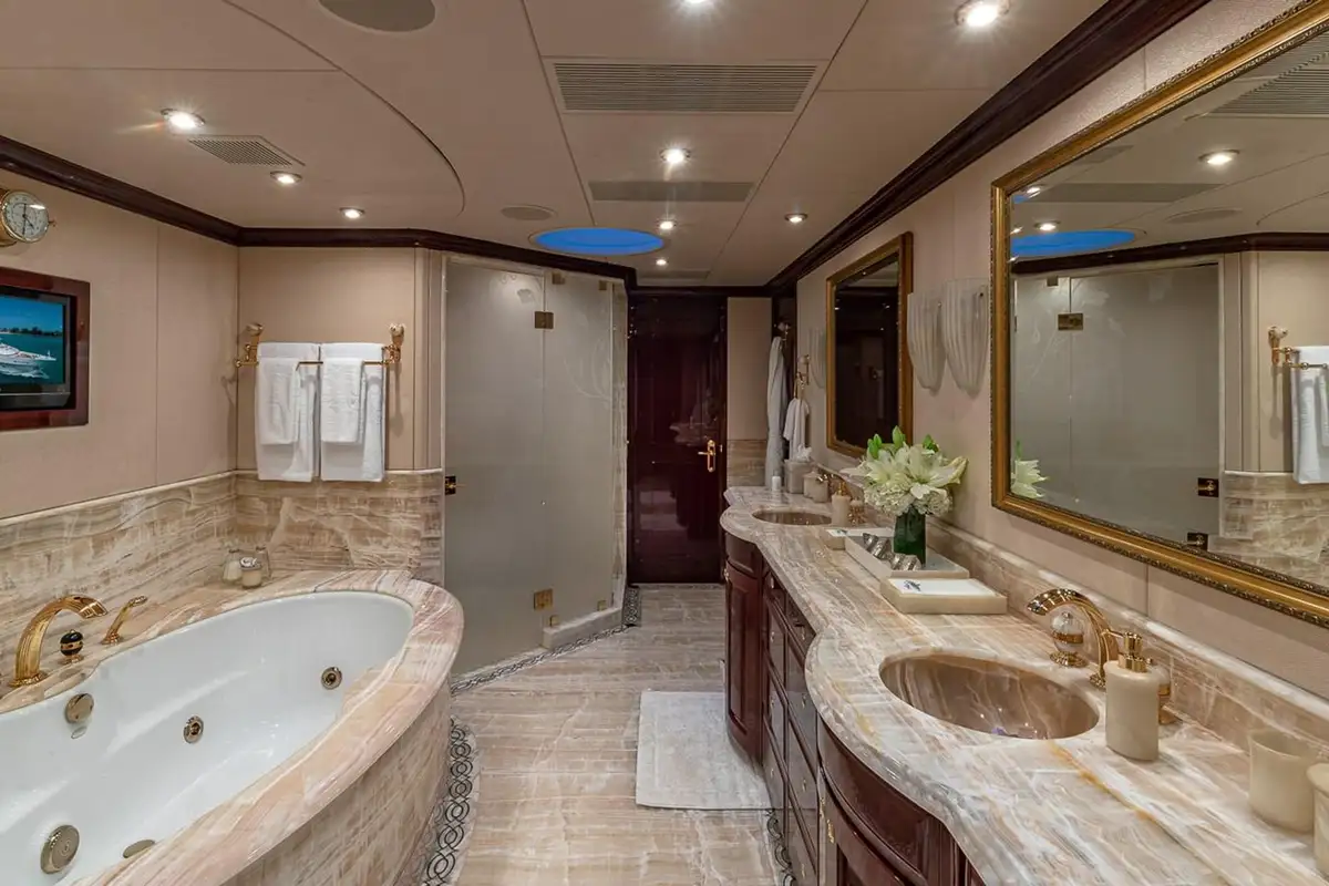 LADY ELAINE features beautifully outfitted accommodation for up to fifteen guests across six cabins. The full-beam master cabin features an office, a king berth, his and her bath with an oversized spa jacuzzi tub, and a sofa. The spacious VIP cabin offers a king berth and private en suite with a jacuzzi. There are two additional cabins with king berths, a double cabin, and a twin cabin with a pullman, all with private baths