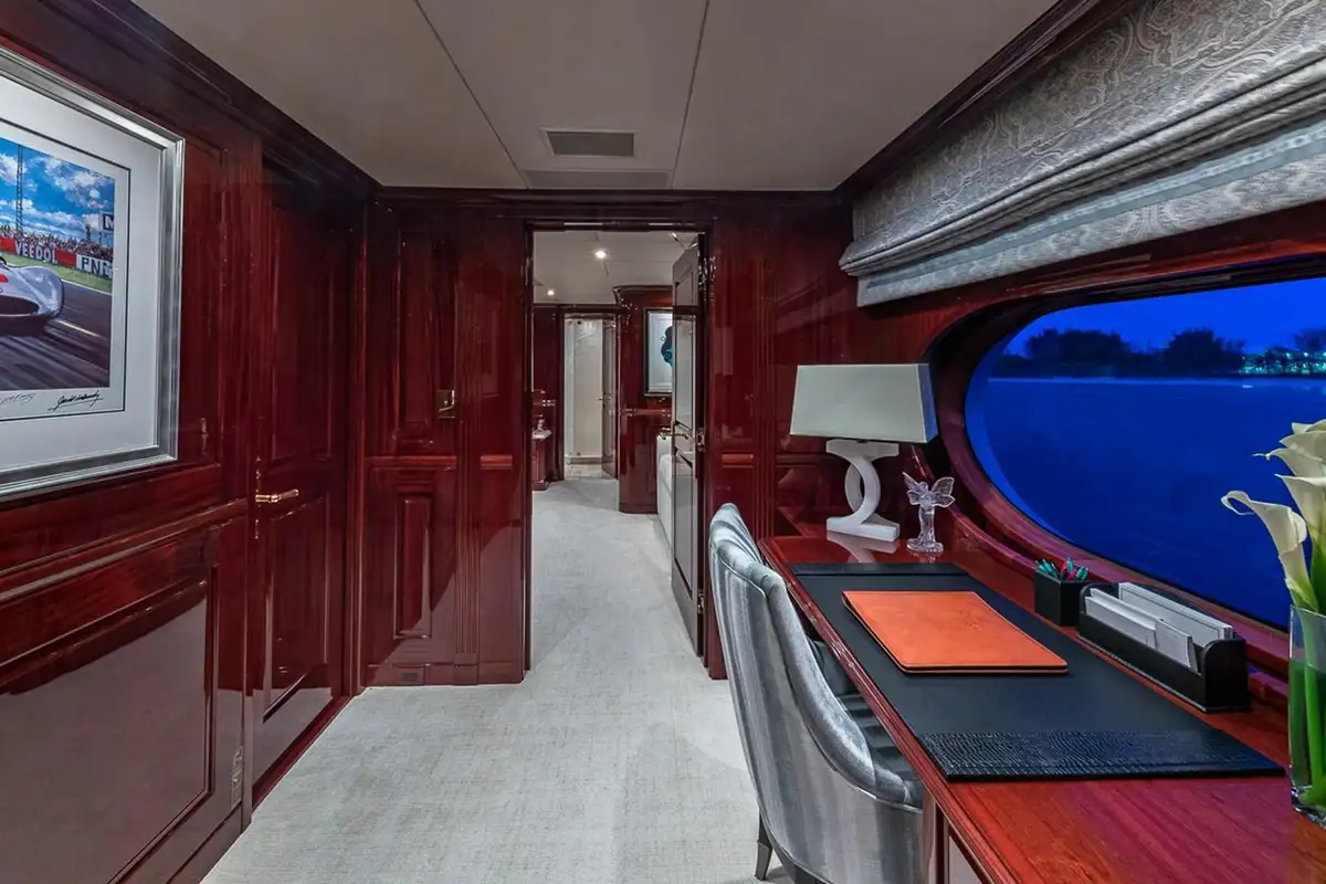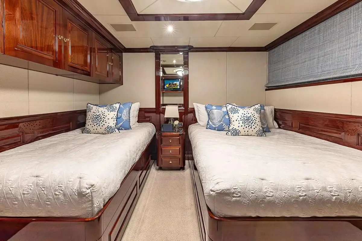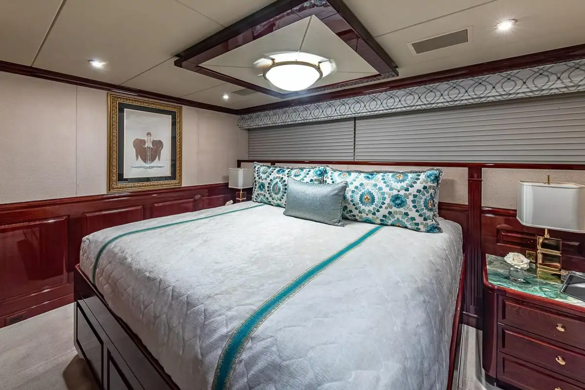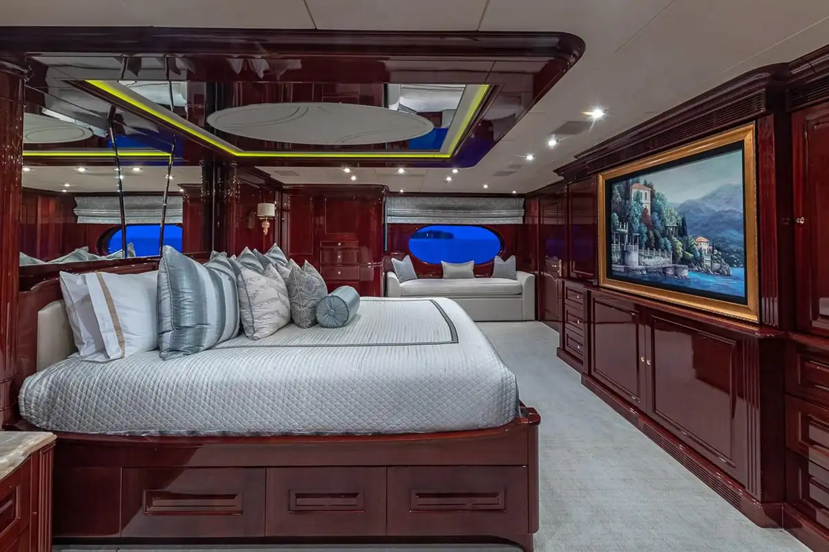 LADY ELAINE features beautifully outfitted accommodation for up to fifteen guests across six cabins. The full-beam master cabin features an office, a king berth, his and her bath with an oversized spa jacuzzi tub, and a sofa. The spacious VIP cabin offers a king berth and private en suite with a jacuzzi. There are two additional cabins with king berths, a double cabin, and a twin cabin with a pullman, all with private baths