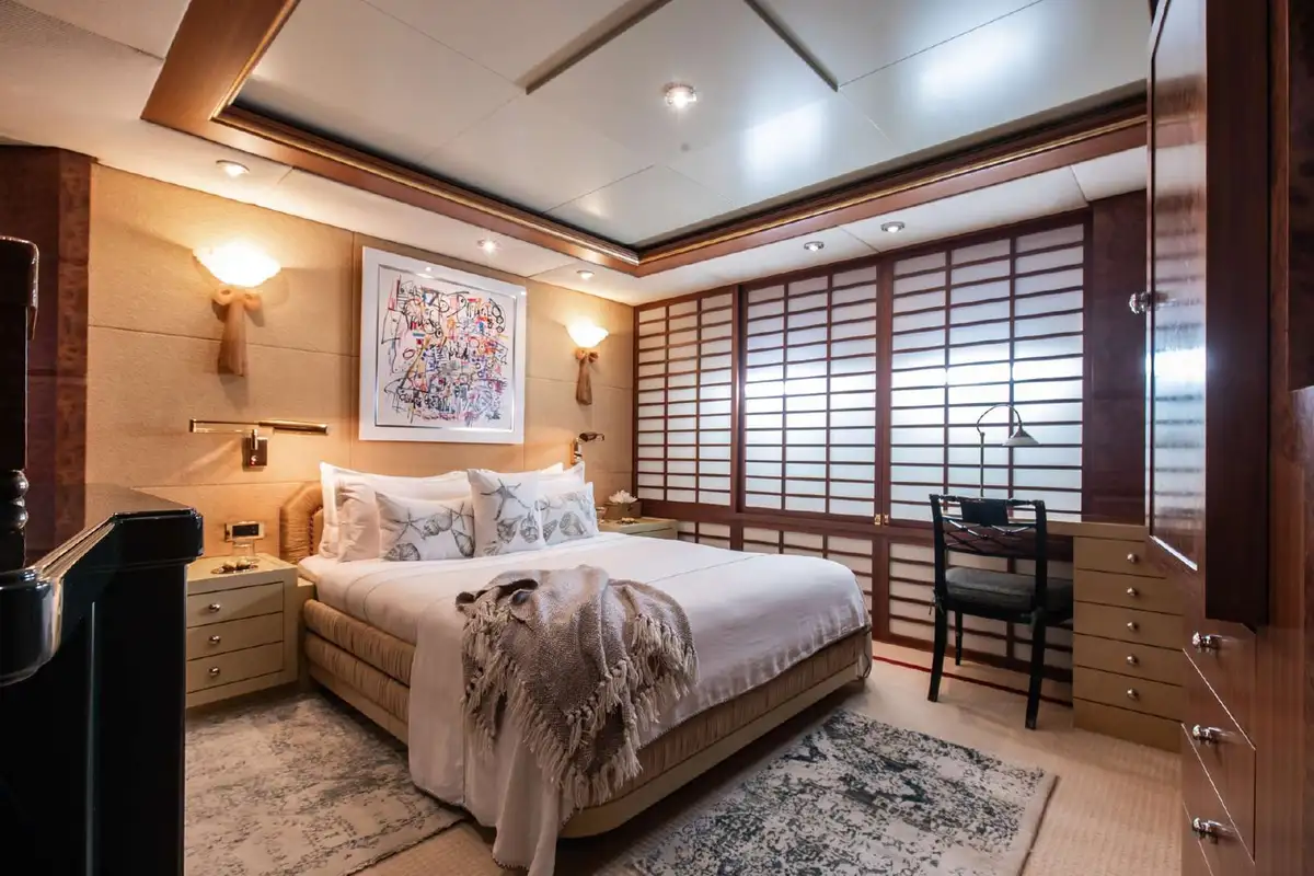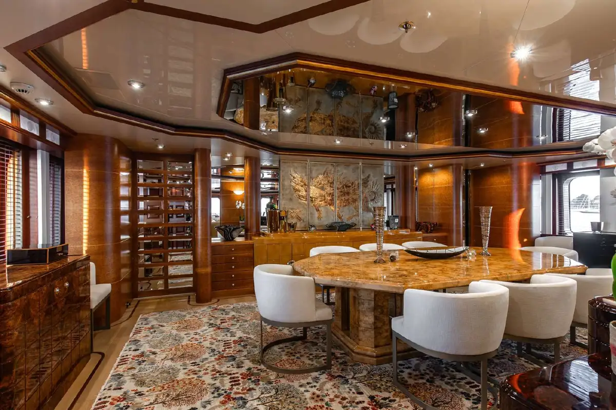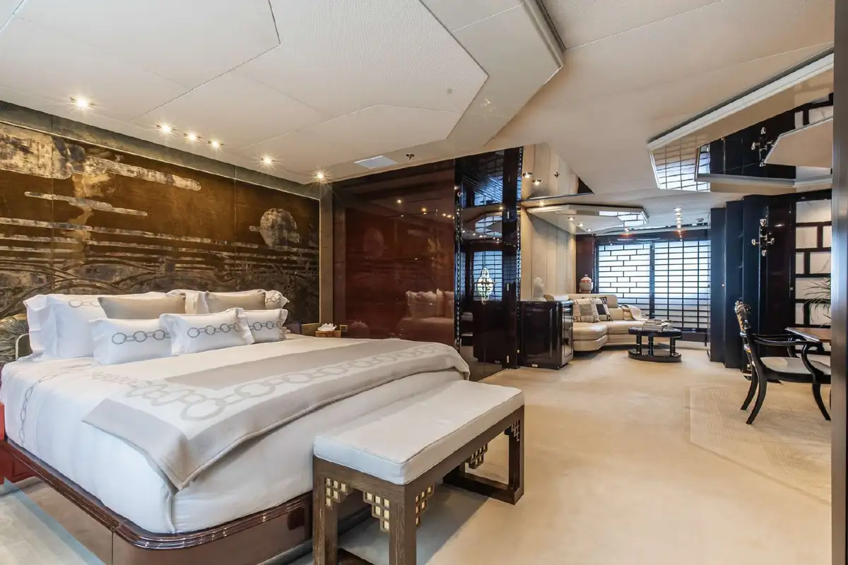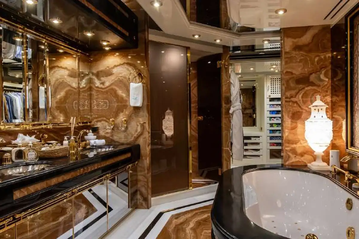LADY MARINA is tailored for both elegant entertaining and extended cruising, accommodating up to 15 guests in a flexible layout of nine cabins. The spacious owner’s suite, located on the main deck, features a private office, gym, spa, his-and-hers dressing rooms, and an adjoining guest cabin. The remaining guest accommodations are located on the lower deck, each with a private en suite.