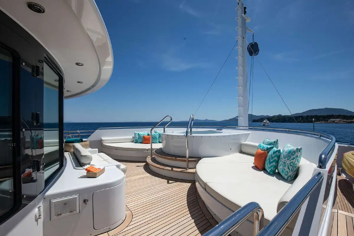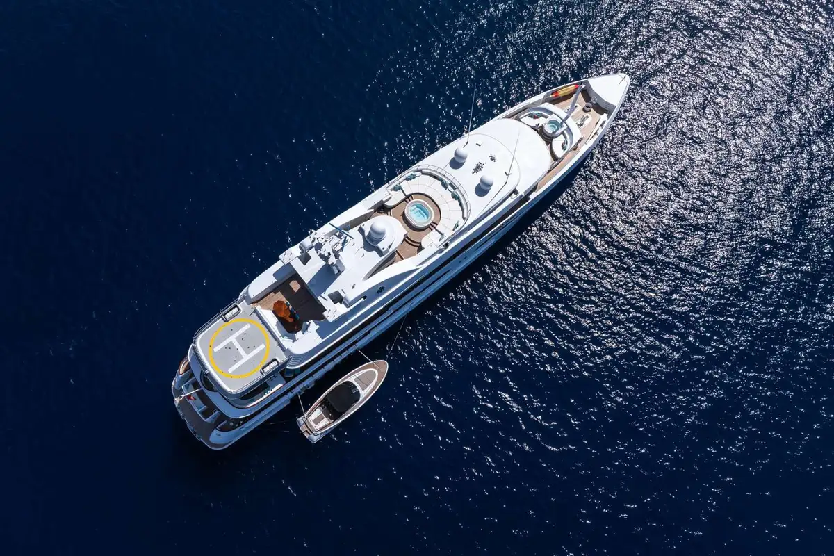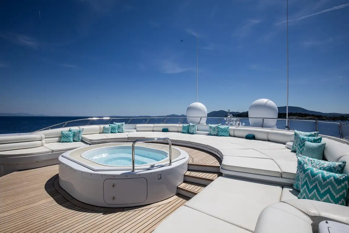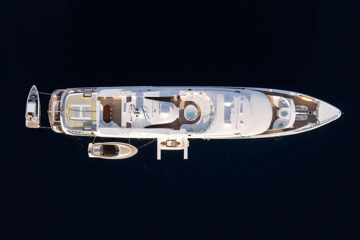 A full-service elevator connects all four decks, ensuring effortless movement throughout. The upper deck features a generous sky lounge aft and a unique forward-facing observation lounge offering uninterrupted 180-degree views. This leads out to a private terrace complete with a jacuzzi and sun loungers. The sun deck hosts an additional oversized jacuzzi and sunbathing area forward, complemented by an alfresco dining space and a certified helipad aft.