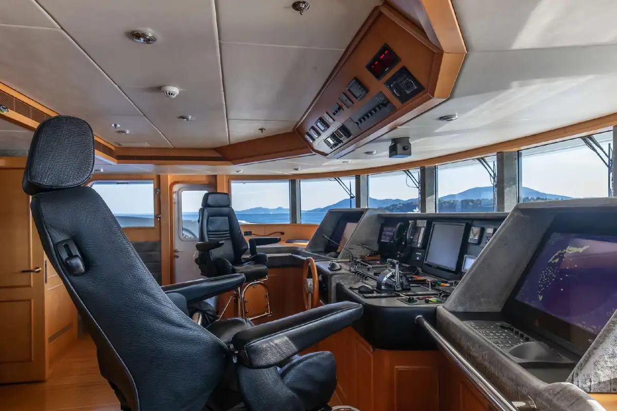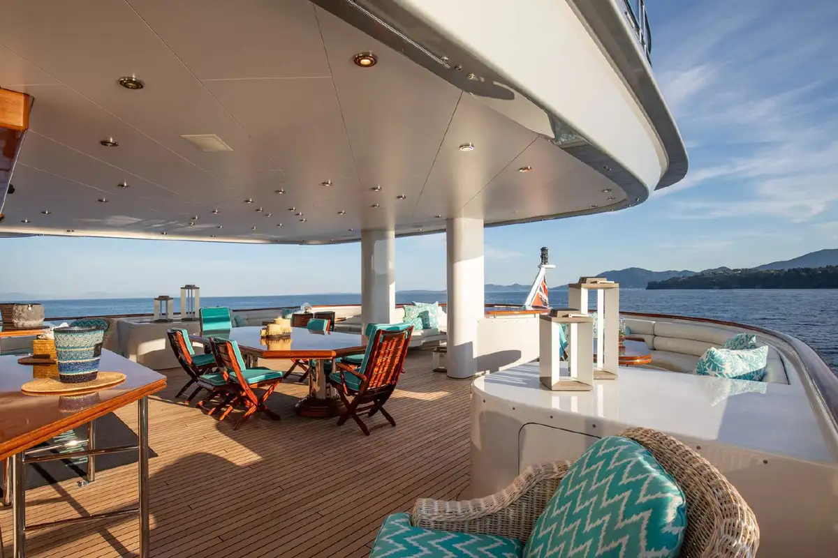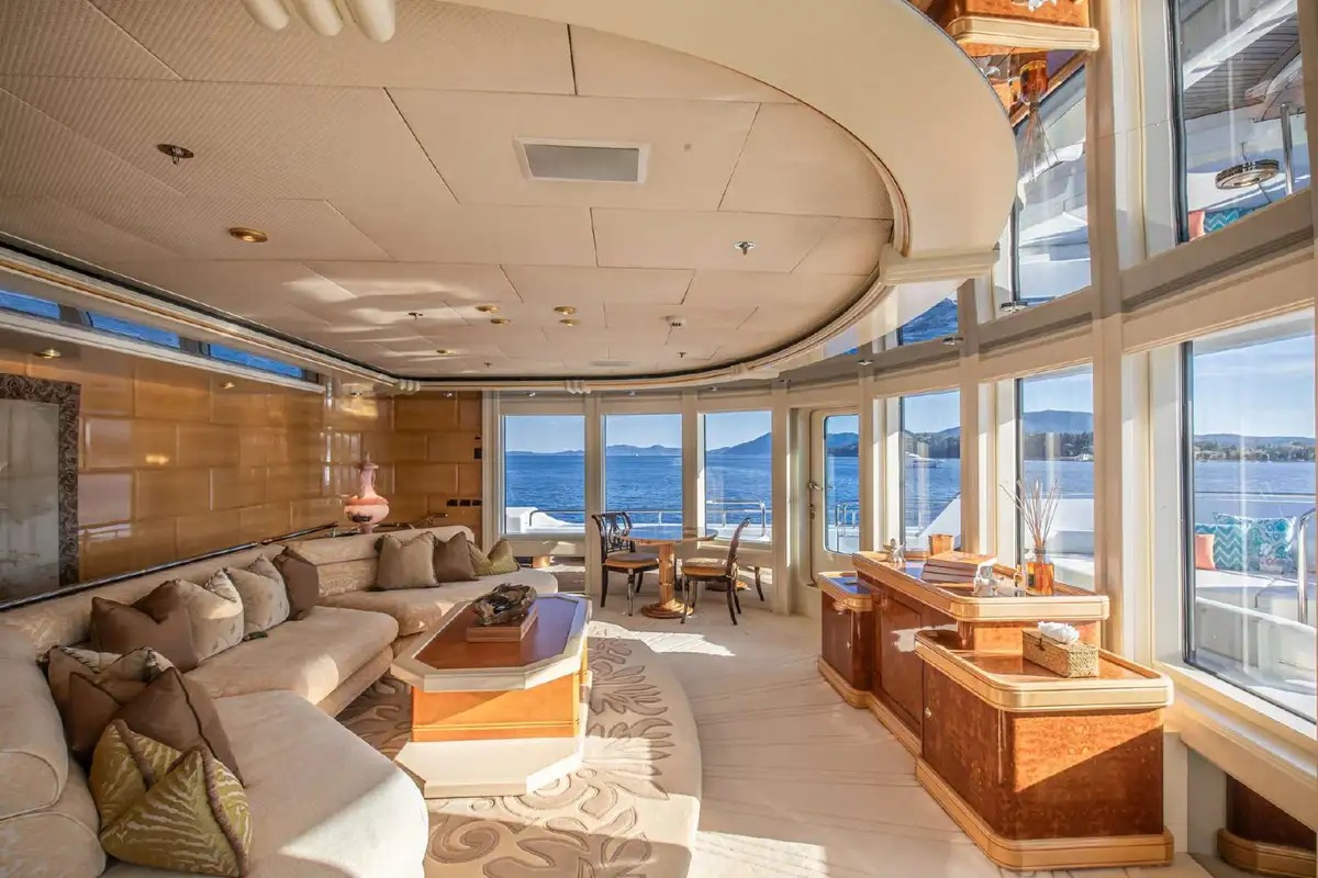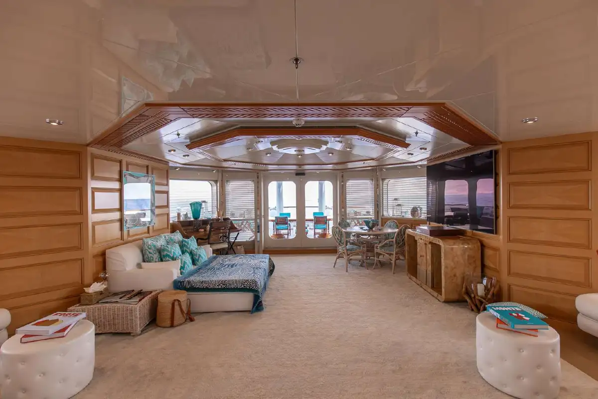 A full-service elevator connects all four decks, ensuring effortless movement throughout. The upper deck features a generous sky lounge aft and a unique forward-facing observation lounge offering uninterrupted 180-degree views. This leads out to a private terrace complete with a jacuzzi and sun loungers. The sun deck hosts an additional oversized jacuzzi and sunbathing area forward, complemented by an alfresco dining space and a certified helipad aft.