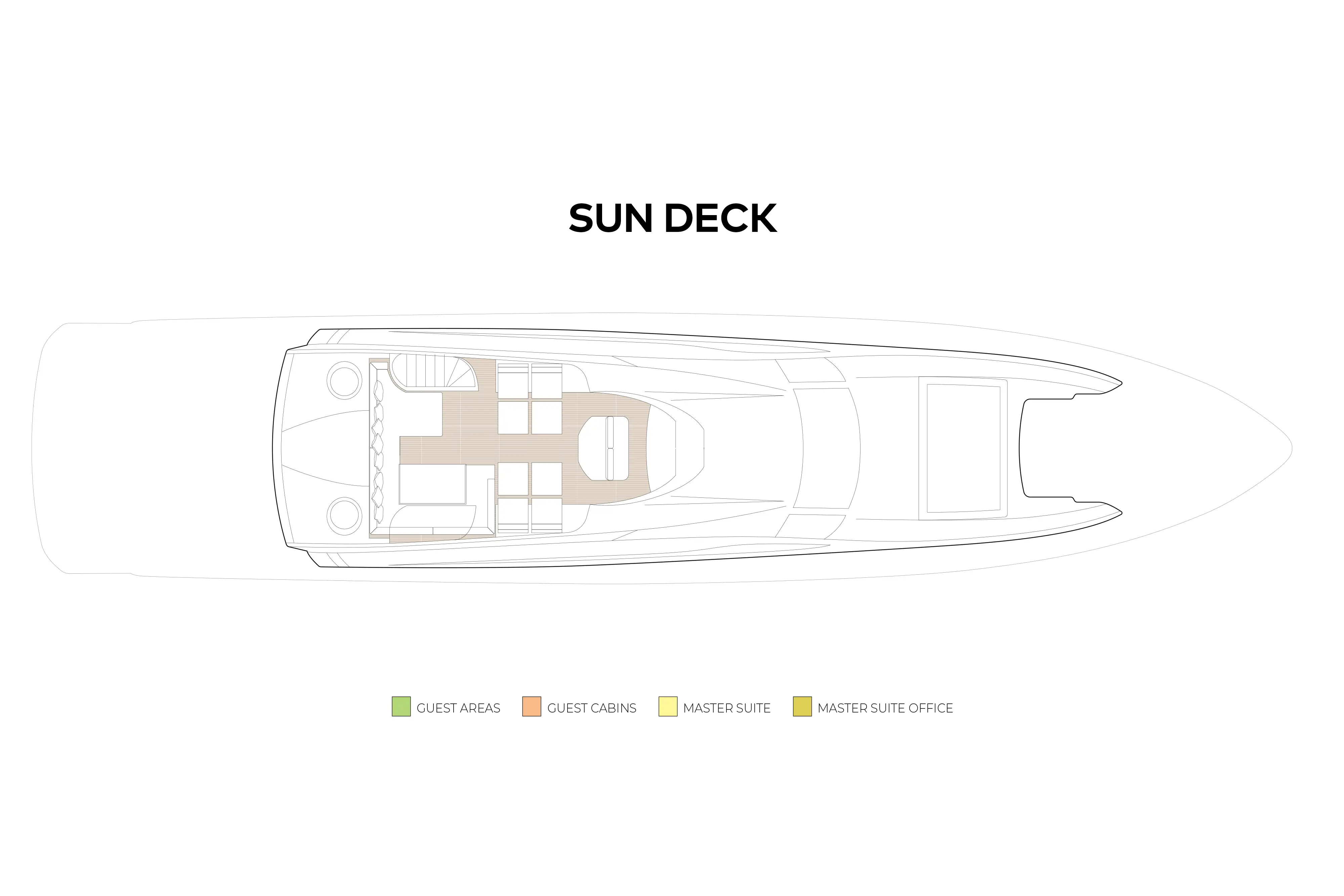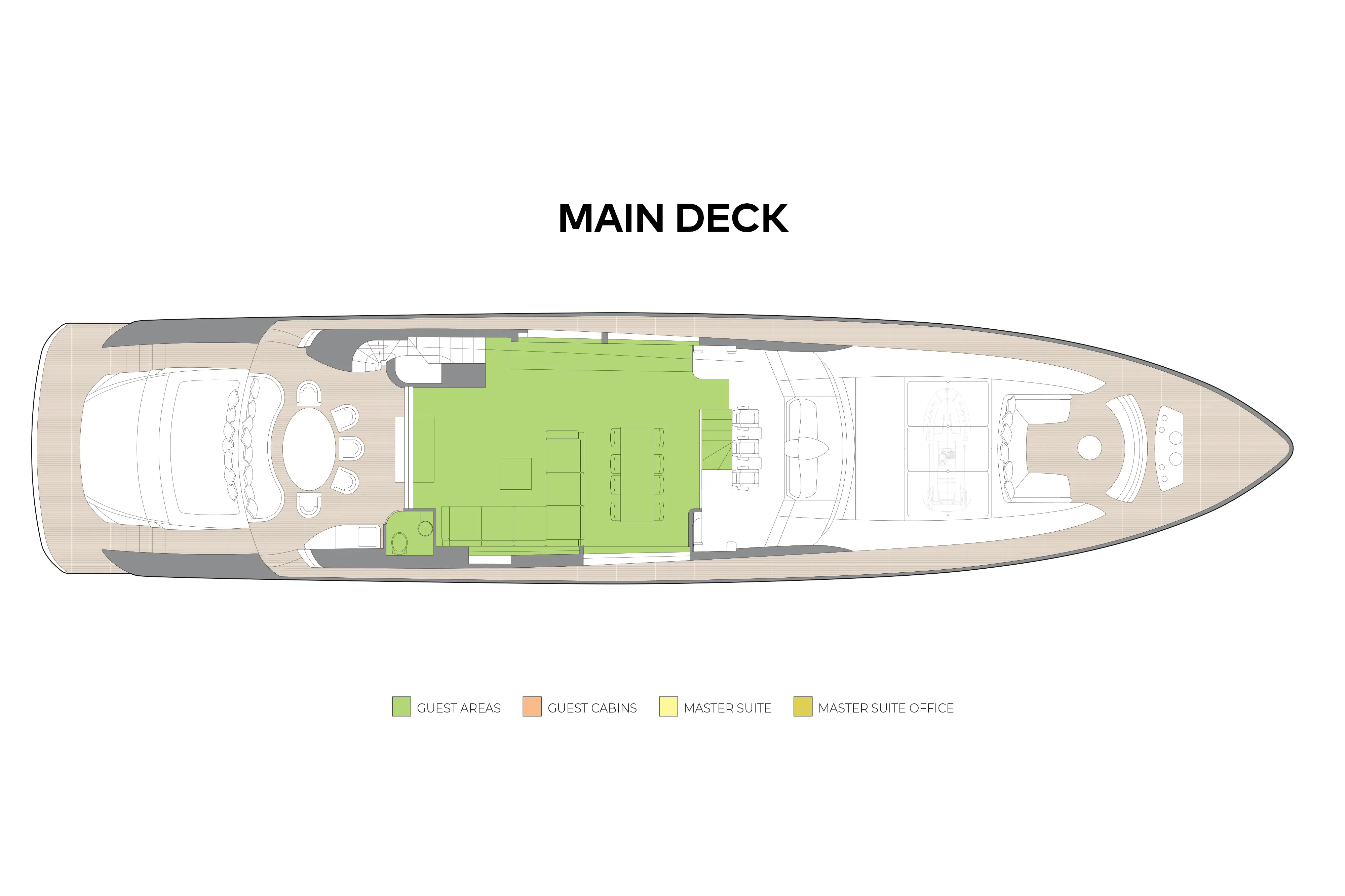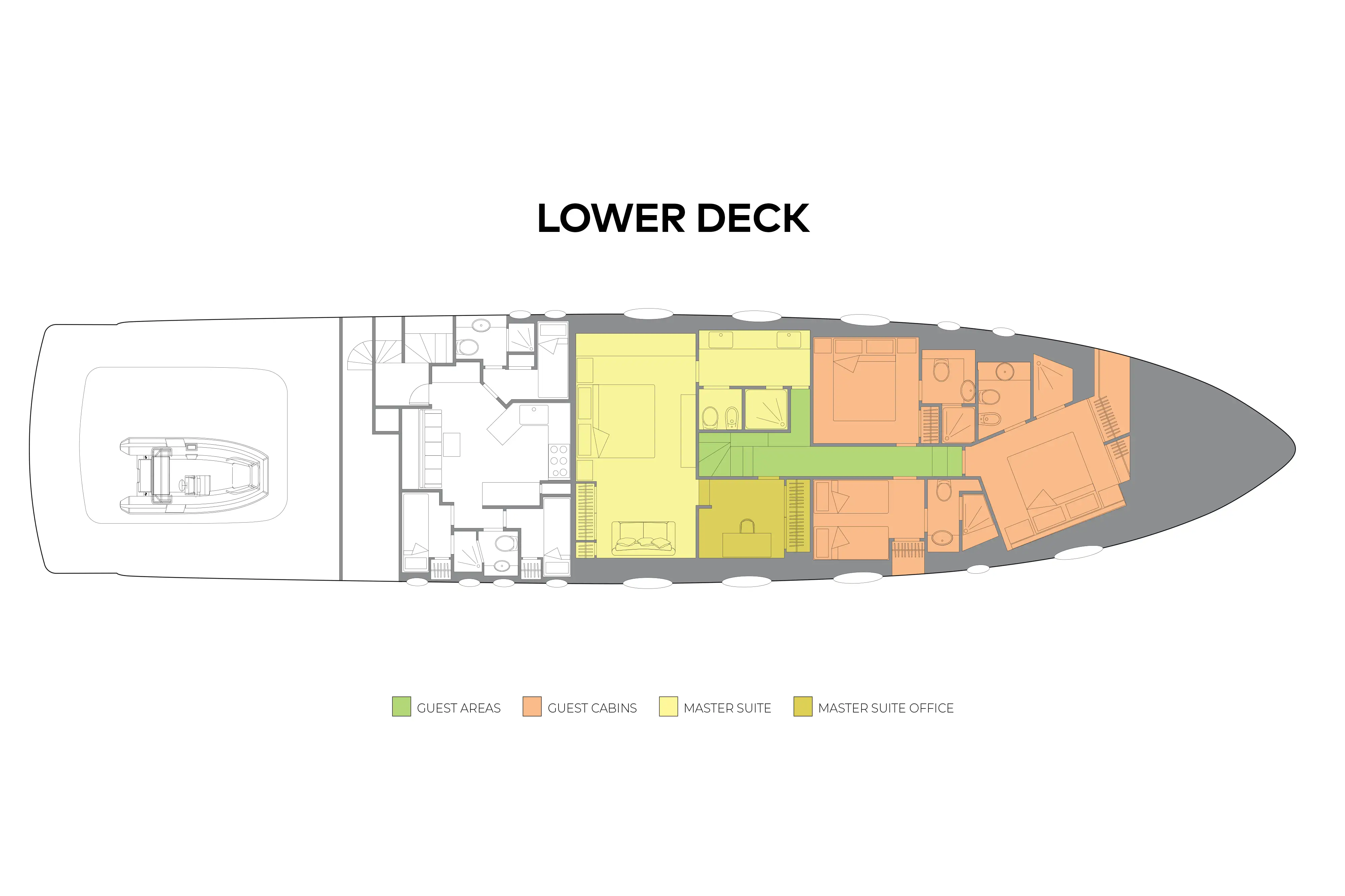 This yacht can accommodate eight guests in four cabins on the lower deck. Access via a staircase from the main deck lounge. On the right is the entrance to the spacious owner's suite, which is made up of an office area, full-beam cabin with a forward-facing bed and large en suite bathroom.
