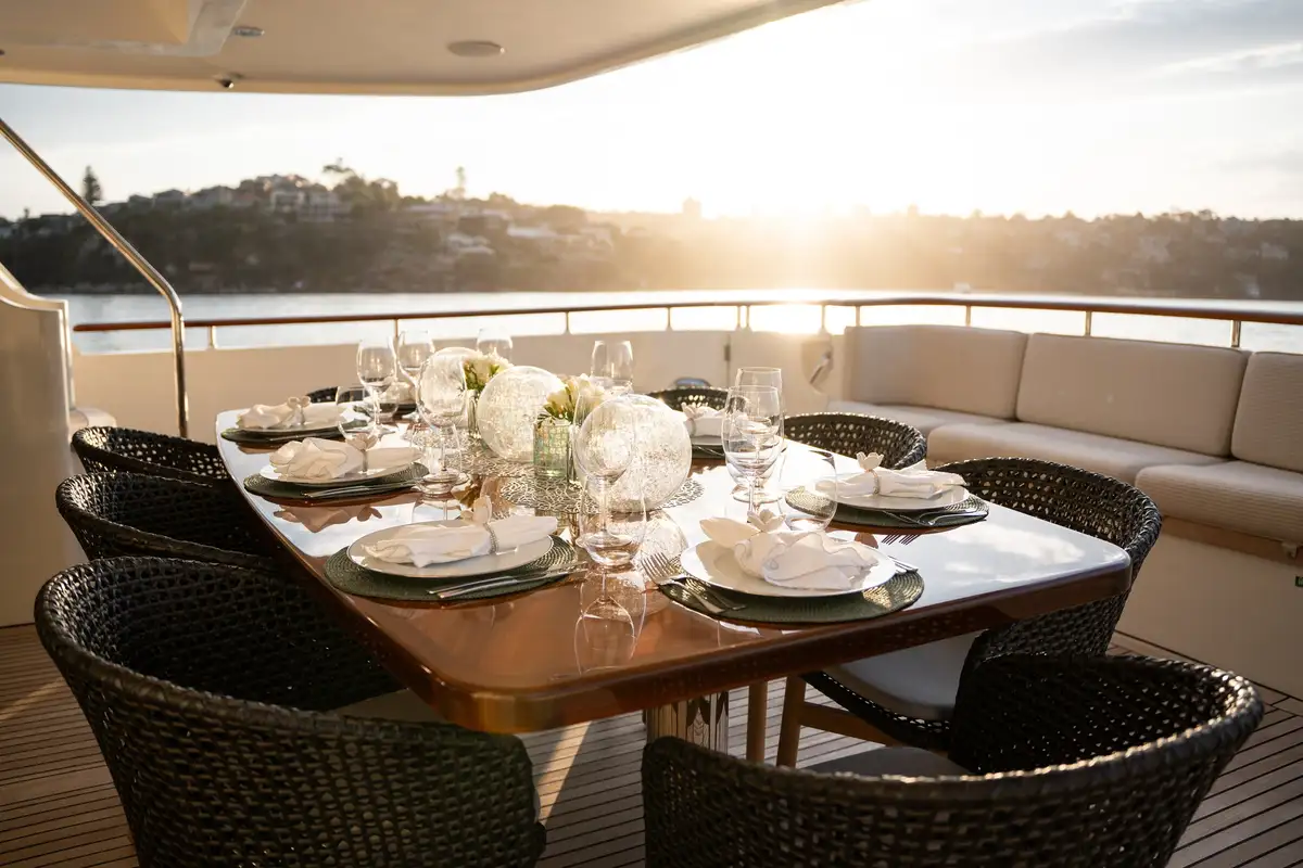 A standout feature on board LITTLE PERLE is her wide main deck lounge: a welcoming, light-filled space with plentiful comfortable seating and a large formal dining table, perfect for hosting guests in refined style.