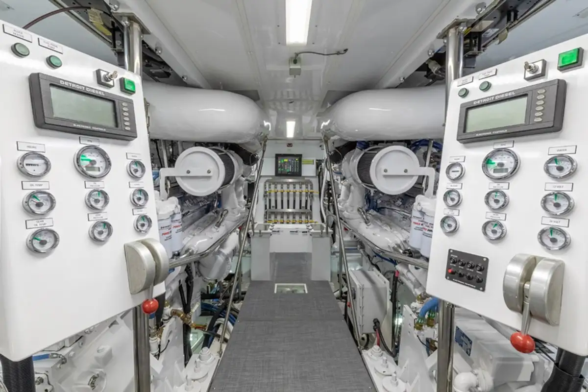 Propelled by 2,400hp twin Detroit Diesel 16V 149DDEC engines, she cruises at 14kts with a top speed of around 22kts.