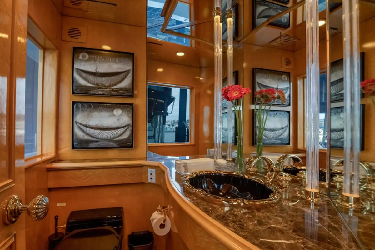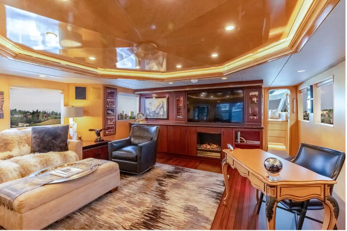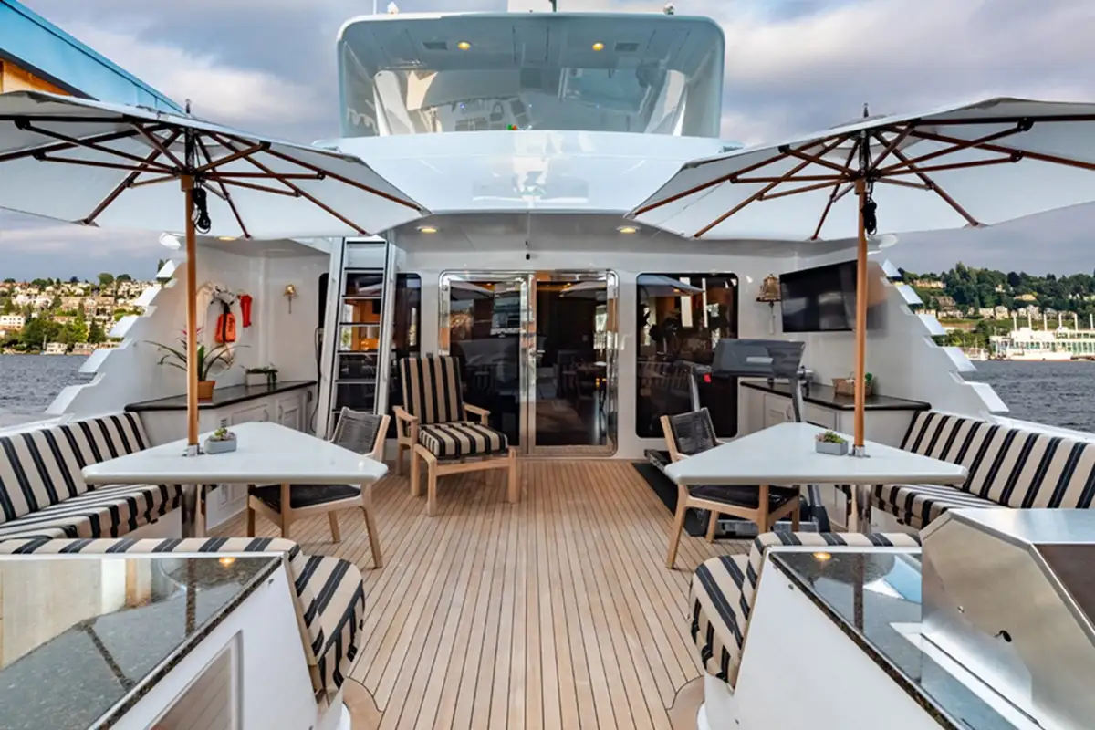 There’s an observation deck up top with a hot tub, a flybridge helm and a hardtop for shelter and shade, with a hydraulic stair lift for access. Down one level, there’s a snug full-beam skylounge behind the bridge, facing aft onto the spacious, open-air boat deck, which has plenty of sociable seating, a daylight-viewable outdoor TV, BBQ grill and davits to deploy her tender. The lower aft deck is fully shaded and set up for outdoor dining.