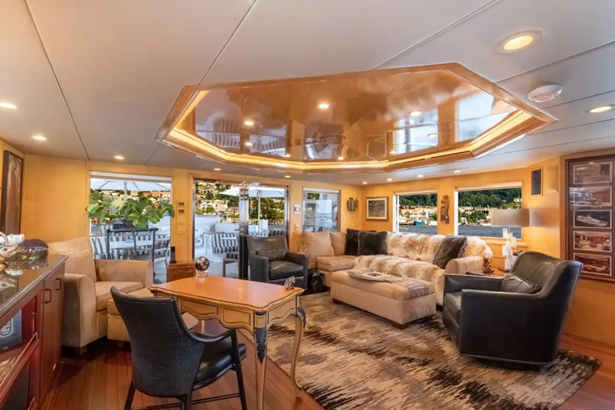 The open plan saloon is more than 40ft long with a marble-topped bar, built-in lounge seating, and a formal dining area. Large lateral windows let in lots of natural light.