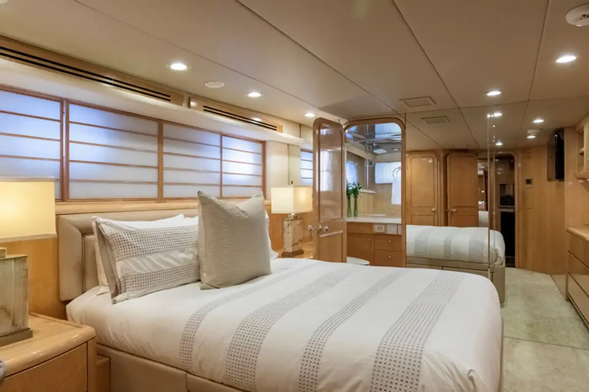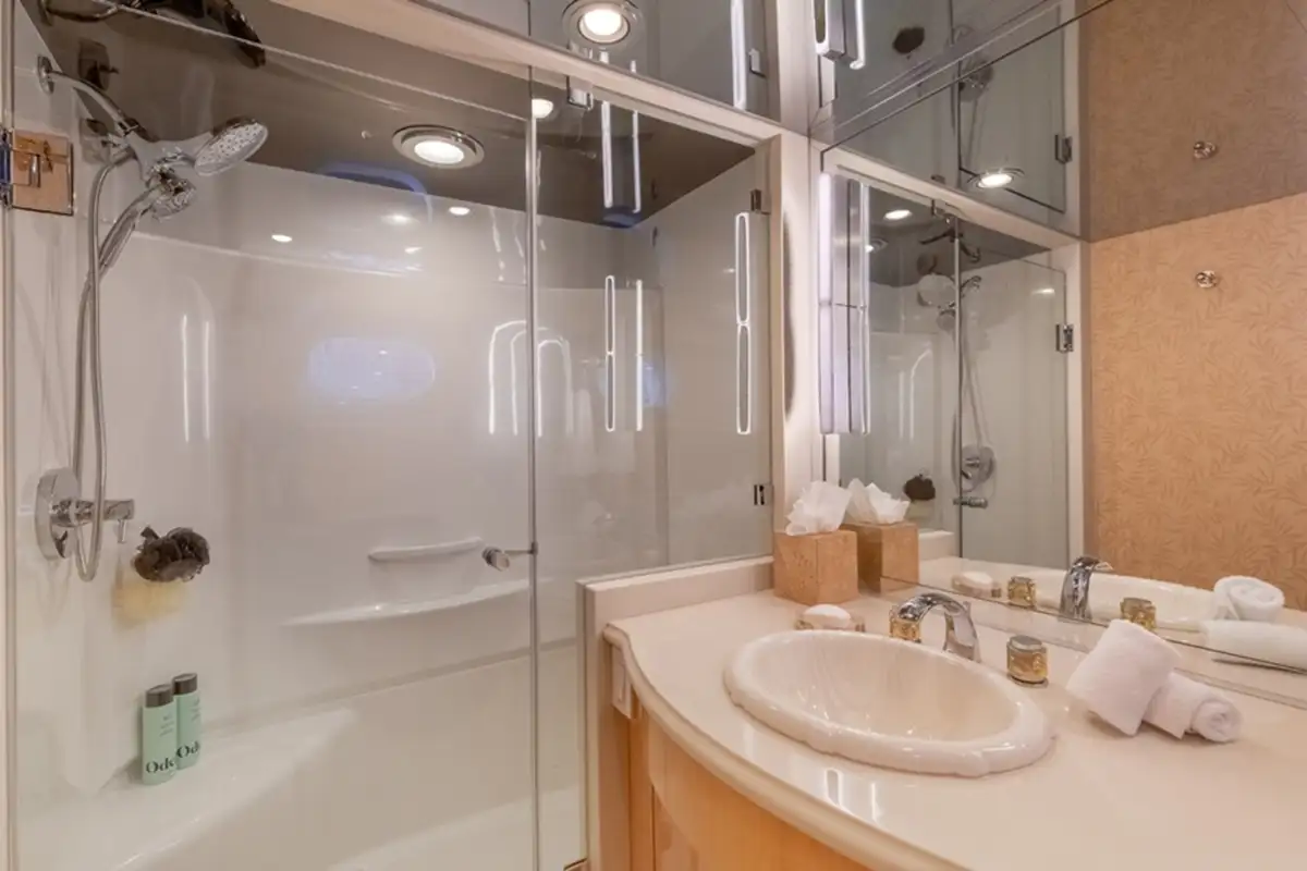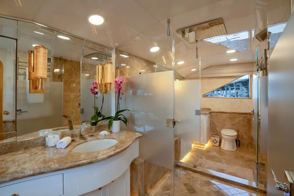• Updated full beam master cabin with his and hers en suite bathrooms connected by a glass shower