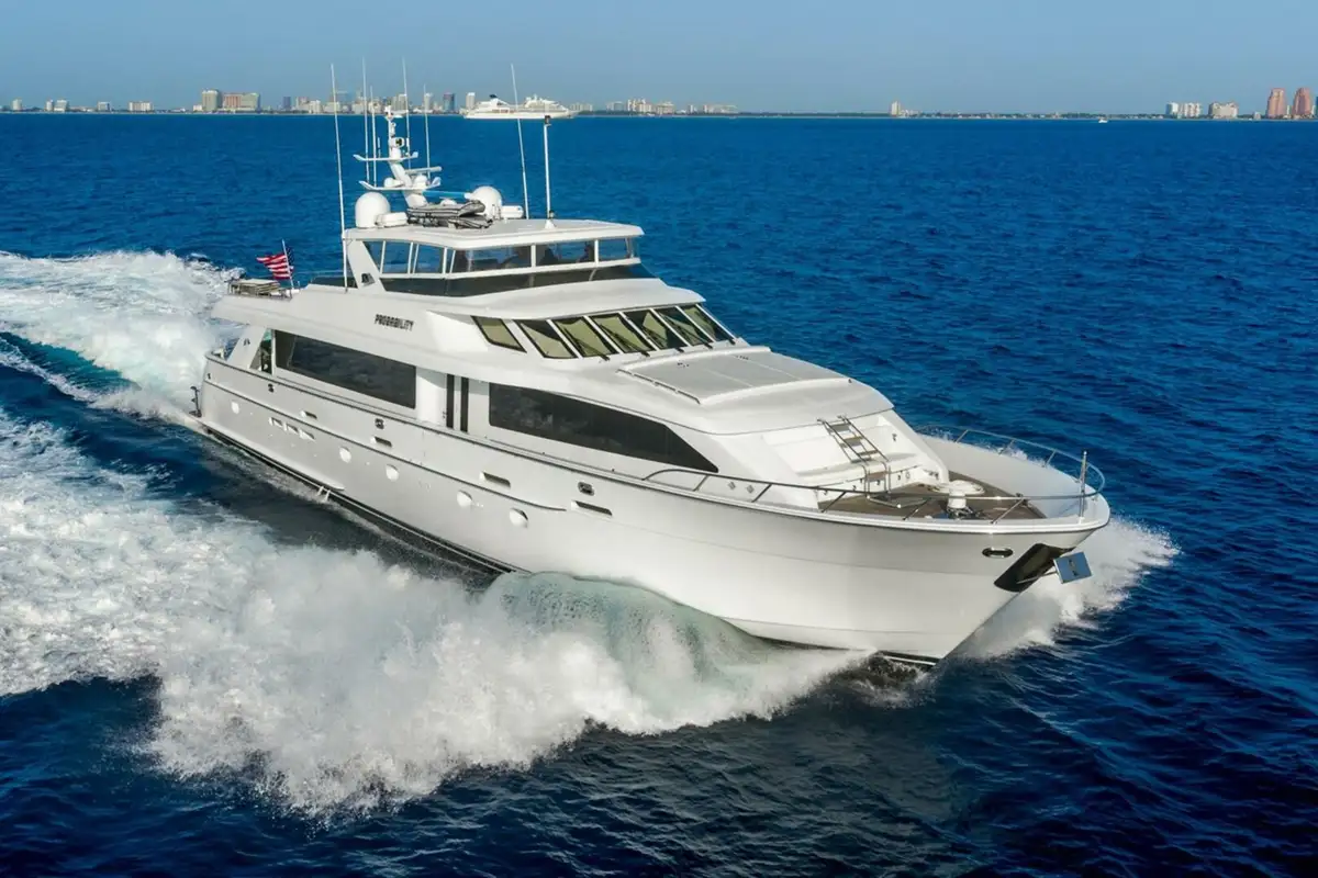 MAGIC, a 2005 Hatteras 100’ Motor Yachts, is a standout among the Elite Series, showcasing some of the finest customizations ever applied to a 100' Hatteras. Its interior features rich satin cherry wood, custom sketched-face doors and cabinets, along with elegant granite and honey onyx finishes.