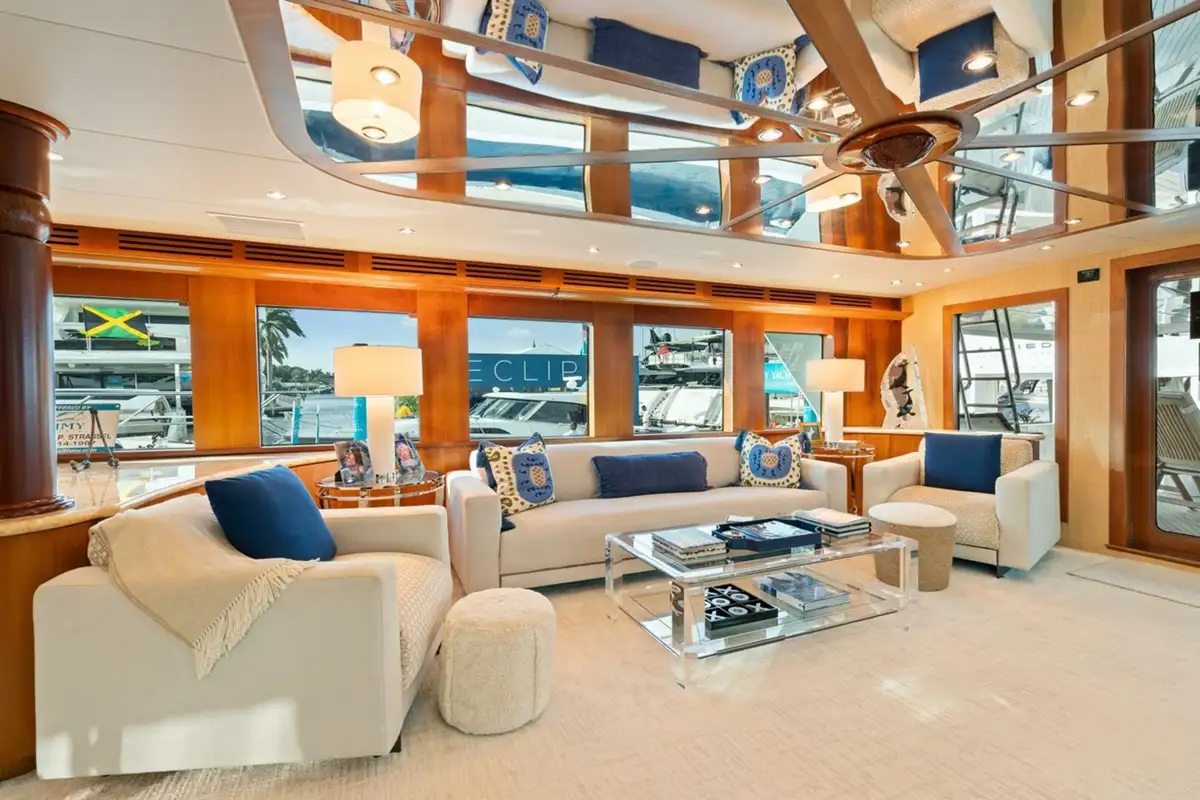 In 2020, this 100’ Hatteras Motor Yacht underwent an extensive $1.2 million refit, which included new interior soft goods, fabrics, LED lighting, and appliances. The main deck received new teak, along with updates to walk-arounds, the flybridge, and non-skid surfaces on the boat deck. Exterior furnishings, cushions, and canvas were also replaced. Furthermore, in 2022, new electronics and audio/visual equipment were installed, and various systems were updated or refurbished