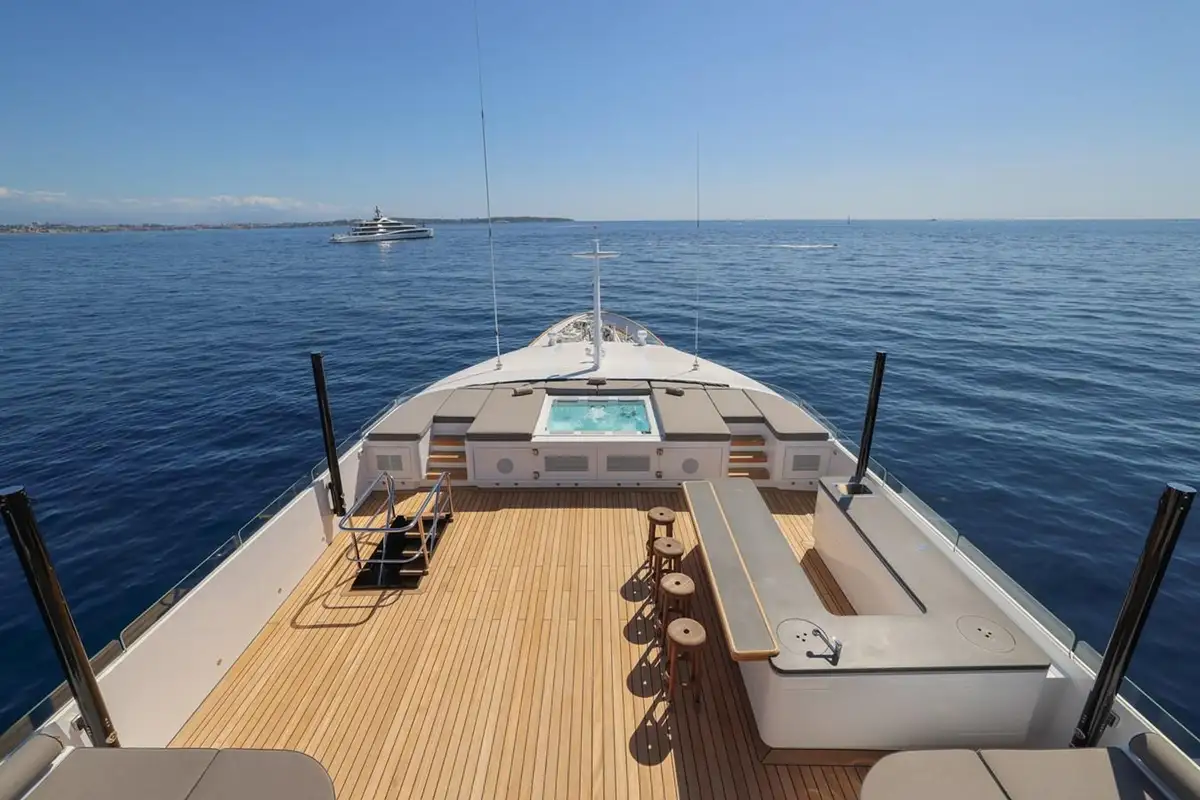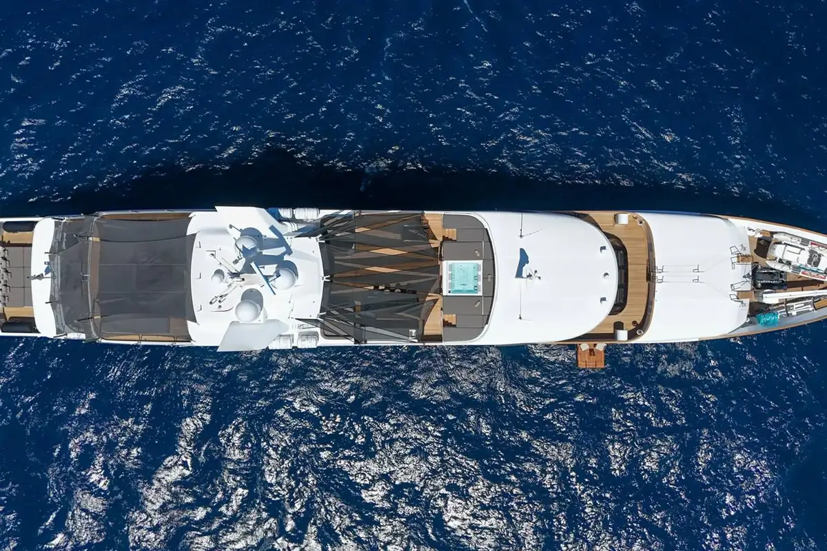 Her sun deck was widened by moving funnels outboard and covered by a new 35sqm (376.7sqft) hardtop. Teak decking was replaced, a Villery & Boch jacuzzi was installed along with a 25sqm (269.1sqft) fully equipped bar. A dayhead with shower was added, jetski deck cranes were removed and nightclub-standard lighting, smoke and sound systems were fitted.