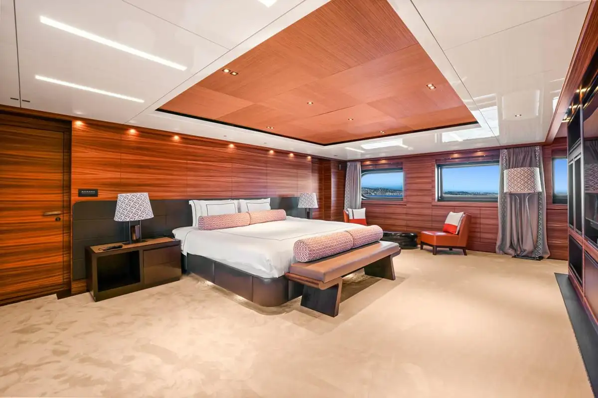 She welcomes 12 guests in six suites plus an additional luxury pullman berth in the owner’s office. On the main deck the owner’s suite is forward, with his-and-hers en suites and a large walk-in wardrobe, and the VIP suite is aft between the saloon and the owner’s office. The lower deck is home to two convertible suites and two further convertible suites on the bridge deck complete her versatile accommodation. She also sleeps 15 crew to ensure high service levels.