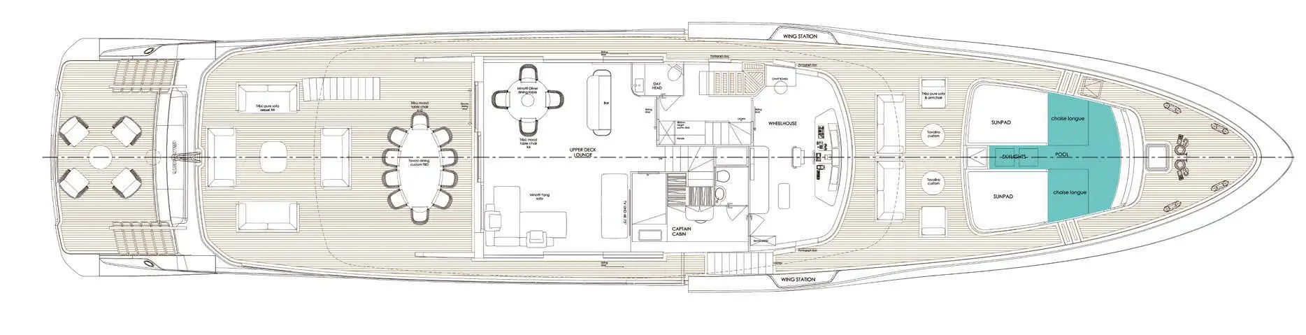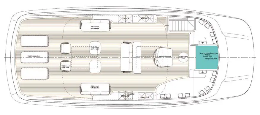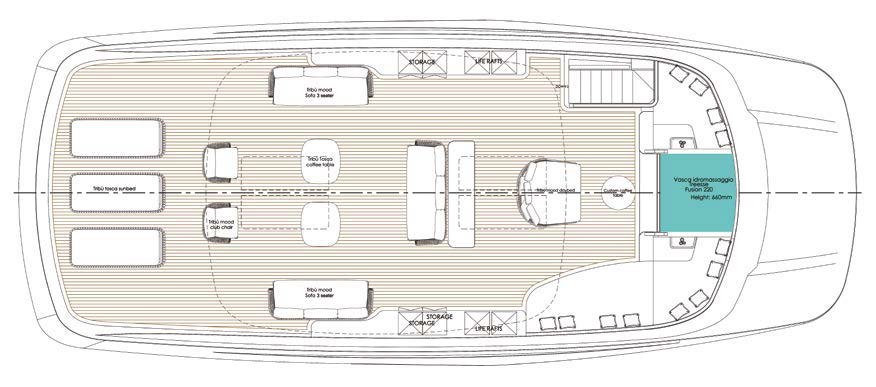 The sundeck has a glass jacuzzi pool up front, day beds, bar and lounge amidships under a hardtop, and open-air space for sun loungers aft. The upper deck level has full walk-around decks linking the outdoor guest zones fore and aft. The Portuguese bridge on the forward coachroof has built-in seats and sunpads as well as the pool, while the aft deck features a dining area under the sundeck overhang and open-air lounge aft. The main deck aft cockpit is a partially shaded lounge with companionways running forward outside the saloon to amidships.
