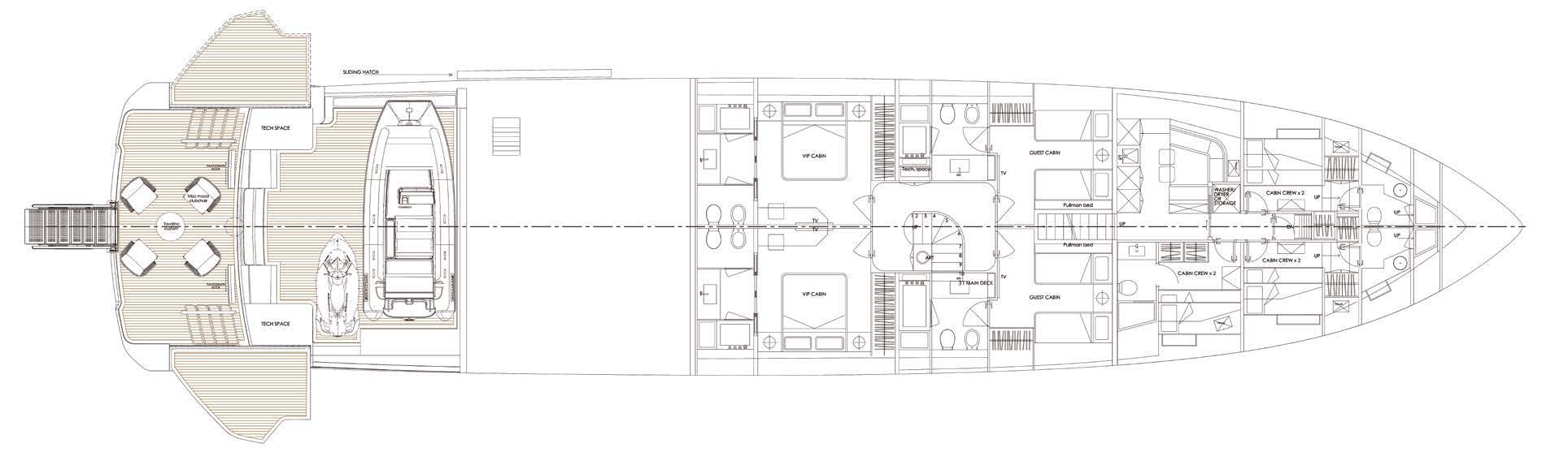 The full-beam owner’s suite is up front on the main deck with a huge walk-in wardrobe, vanity or study area, spacious bathroom and pop-out balcony. Two VIP doubles and two twin cabins are amidships on the lower deck.