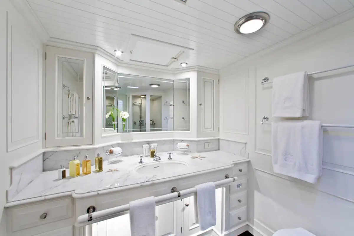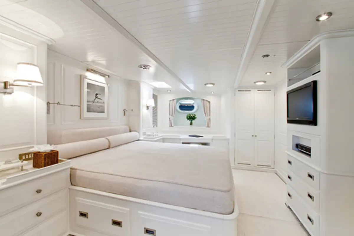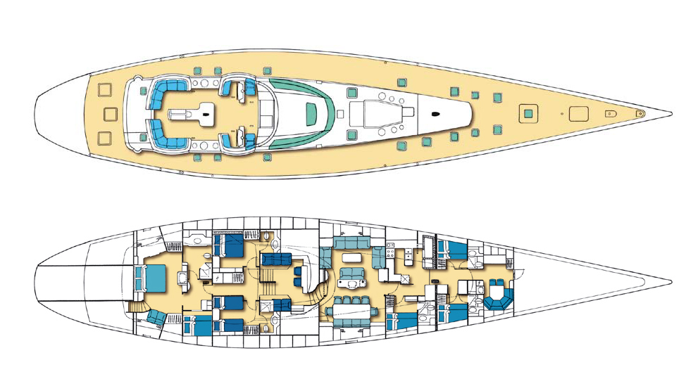 Equipped with a fast-displacement hull and high sail-area-to-displacement ratio, MARI CHA III delivers exceptional performance under sail, capable of competitive speeds while maintaining comfort at sea. Her twin-engine setup and auxiliary systems ensure reliable maneuvering and long-range cruising capabilities. MARI CHA III is capable of reaching a top speed of 17 knots with just 14 knots of true wind. She can also hit a top speed of 14.8 knots under the power of her single 600hp Caterpillar engine, and cruises at 10 knots.