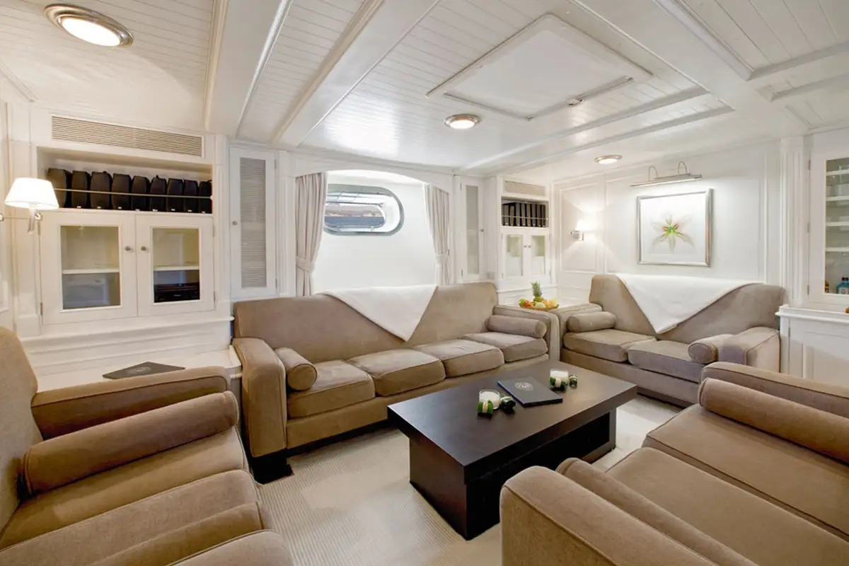 Her timeless interior by John Munford accommodates up to eight guests in four beautifully appointed cabins, including a full-beam owner’s suite with en suite bathroom and three additional guest cabins.