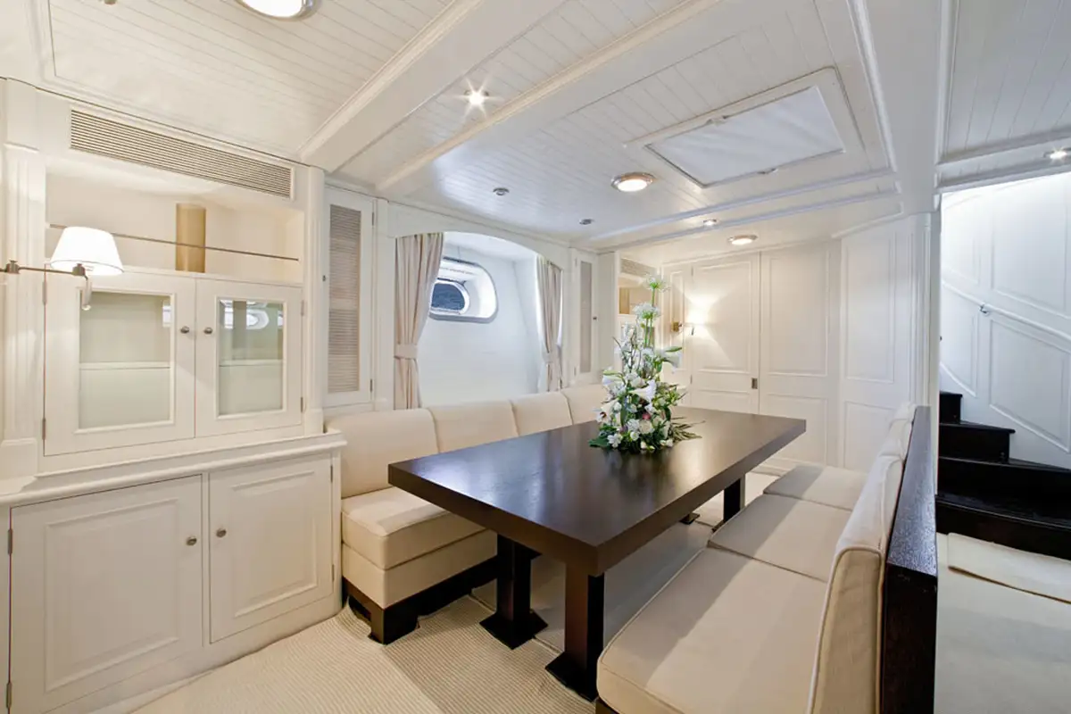 The yacht’s expansive deck features versatile spaces for relaxation, sunbathing, and alfresco dining. Below deck, the salon and dining areas offer refined comfort and elegant styling, combining functional layout with premium finishes for a sophisticated onboard experience.