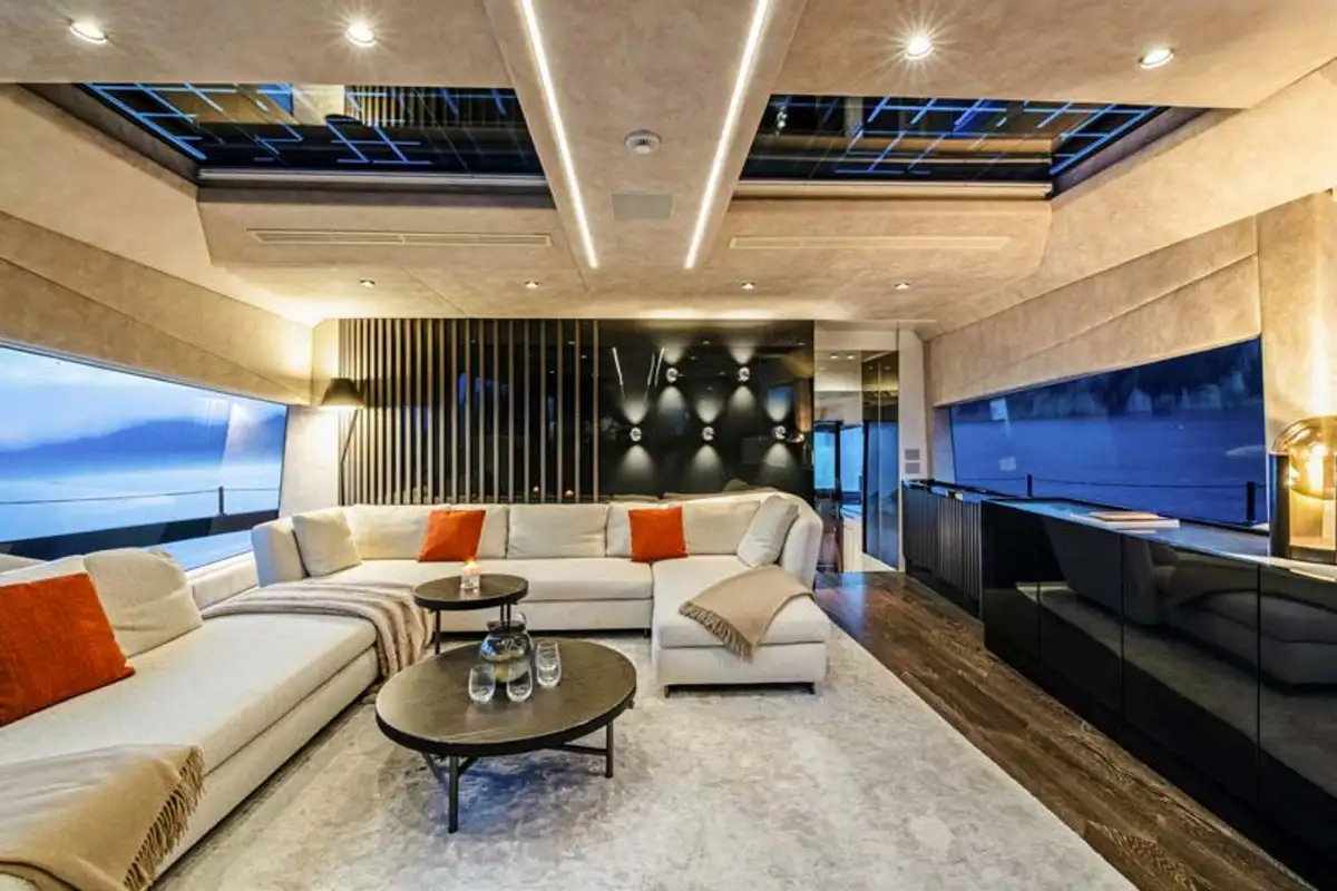 MARTITA's full beam, 50 square metre beach club is what truly sets her apart from similar boats in her category, offering remarkable views on to the surrounding seascapes and an extraordinary area to entertain or relax. Her beach club leads to a large dining table able to seat 8 comfortably, and an open galley that can be enclosed by a retractable window. Her open plan interior is spacious and modern, featuring a large sofa and expansive windows that enhance the connection between the interior and the stunning seascapes outside.