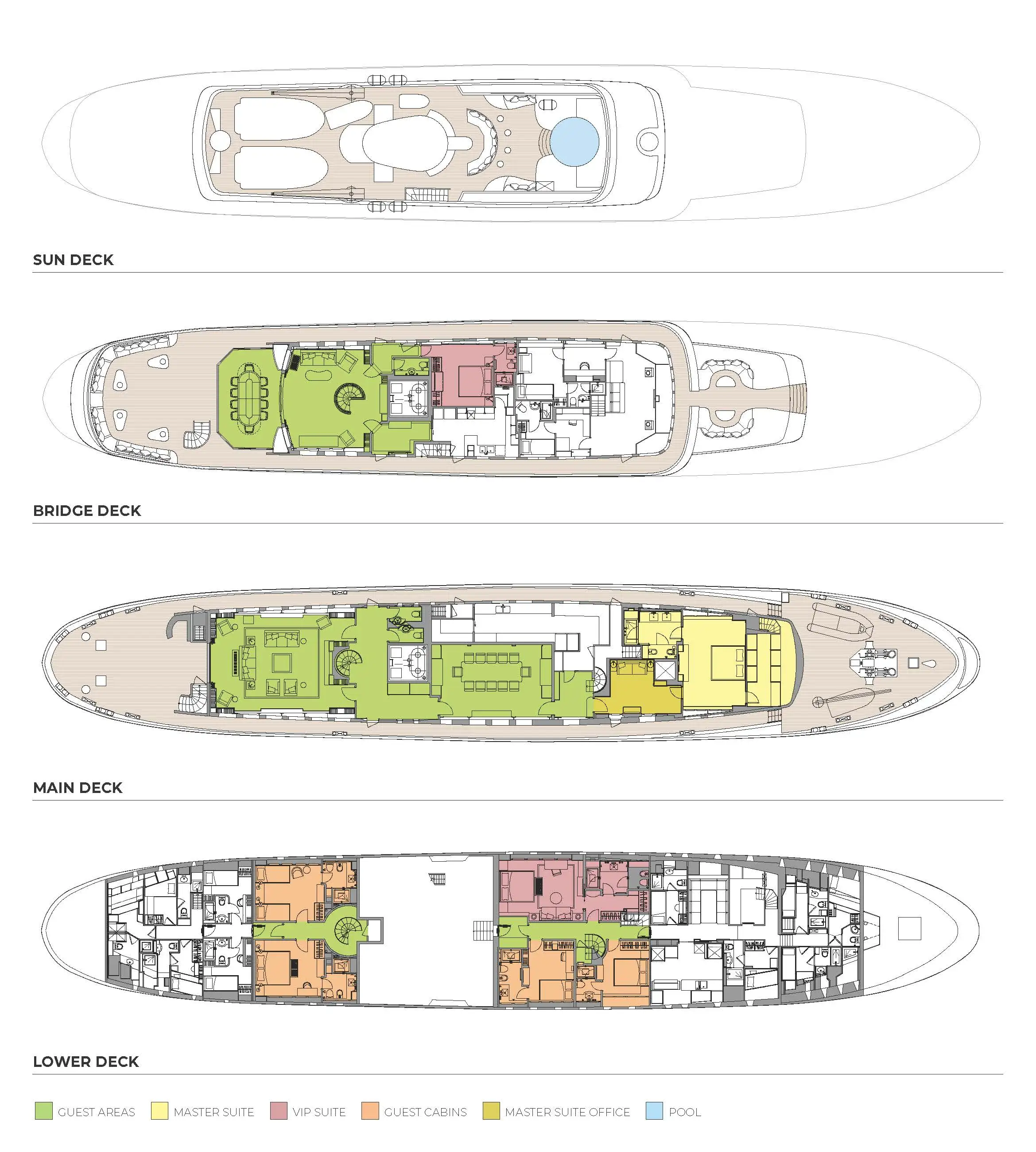 There is another covered open-air lounge on the main deck aft. Both main and upper decks have walkaround sidedecks and there is a Portuguese bridge lounge forward on the upper deck and toy stowage forward on the main deck.