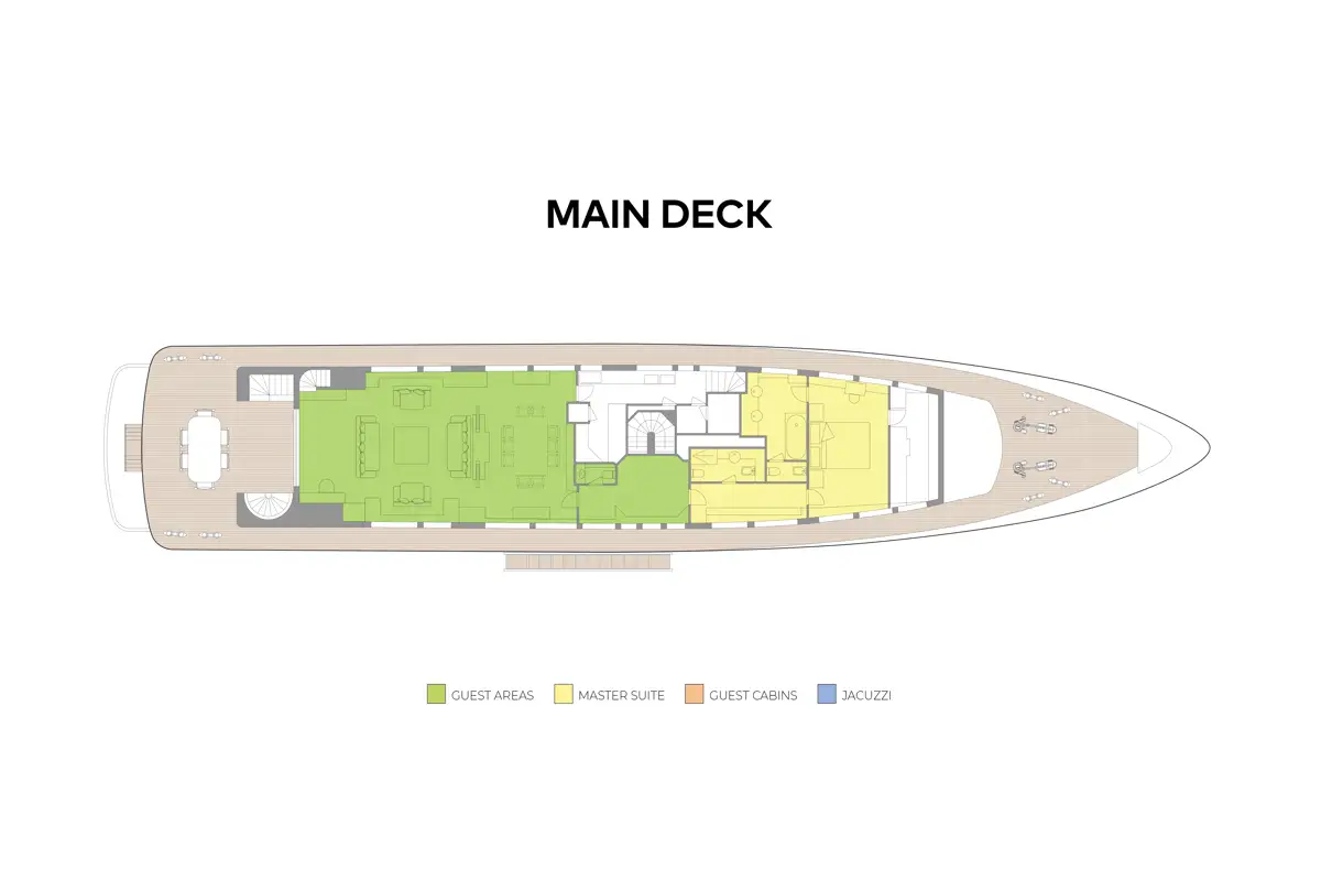 Expansive deck spaces across three levels offer al fresco dining, sunbathing, and leisure zones – with the sun deck featuring a jacuzzi, wraparound seating, and a full-service bar with matching parasols.