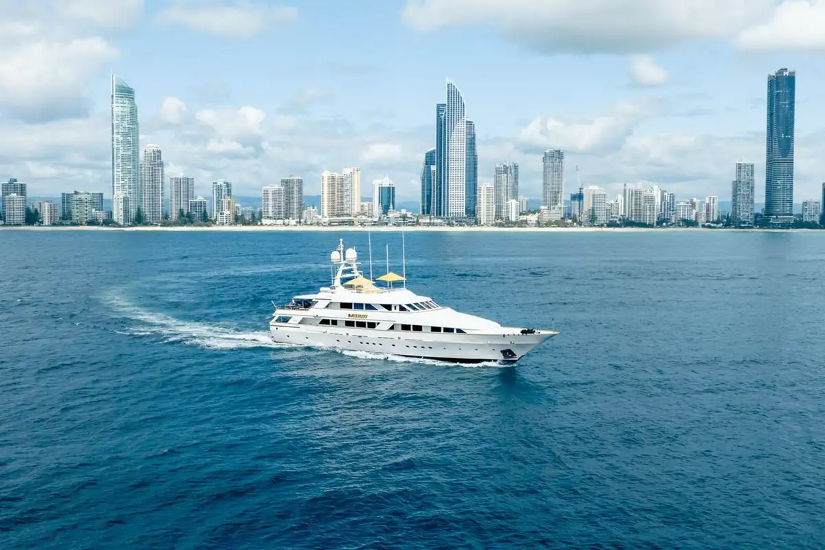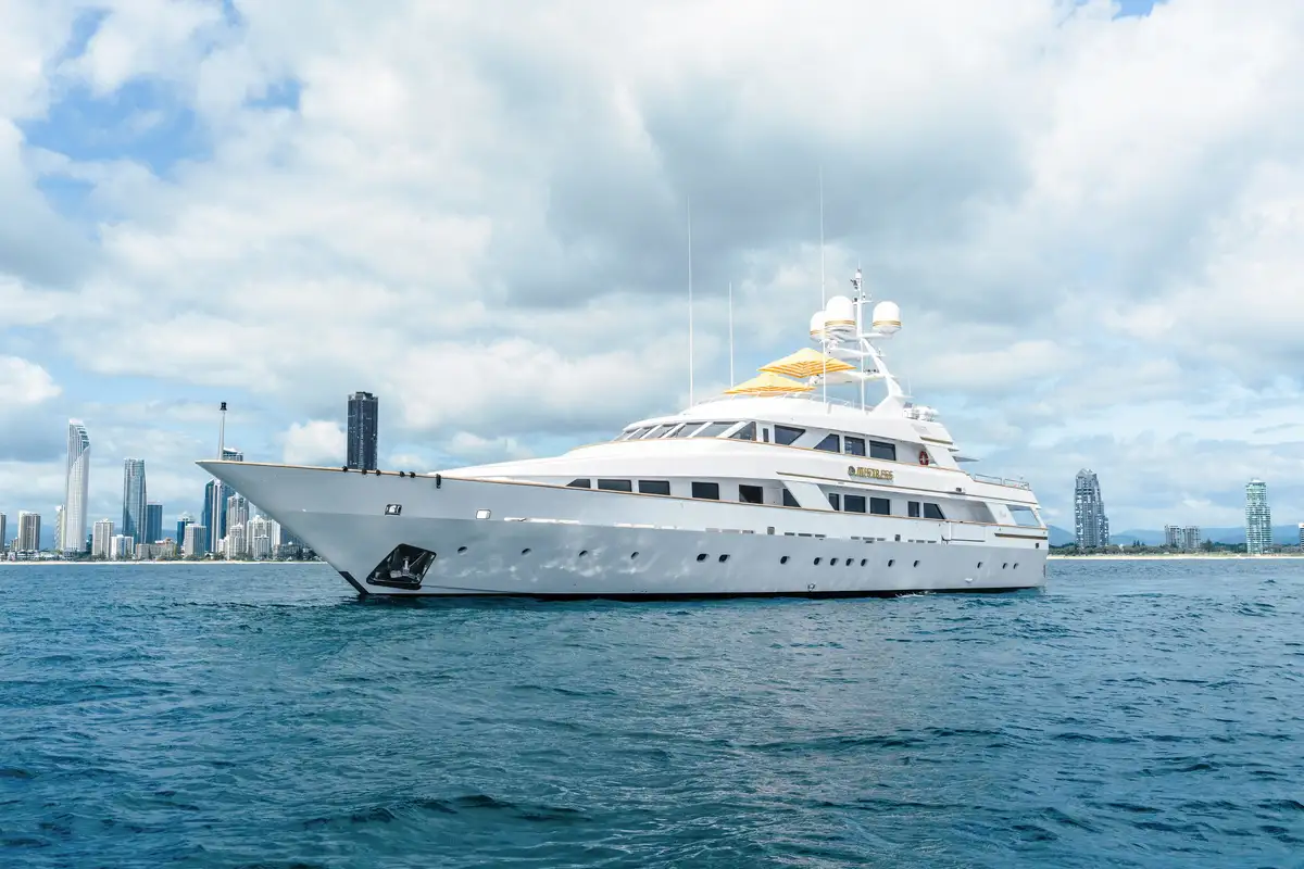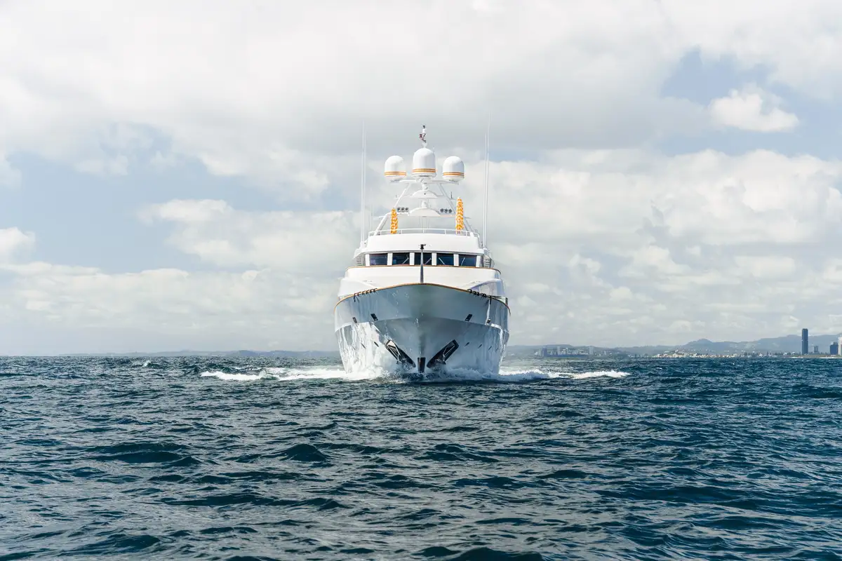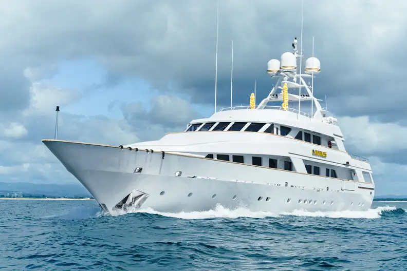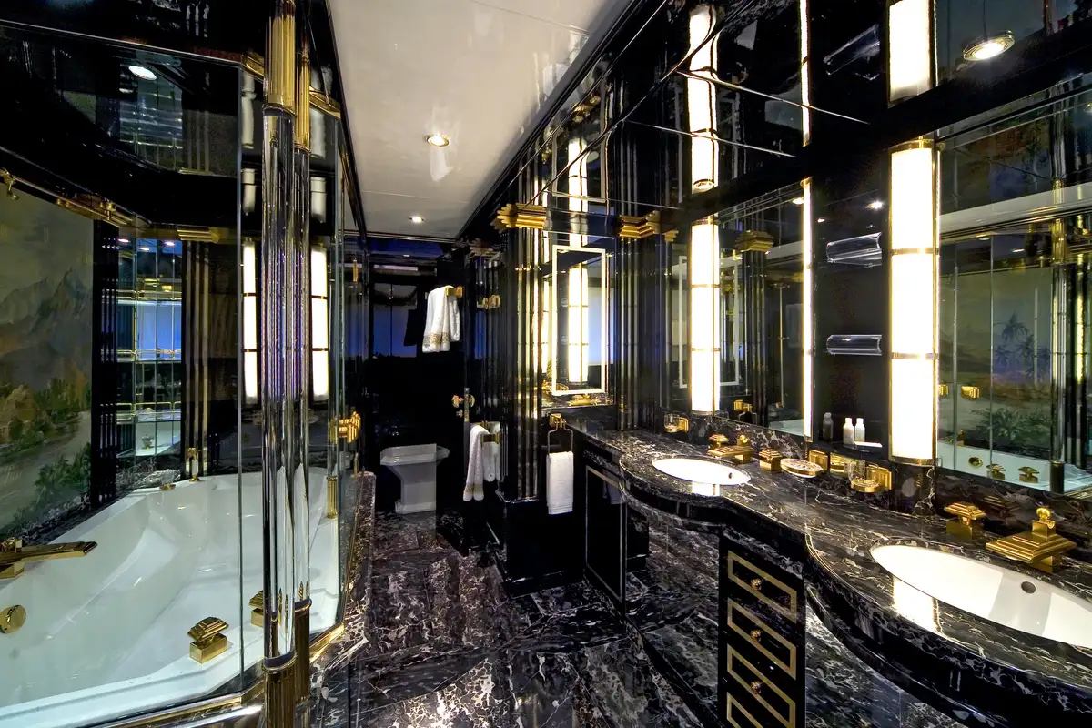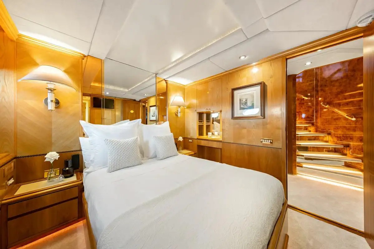 The yacht’s interior, curated by Zuretti with Versace accents, offers an atmosphere of classic opulence. Rich woods, golden hues, and bespoke furnishings evoke a refined yet inviting ambiance. Her 2024 upgrades include a full repaint of the hull and substantial coating of the superstructure, modernised systems, and updated amenities that bring her up to today’s luxury standards.