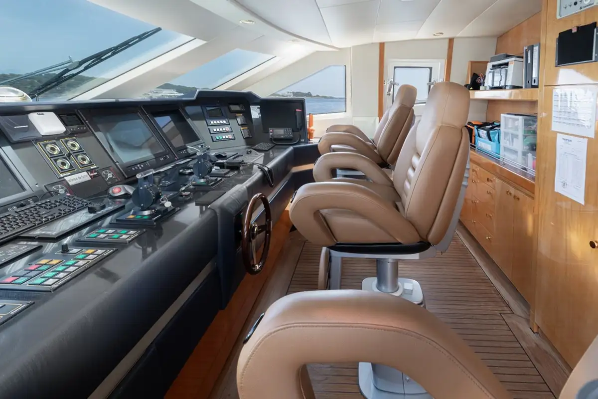 Built with a GRP hull and GRP superstructure, with teak decks, she benefits from a semi-displacement hull to provide exceptional seakeeping and impressive speeds. Powered by twin diesel MTU (16V4000 M90) 3,648hp engines, she comfortably cruises at 25 knots.