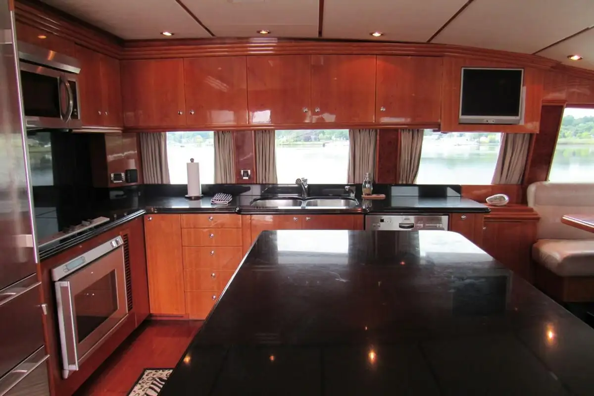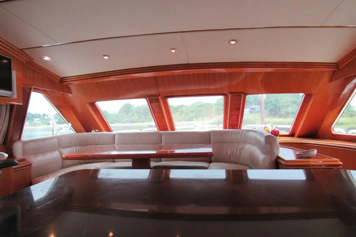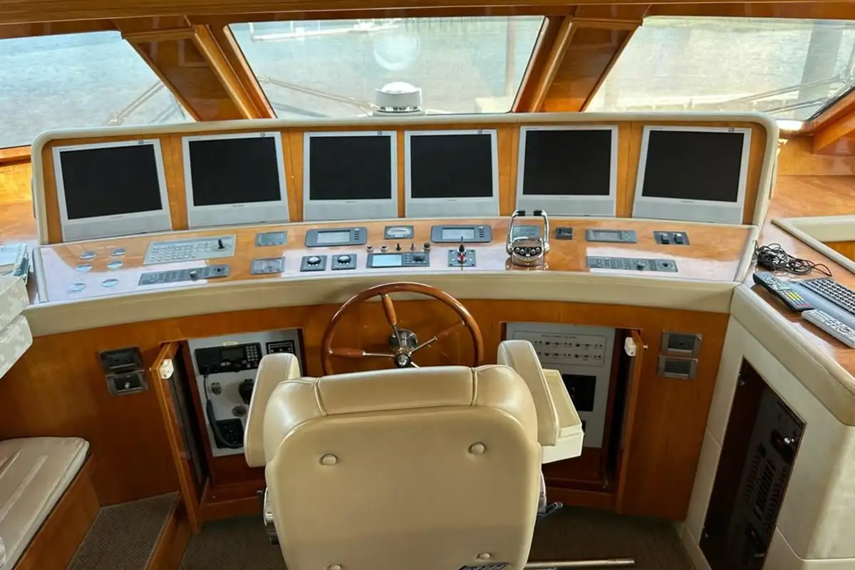 Her interior is designed with high quality varnished cherry cabinetry, white headliners, elegant plumbing fixtures, and complimenting stonework. She features a full-beam main salon with an L-shaped sofa and armchair, coffee table, starboard-side bar with barstools, and a large circular dining table forward. Her galley is family-style and offers dinette seating forward of the raised pilothouse