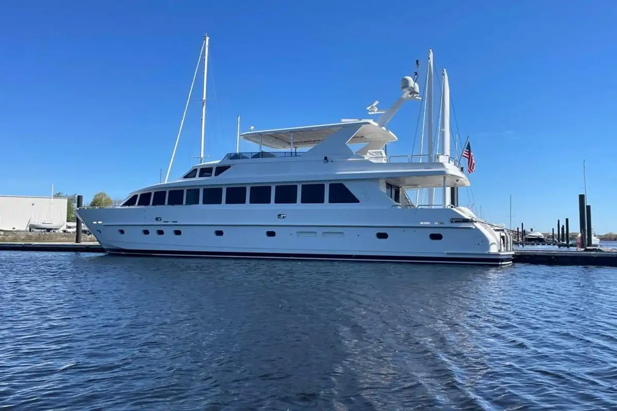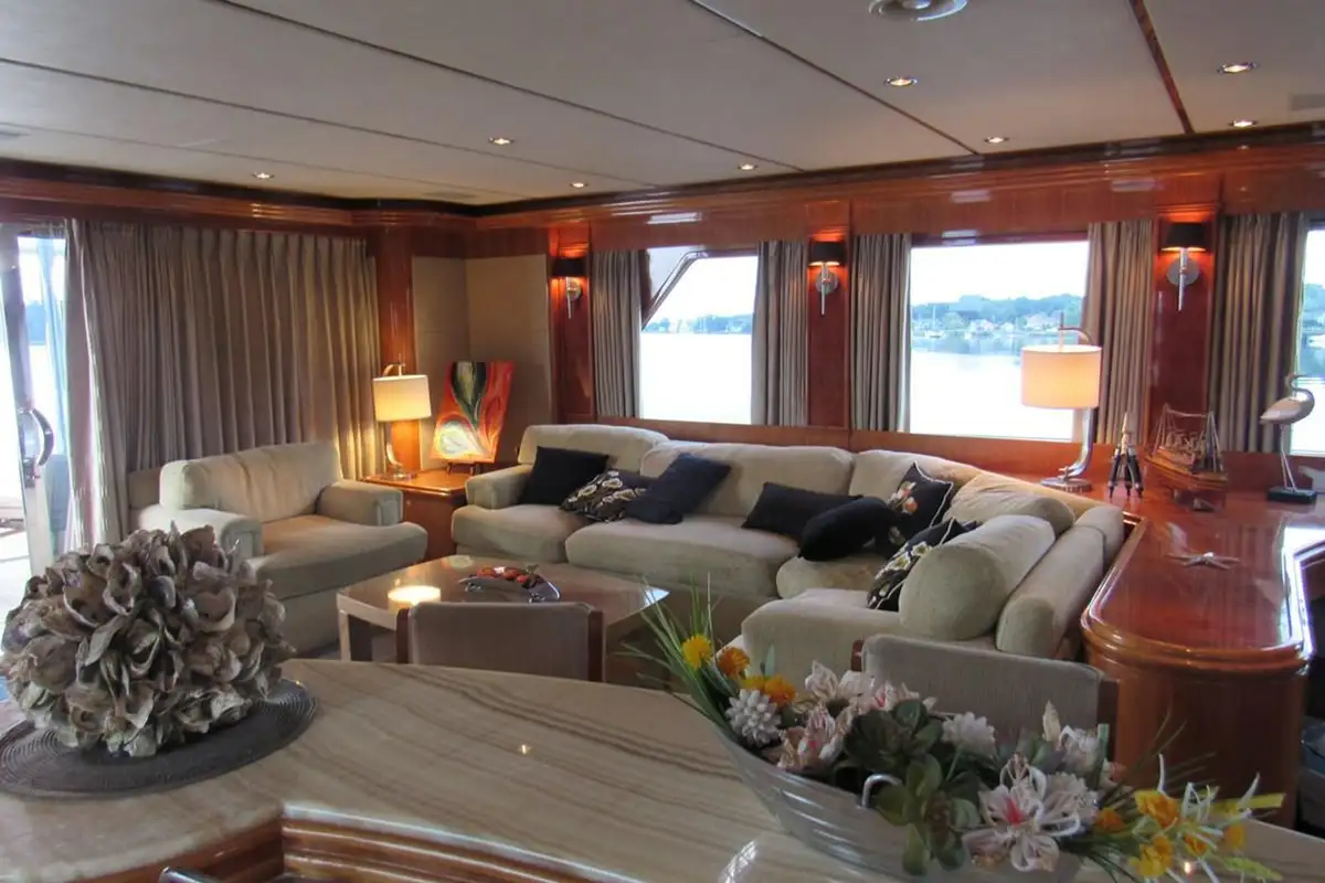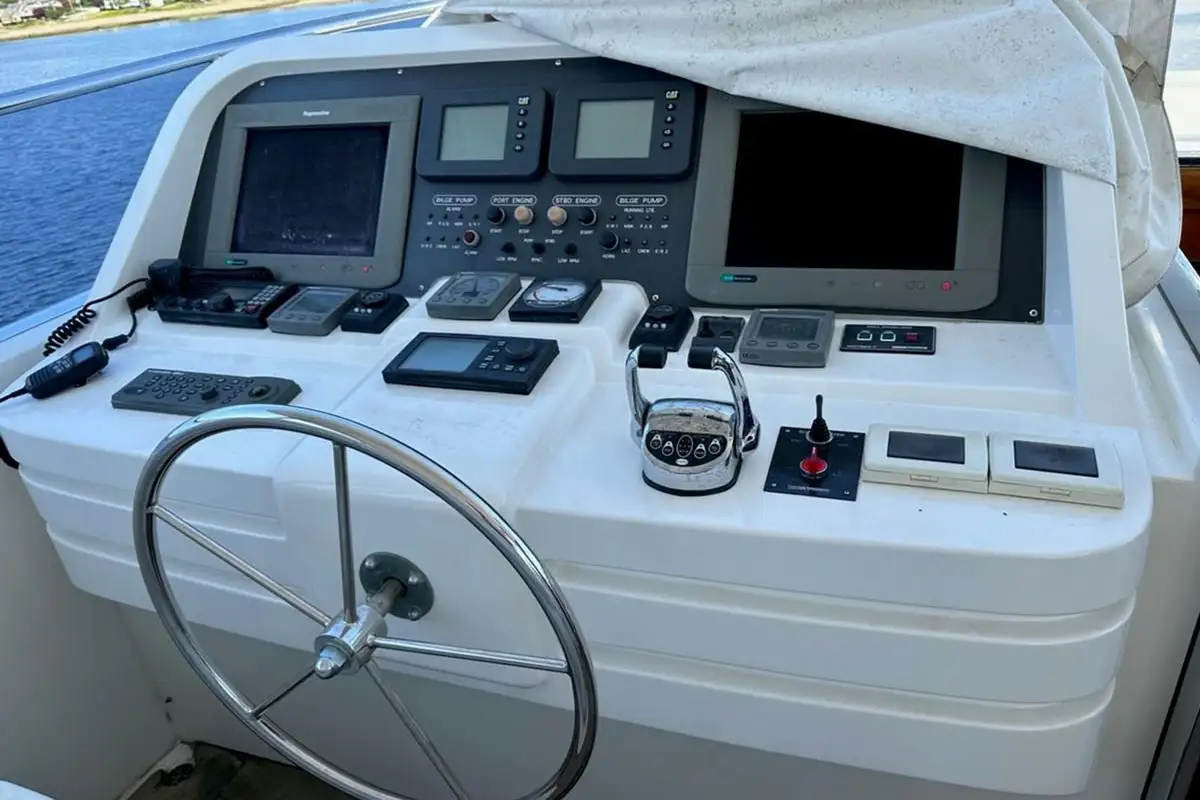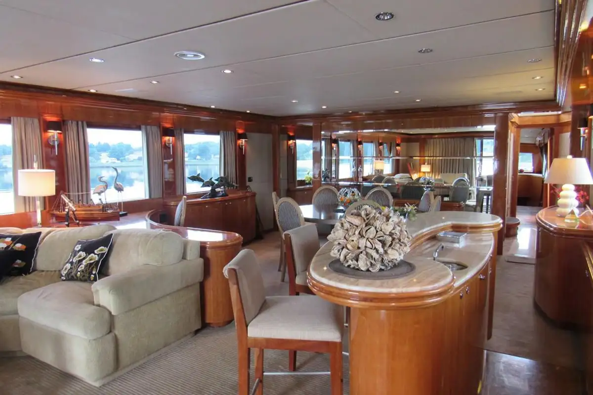 Her interior is designed with high quality varnished cherry cabinetry, white headliners, elegant plumbing fixtures, and complimenting stonework. She features a full-beam main salon with an L-shaped sofa and armchair, coffee table, starboard-side bar with barstools, and a large circular dining table forward. Her galley is family-style and offers dinette seating forward of the raised pilothouse