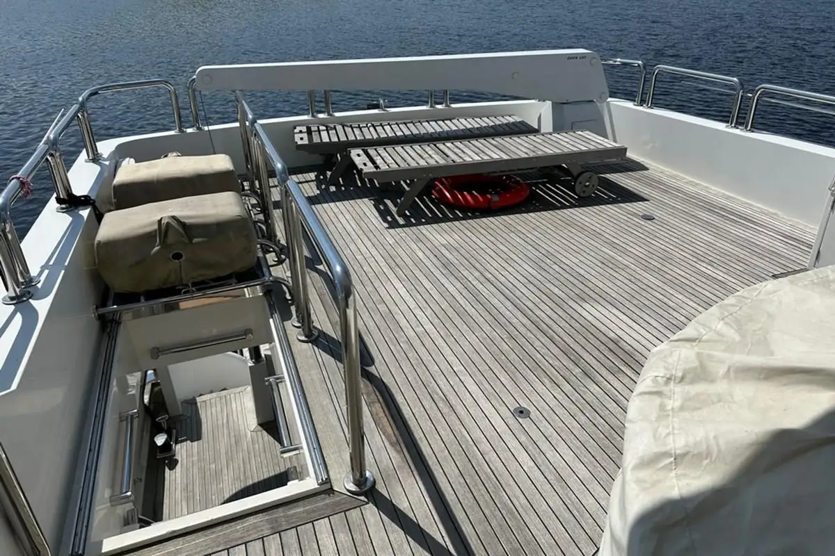 Her exterior is wrapped in stainless steel railings and was built for guest entertainment. For an al fresco dining experience, her main deck aft boasts a large glossy teak table with seating for six to eight guests with a view overlooking the stern. TUFF SHIP’s sun deck features a convertible hardtop, a large jacuzzi, guest seating, and an abundance of space
