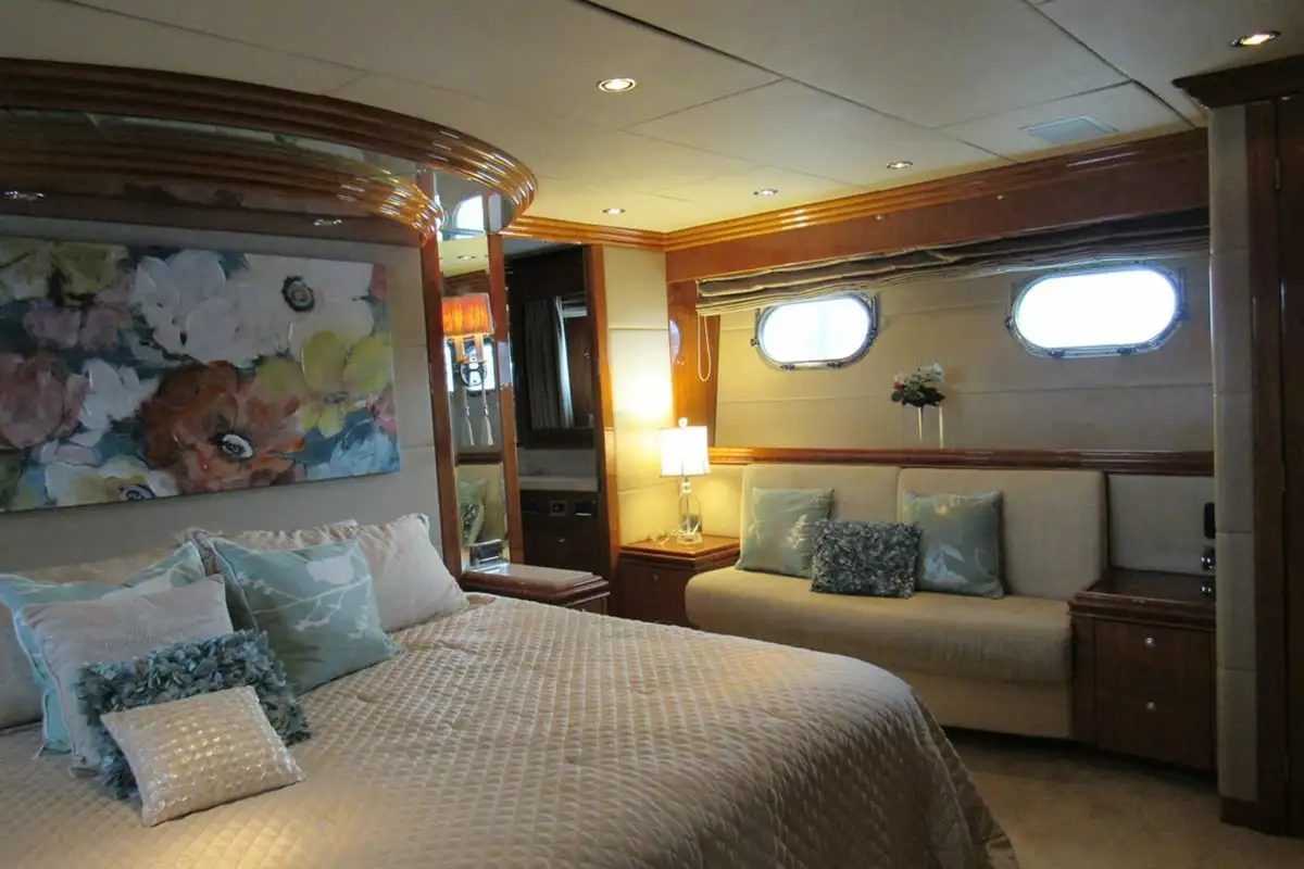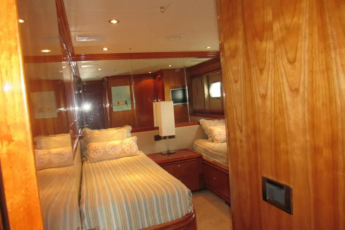 TUFF SHIP is configured to host ten guests in 4 cabins. Her generous master cabin features a king size berth, sofa, vanity, and his and her en suite bathroom connected by a walk-in shower. The VIP cabin is located forward with private stair access from the galley. Her additional cabins consist of twin berths with single pullmans on the inboard side. She is an inviting and comfortable yacht suitable for both family and charter use