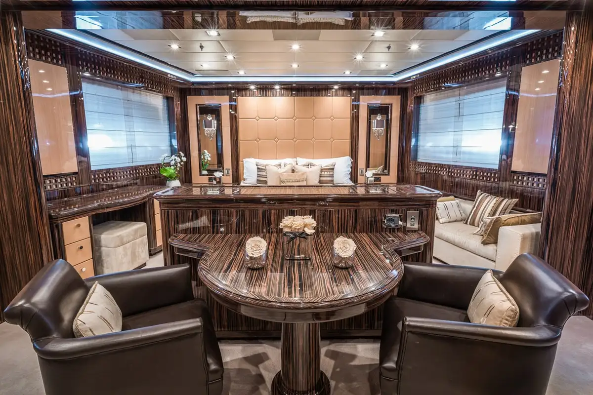 The large 49.9m Open series is designed by Stefano Righini with an interior styled by the in-house technical and decor department. MOKA’s warm interior tones blend glossy Ebony and Oak wood panels, chocolate oak parquet floors on the main deck and beige carpets in the cabins. A subtle mix of tan, brown and cream leathers around the boat complement a highly sophisticated feel throughout.