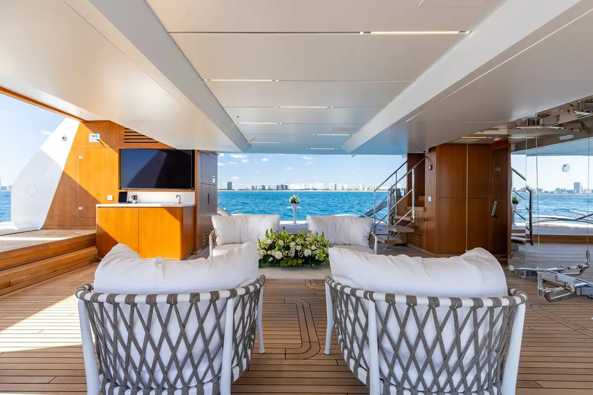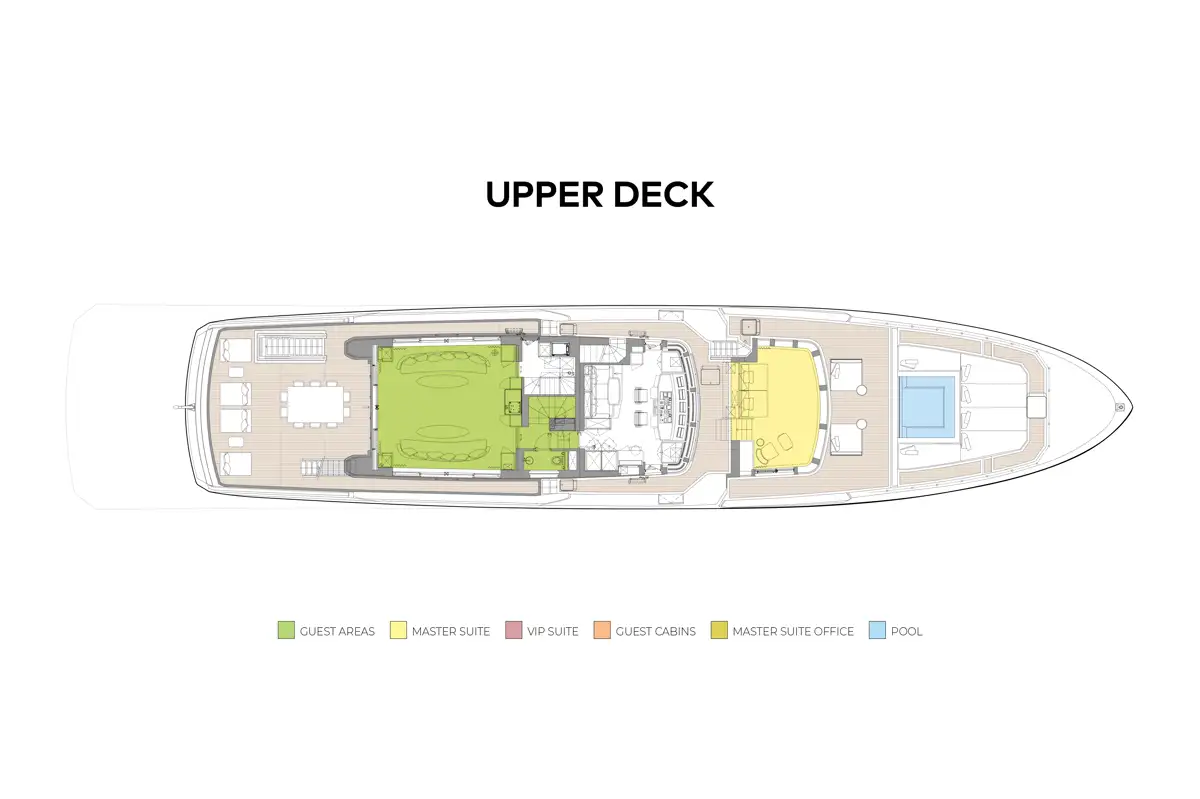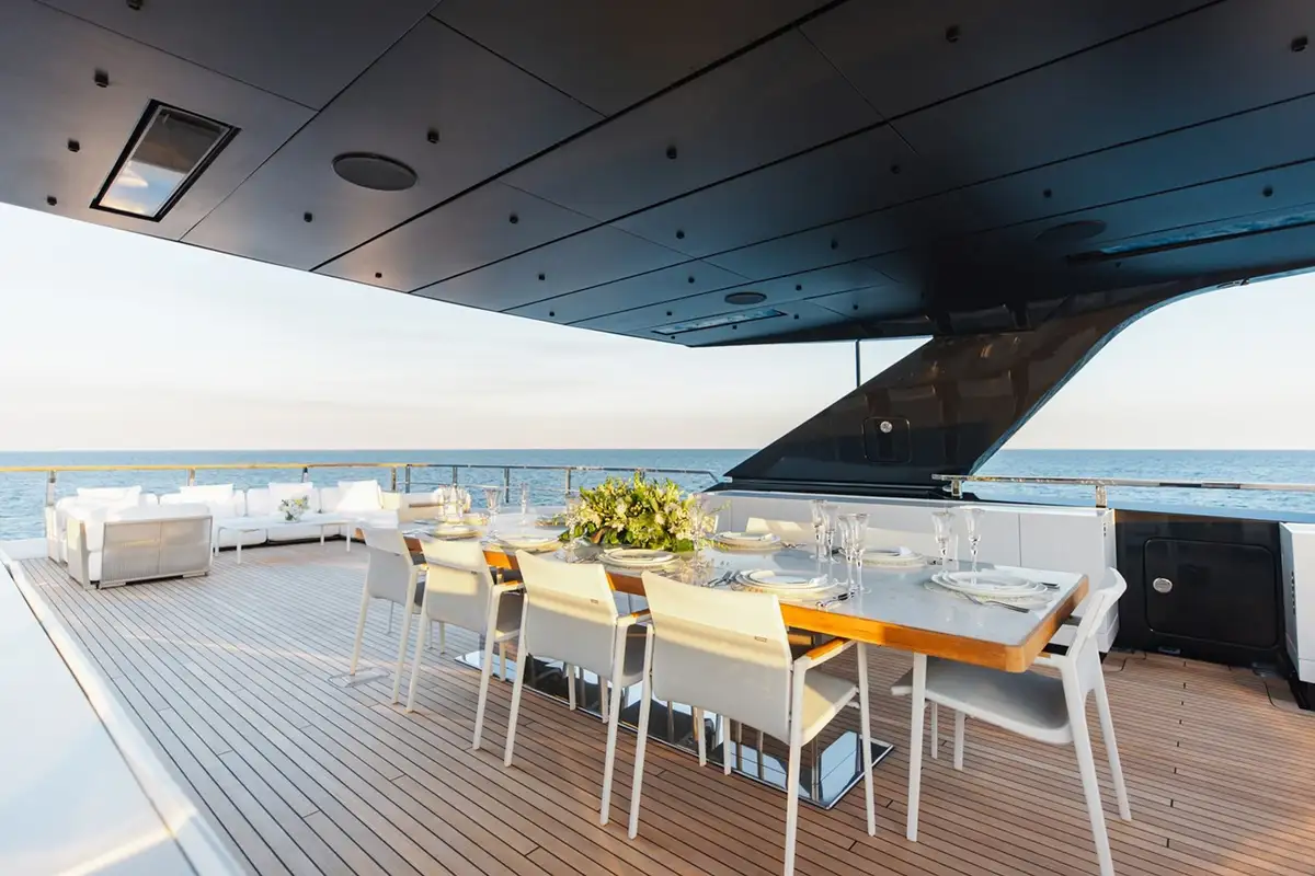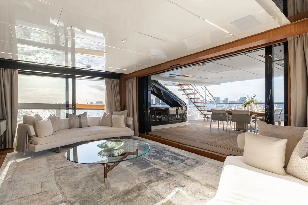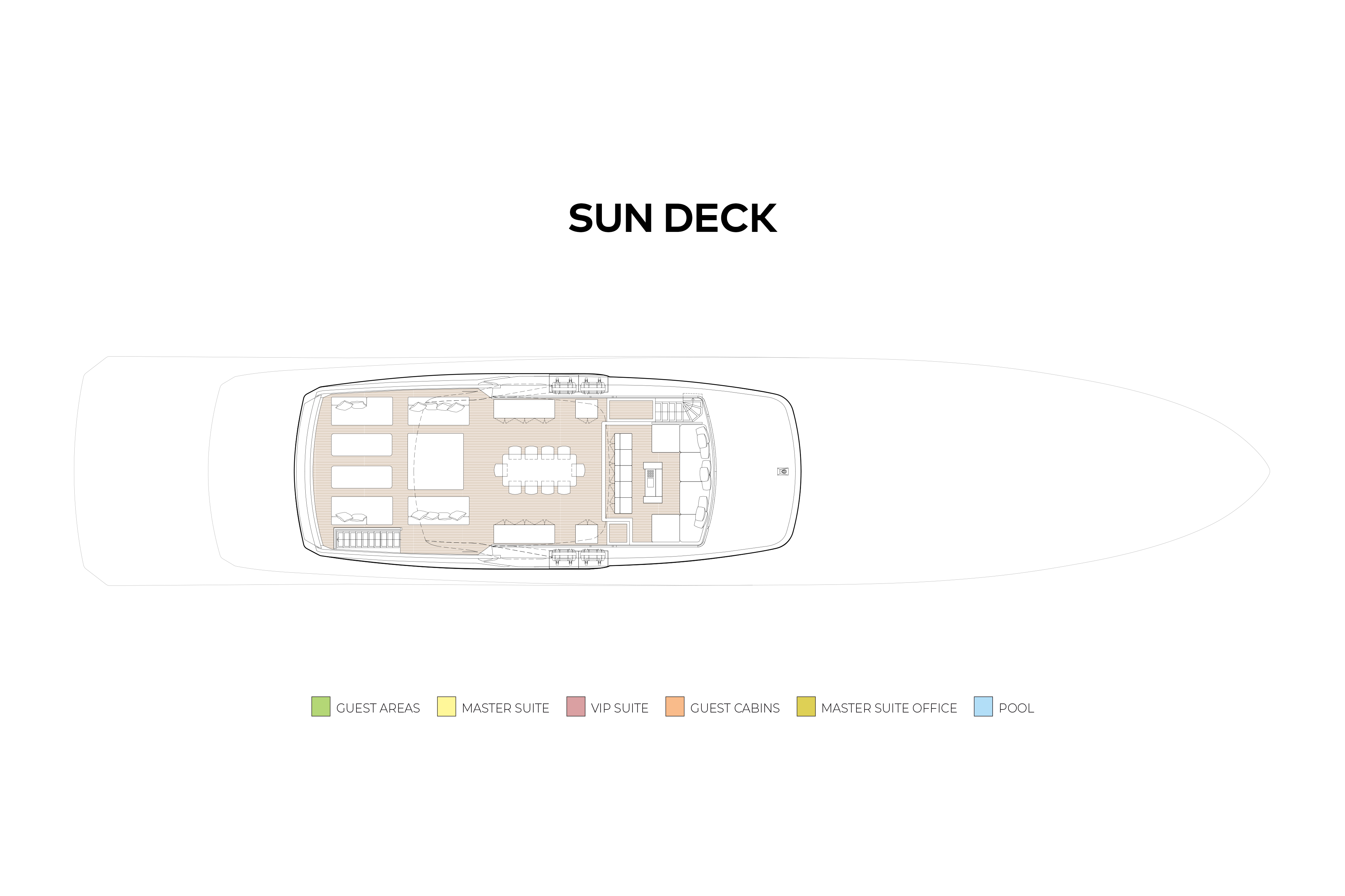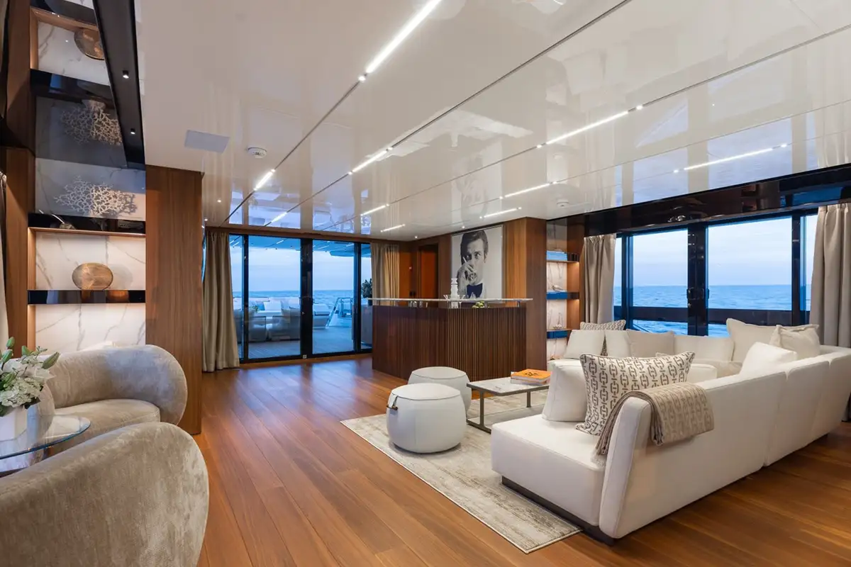Considerable guest deck spaces include the sun deck with sun lounging aft, a lounge area, dining table, bar and another bank of sunpads forward. On a spacious upper deck aft there is more sunbathing aft and a second open-air dining option on a versatile deck space shaded by the overhang. Sliding glass doors lead into a sky lounge with full-height glass and two banks of sofa seating with a large TV on the forward bulkhead. Glazed bulwarks deliver exceptional views. Walkaround decks lead forward to a private owner’s area on the foredeck complete with lounge seating and a jacuzzi nestled among a raft of sunpads.