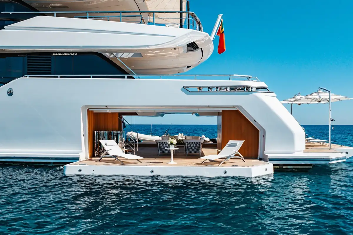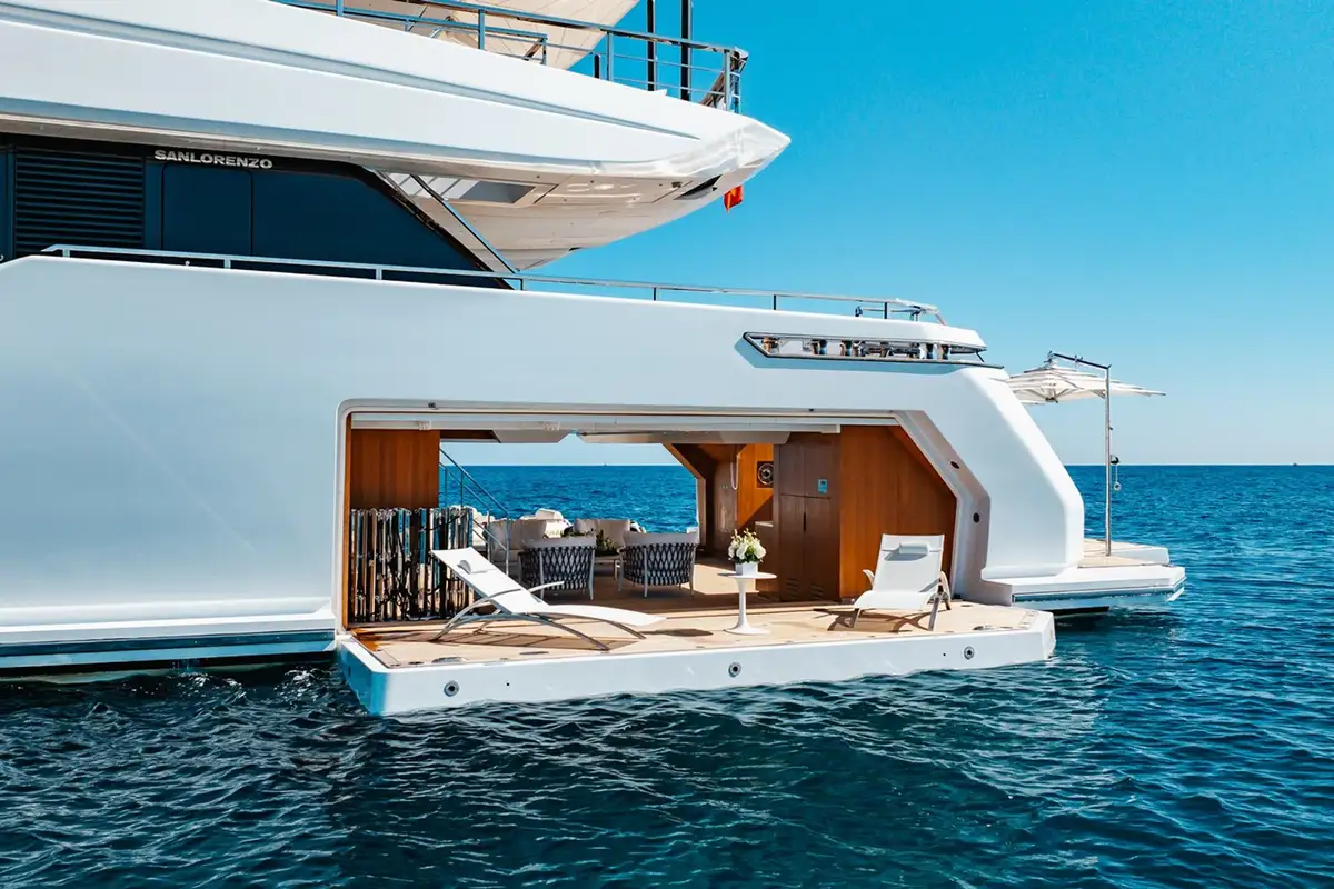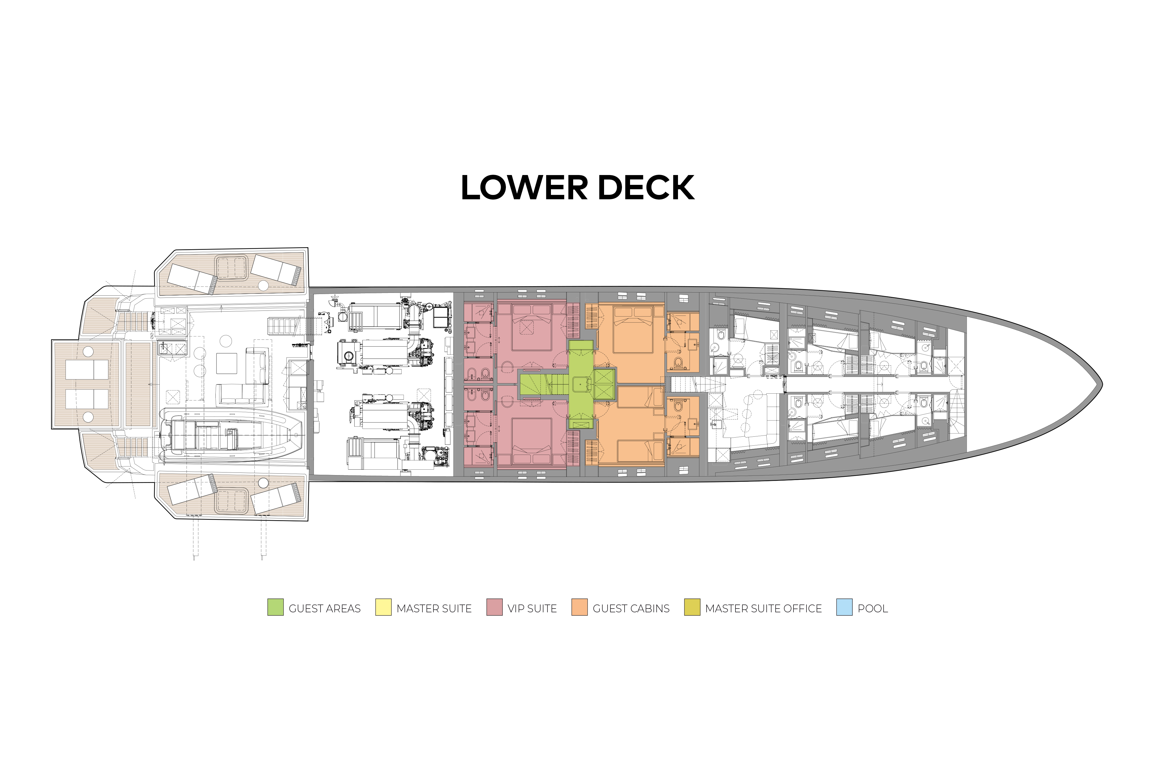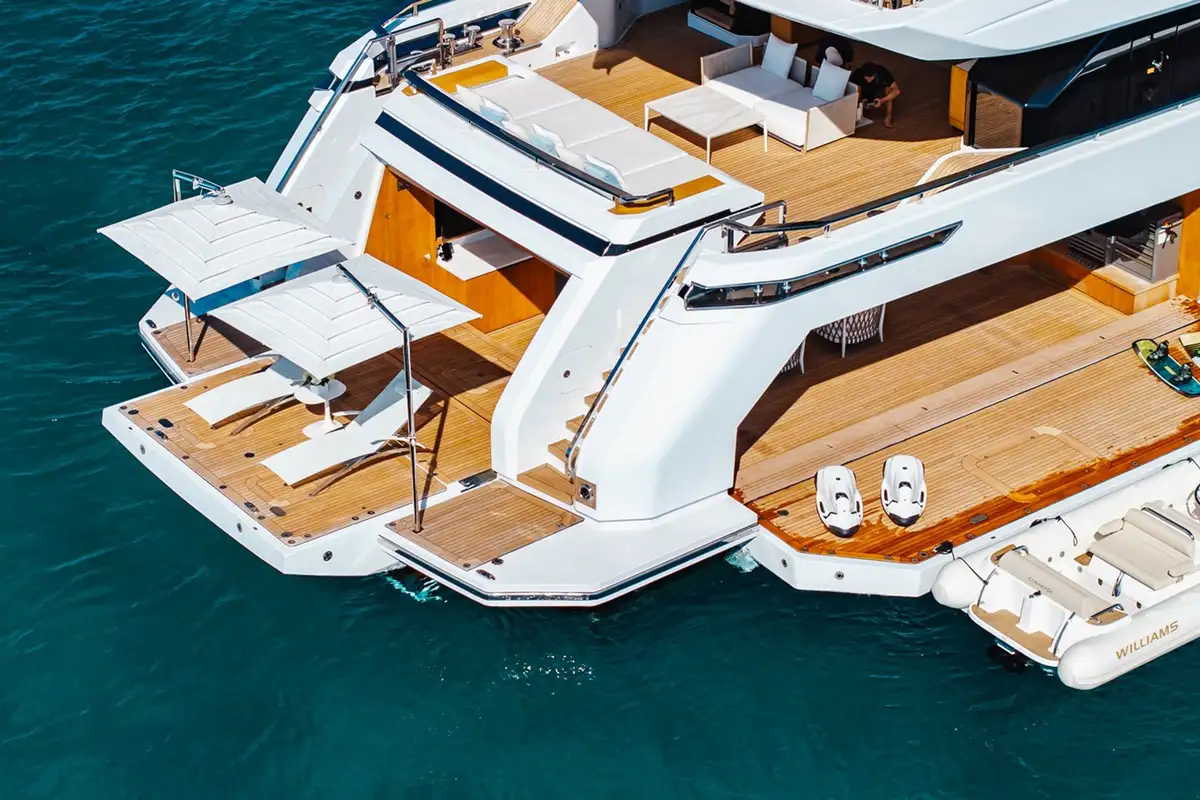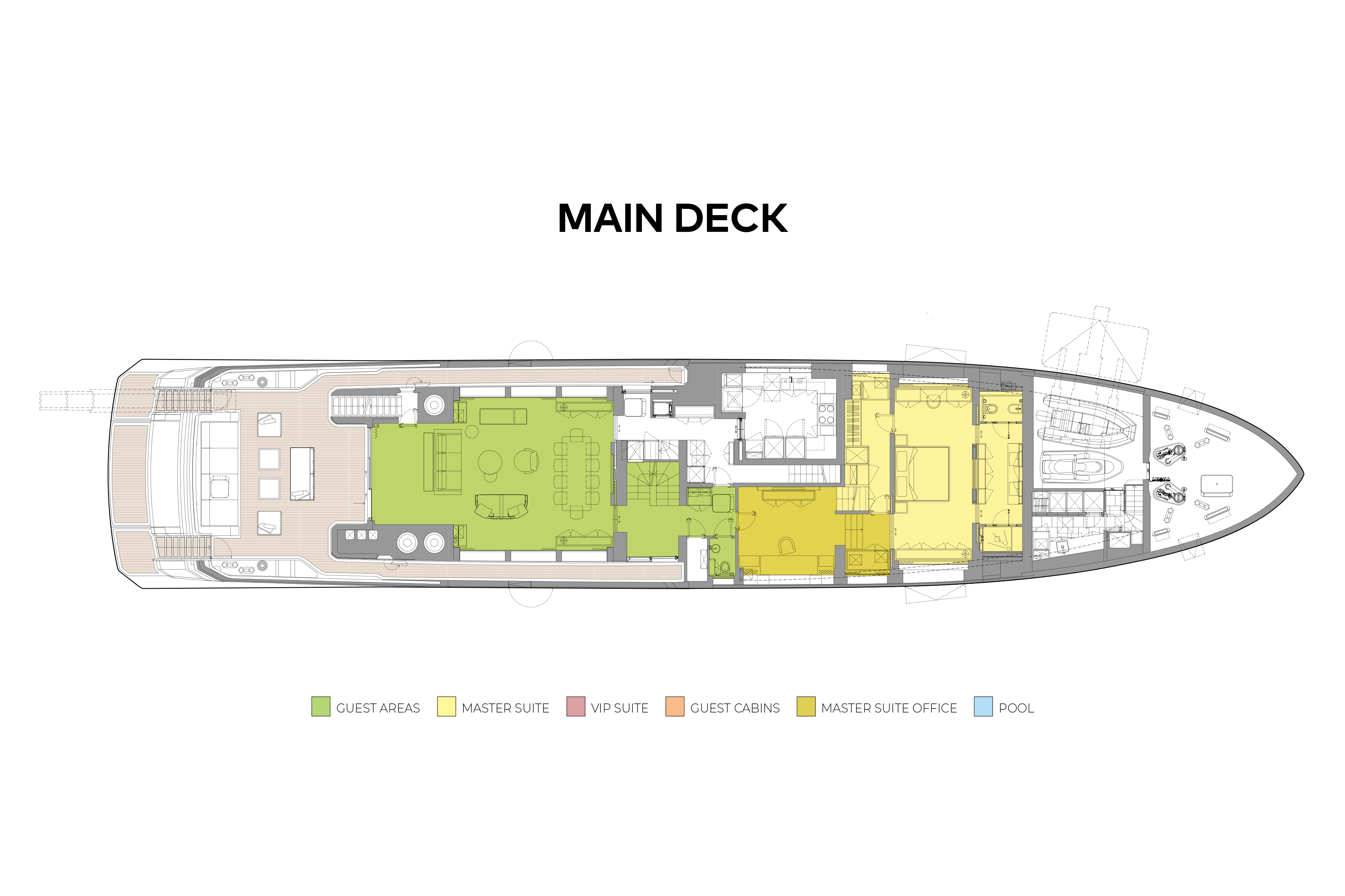 Lobby stairs lead down to the main lobby with access to the sidedeck and a dayhead. Aft is the formal dining space and there is an open plan lounge aft of that. Full-height sliding glass doors aft and either side combine with glazed bulwarks to bring the outside in. On the main deck aft is a lounge area partially shaded by the upper deck overhang, and a bank of sunpads. Steps lead down to the swim platform and beach club, to which there is also internal access. The teak-decked beach club is a multipurpose space that features a bar, lounge and gym and the space is open on three sides with a swim platform aft and sea terraces port and starboard. The space is also a tender and toy garage, launching to starboard on horizontal davits.