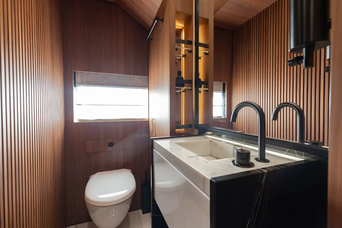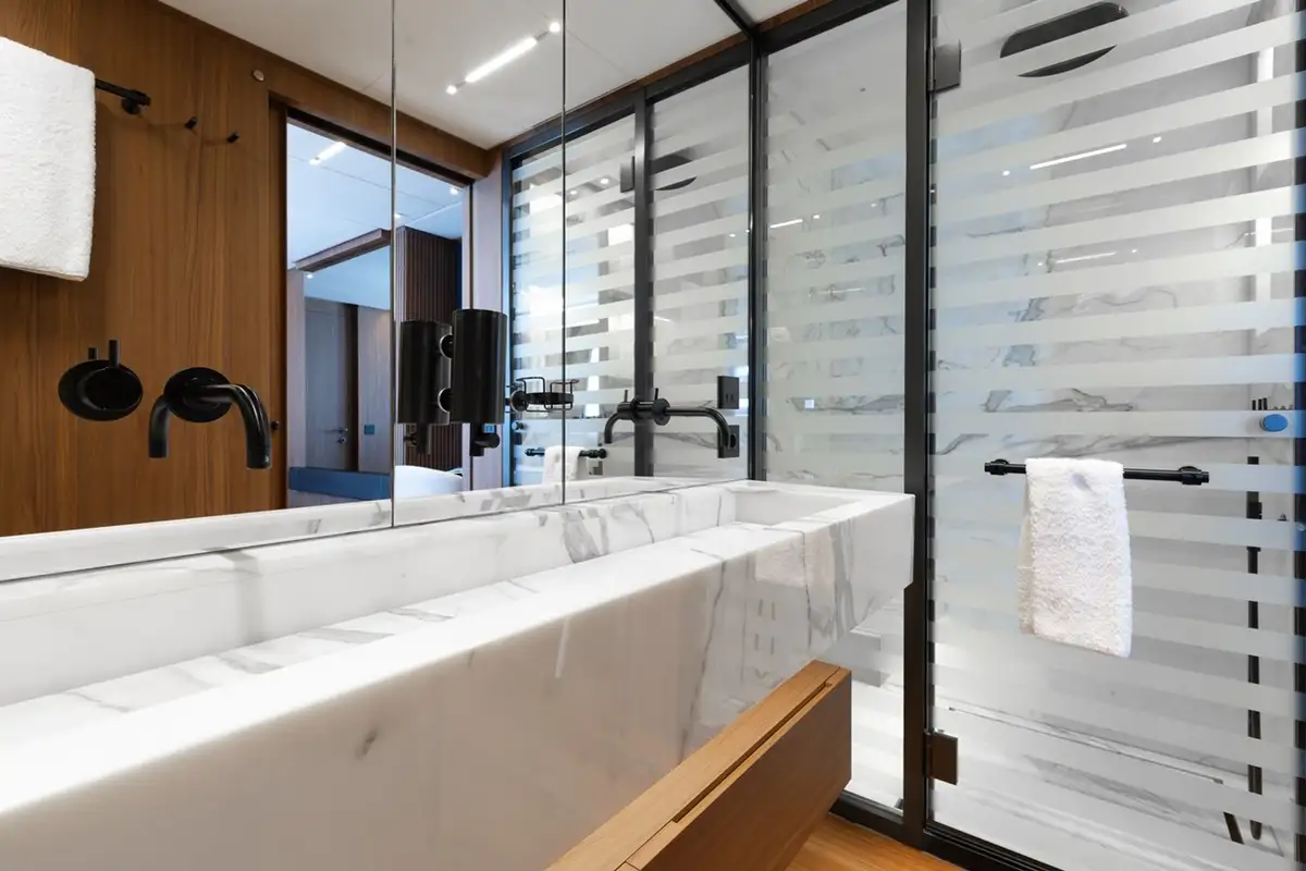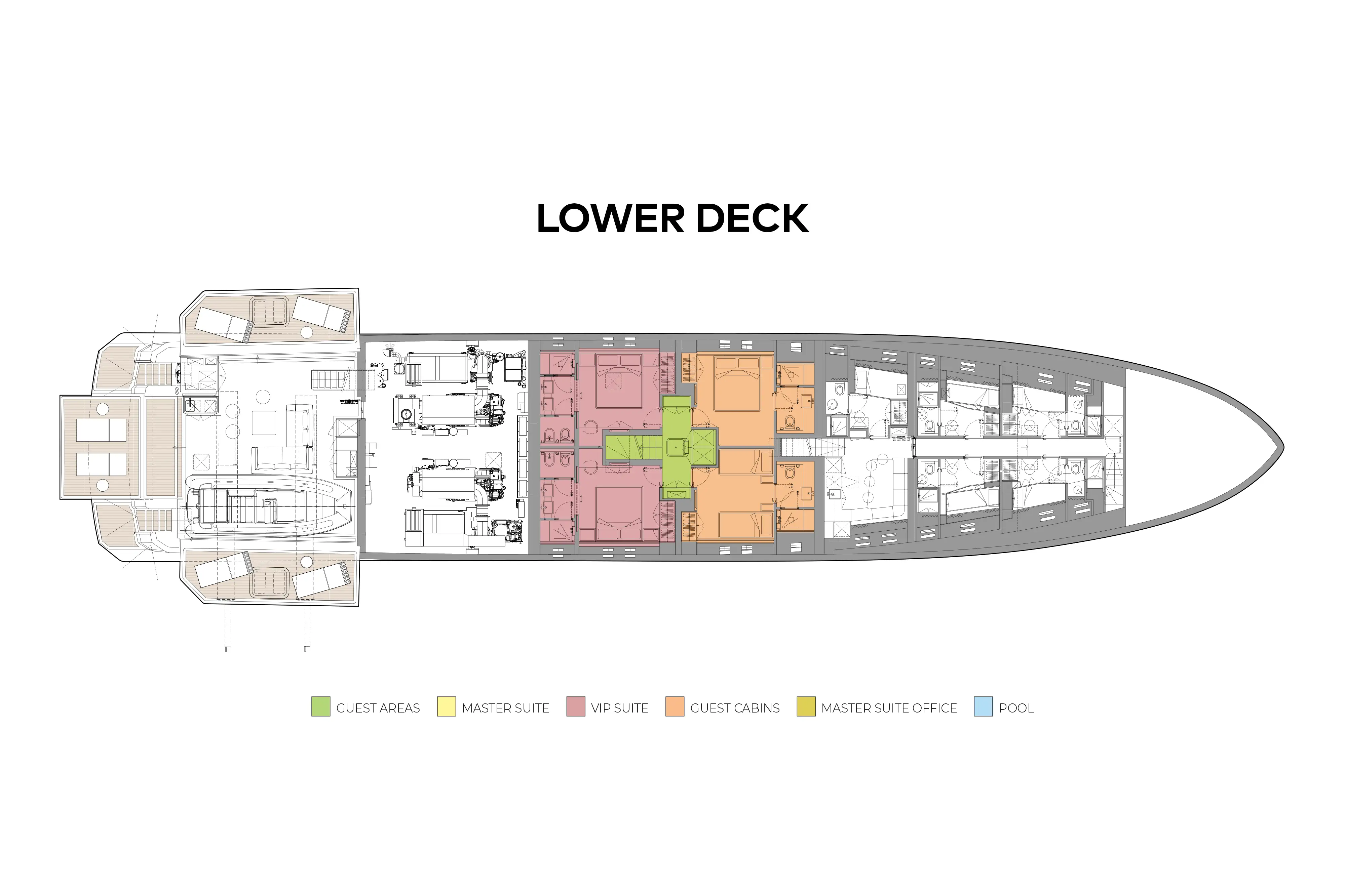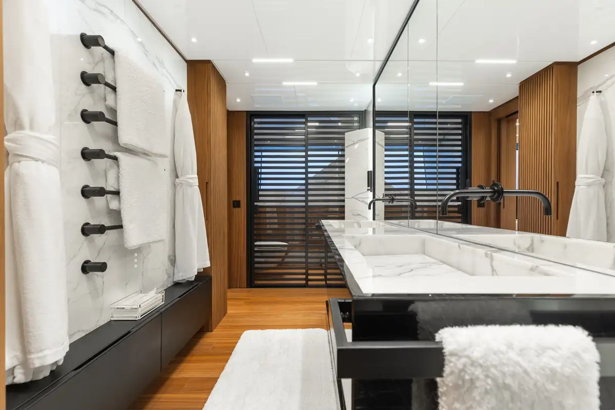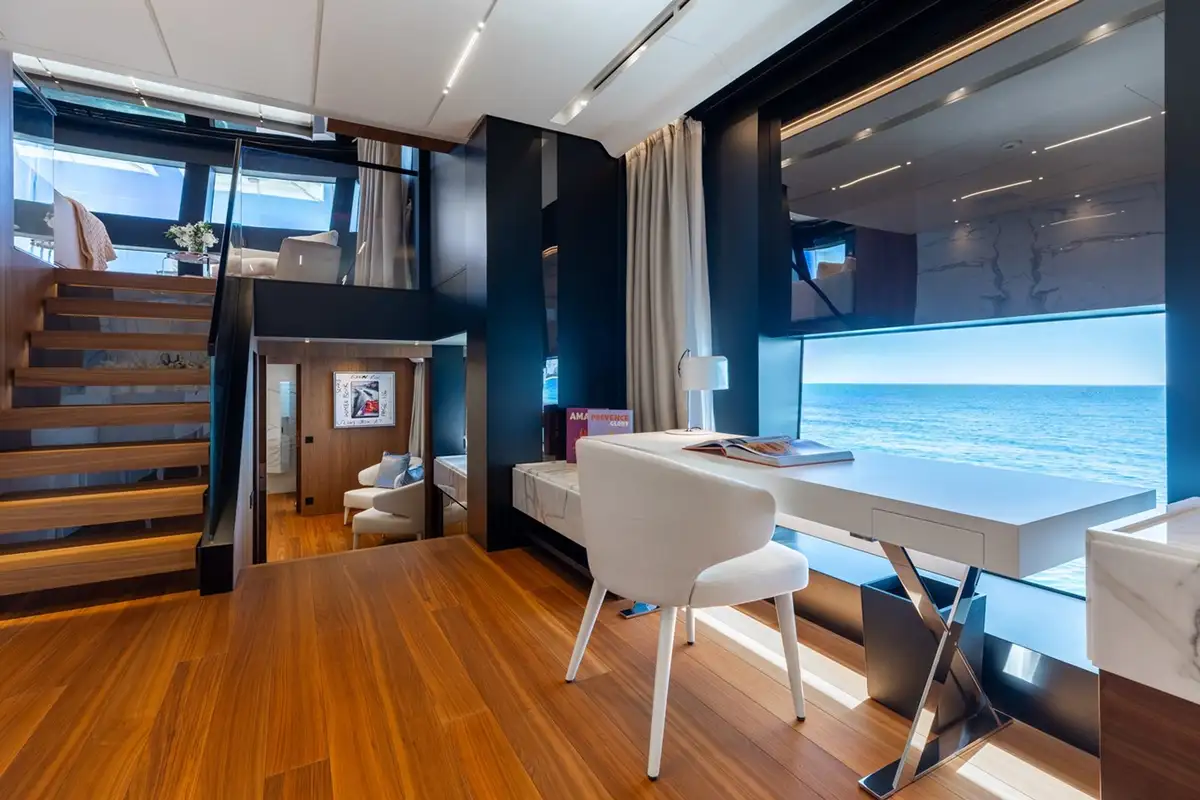 She welcomes 11 guests in five cabins. The owner's suite is split level. From the main lobby a door opens into a private study and steps lead up to the owner’s lounge and down into the bedroom suite. The full-beam owner's suite has a his-and-hers bathroom forward and a walk-in wardrobe. The lounge has a drop-down TV and exceptional views across the owner's foredeck jacuzzi and seating area, to which there is also private access. On the lower deck are three double suites and one twin suite with an additional berth.