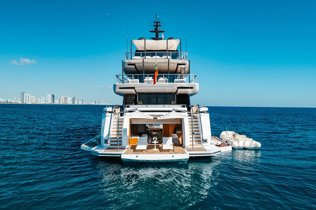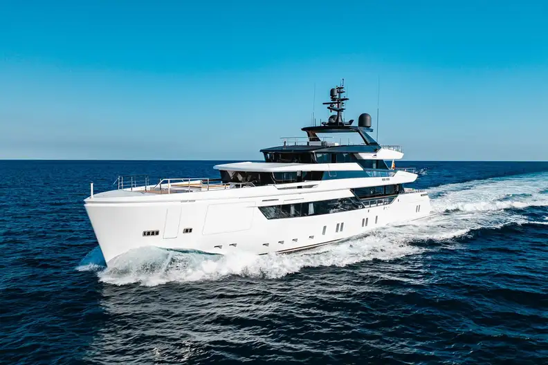 As well as the main tender in the beach club, there is tender and toy stowage behind a main deck shell door to port. Twin 2,636hp MTU diesel engines give her a top speed of 21 knots, she cruises at 18 knots and has a maximum range of 2,000nm. Zero speed stabilisers ensure comfort at anchor on arrival.