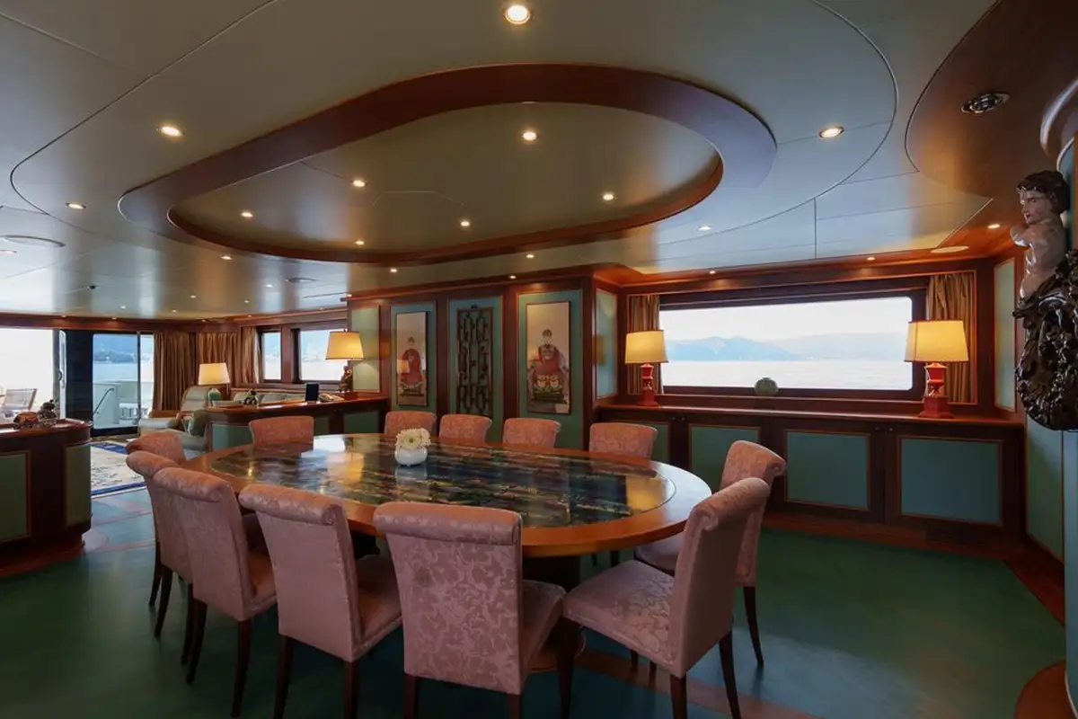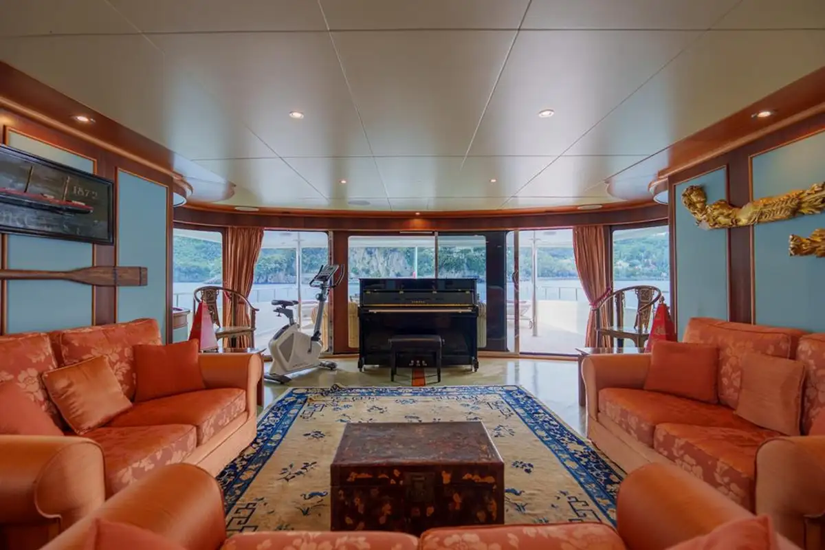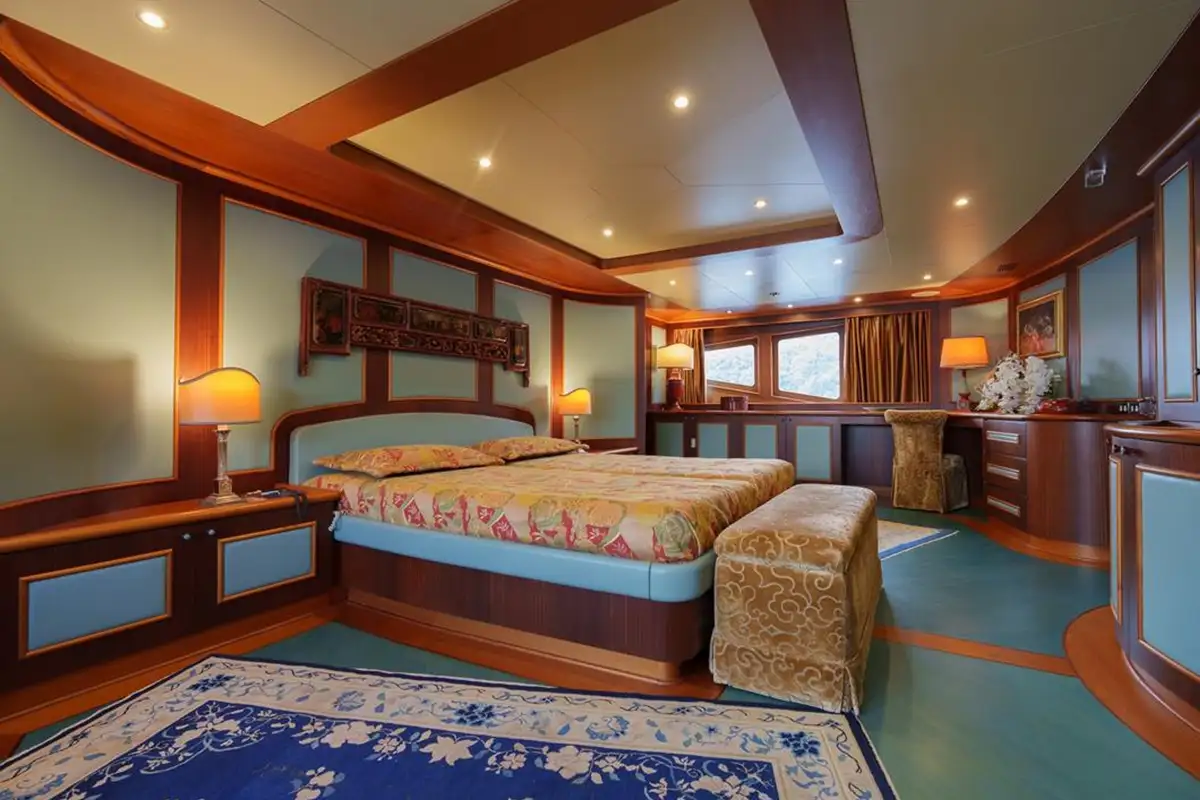 Interior volumes are vast and there are ample deck spaces for entertaining and dining al fresco, particularly on the huge aft deck with comfortable rattan armchairs, cushions and occasional tables. A comfortable Asian-style interior designed by Elisabetta Ruggiero has spacious accommodation for 12 guests in six well-appointed cabins, all with en suite bathroom facilities. These comprise a master suite on the main deck, a twin cabin on the upper deck with three doubles and a twin on the lower deck. In addition, there are berths for seven crew in five cabins.