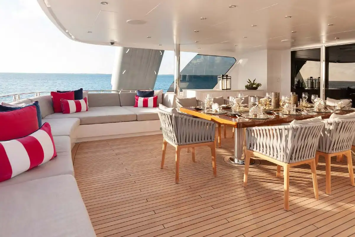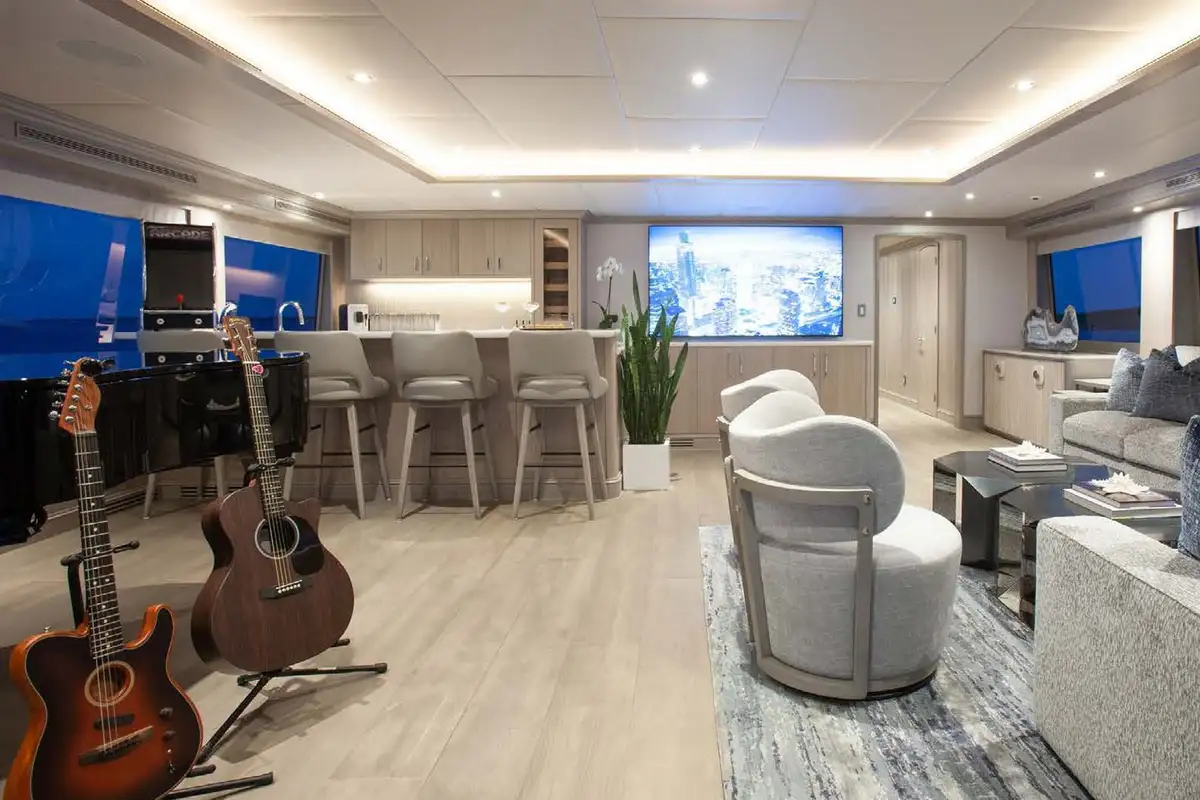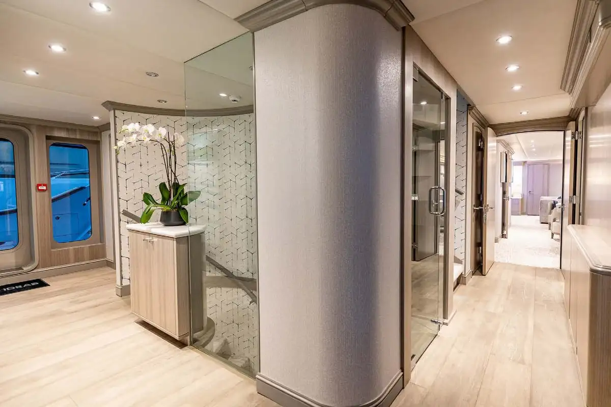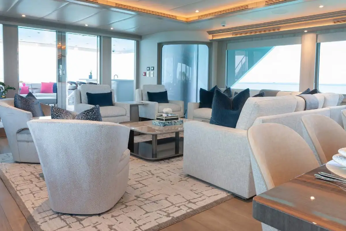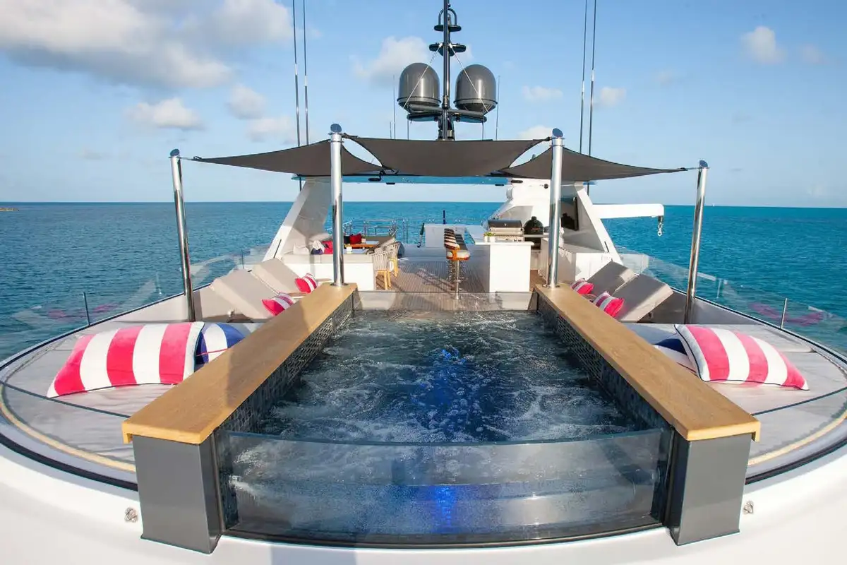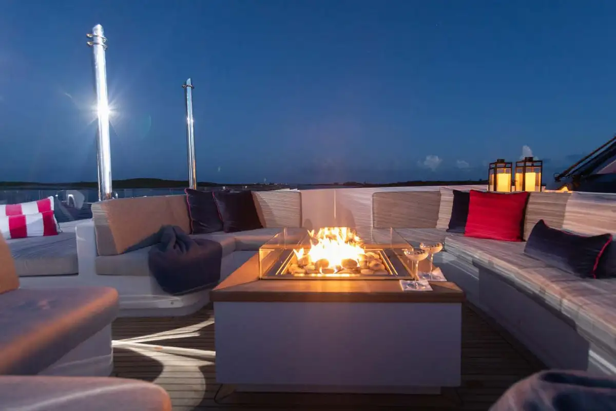 Her redesigned exterior features an expansive seating area forward of the bridge surrounding a fire pit, a spacious bar and 10 person jacuzzi on the sun deck, and a 10ft extension on the stern which presents an additional jacuzzi