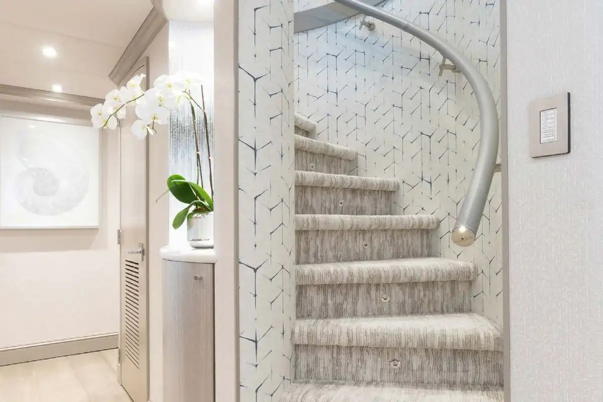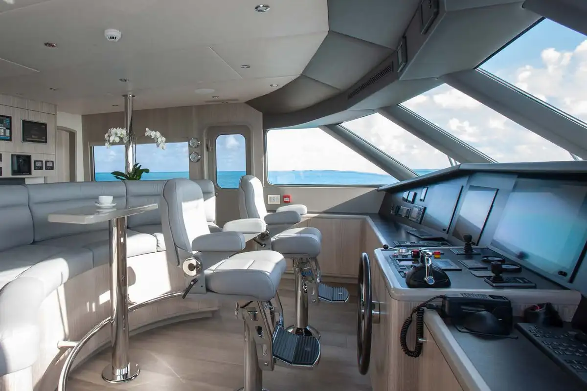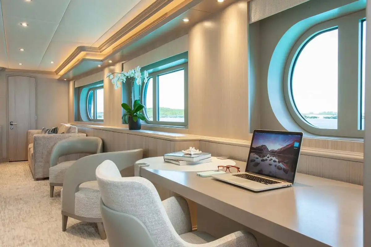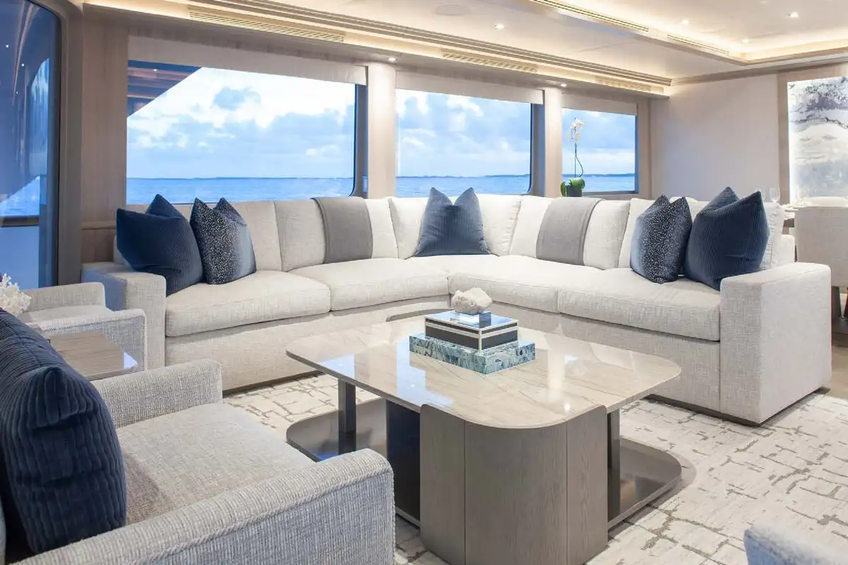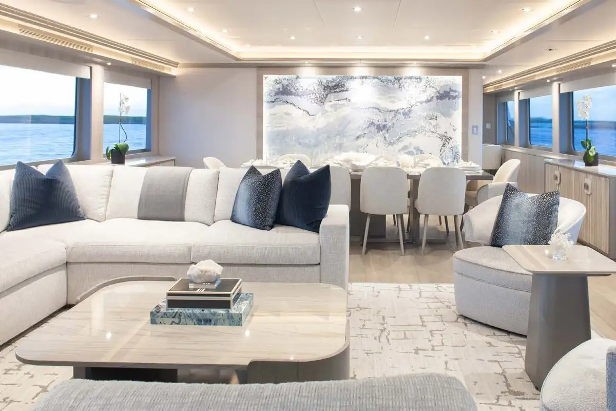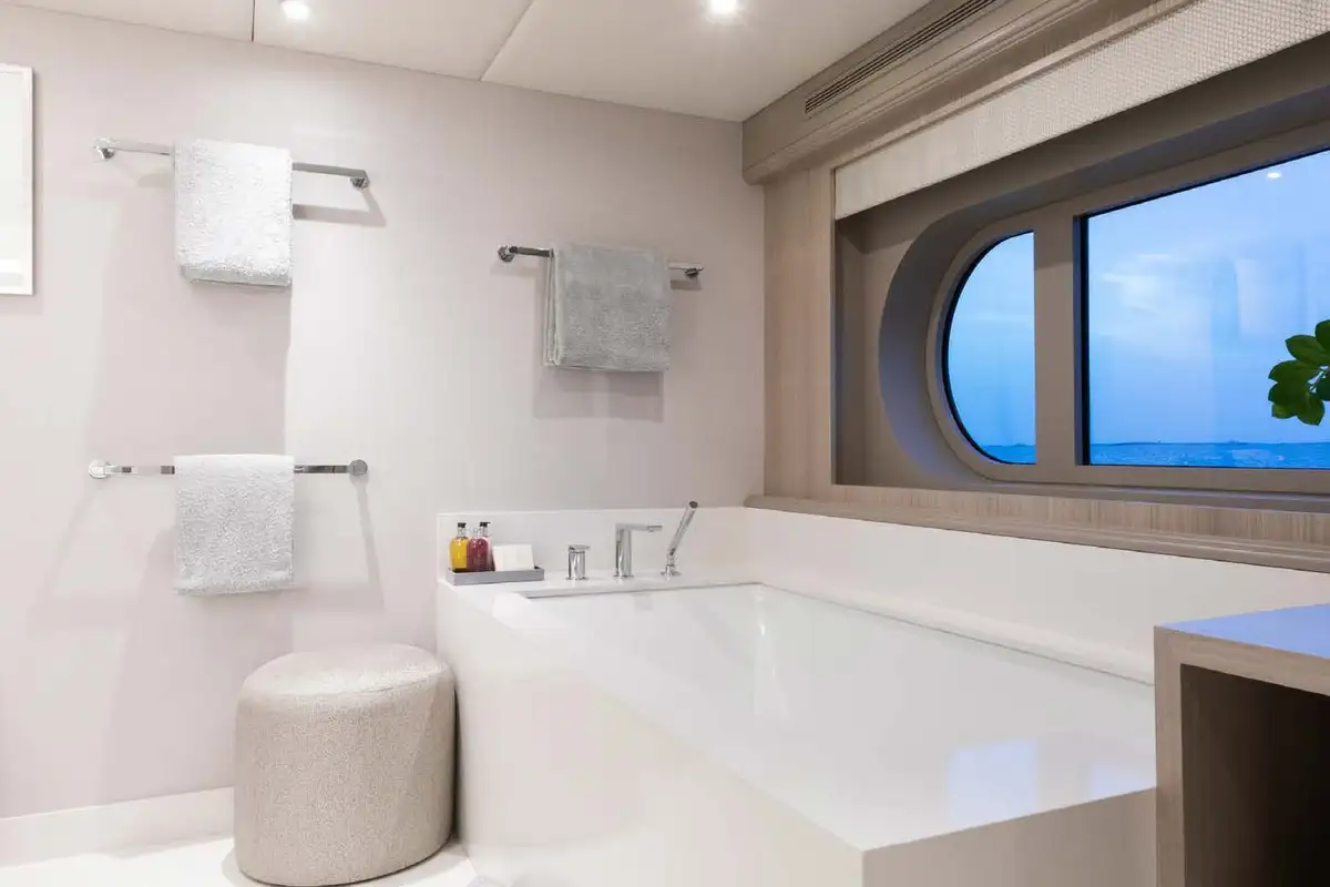 Her redesigned exterior features an expansive seating area forward of the bridge surrounding a fire pit, a spacious bar and 10 person jacuzzi on the sun deck, and a 10ft extension on the stern which presents an additional jacuzzi