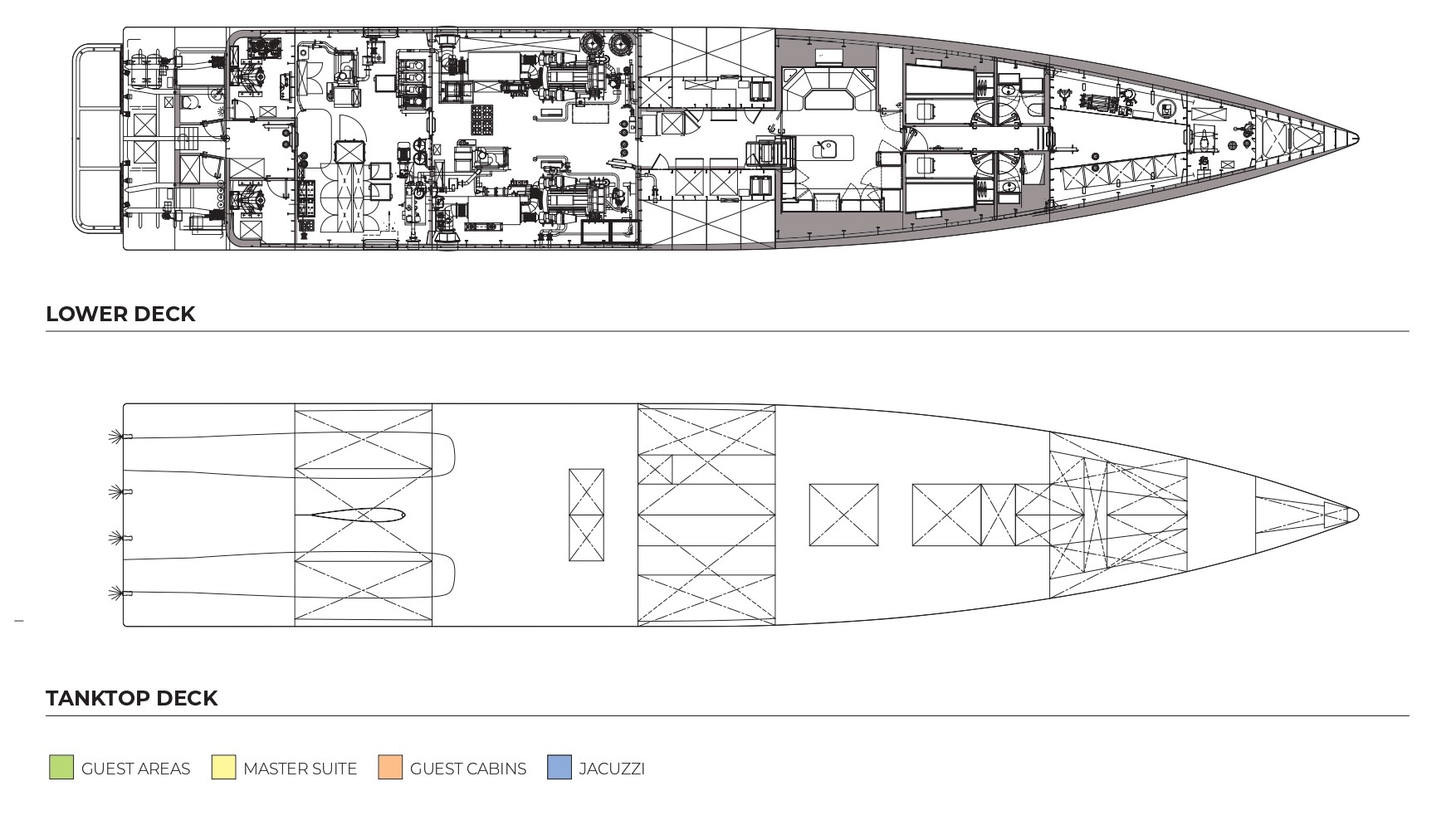 Delivered in 2022 after an extensive 30-month rebuild at Multiship Holland BV, the 196GT NO DESTINATION was extended by 4.5m (14.8ft), fitted with a 5.5-tonne custom A-frame crane, refitted with custom interiors designed by SuperNova Luxury Interiors and Just Design Studio BV and made charter compliant. Her original exterior lines were reimagined by Azure Yacht Design & Naval Architecture.