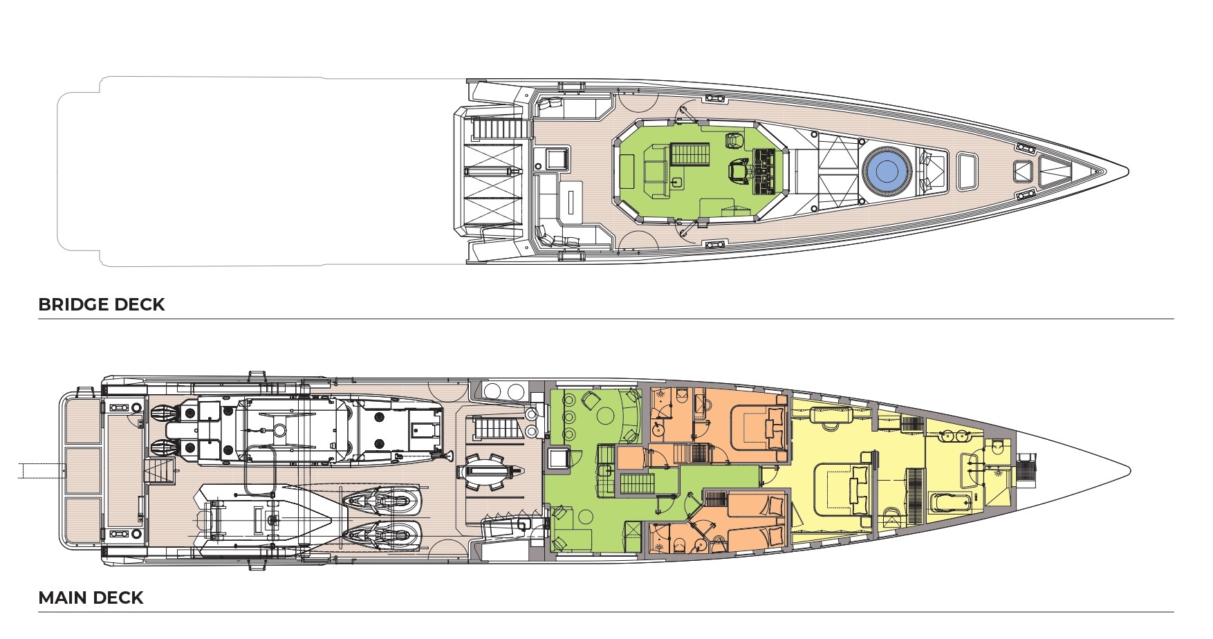 NO DESTINATION delivers incredible views from her foredeck sun lounge with jacuzzi and on the bridge deck aft there is a lounge that doubles as an open-air dining area. On the main deck aft there is a second al fresco dining option with BBQ shaded by the overhang, overlooking the tender and toy storage. When the tenders are in the water, this versatile space can be used in a variety of ways depending on the owner’s desires.