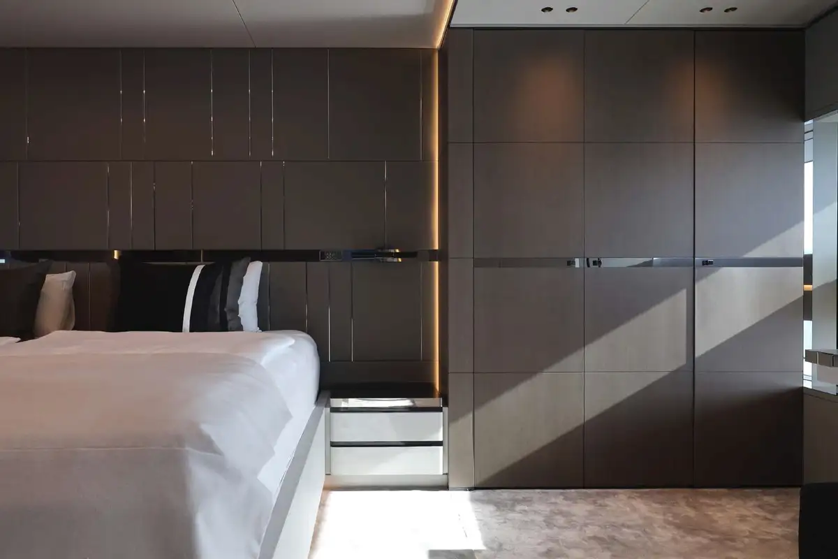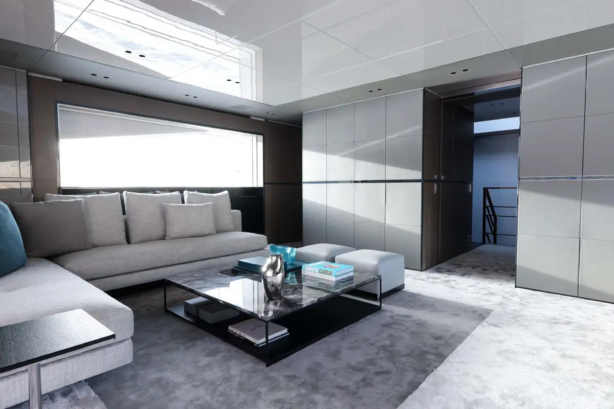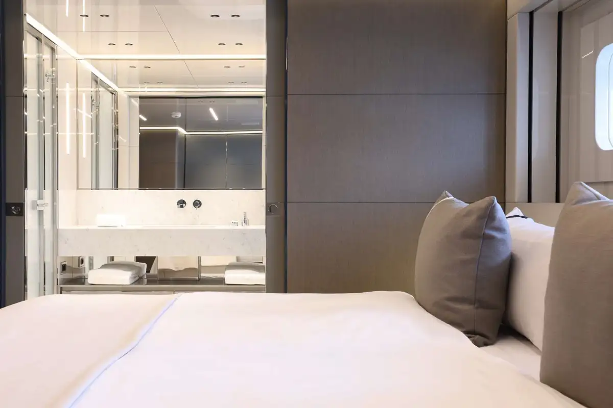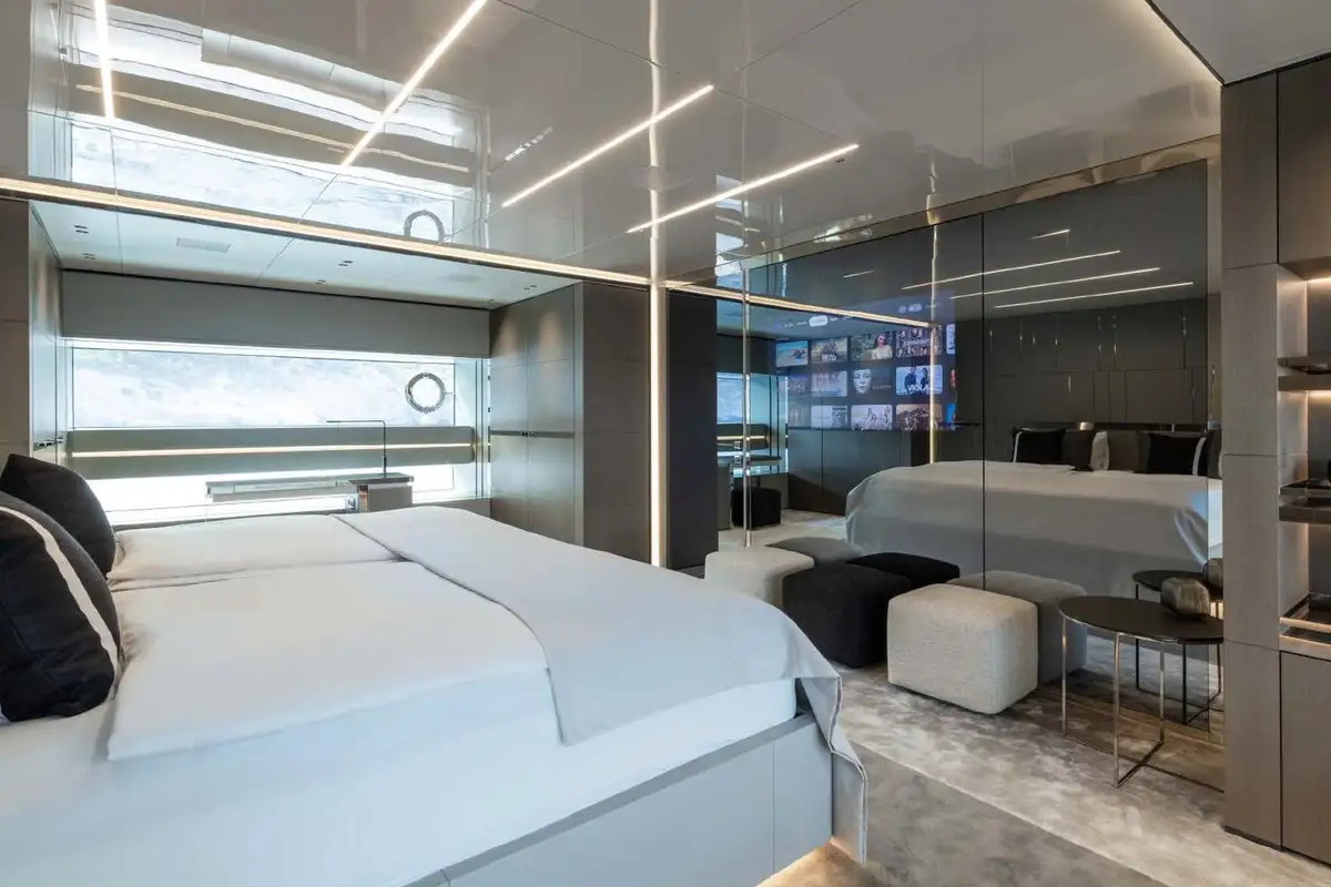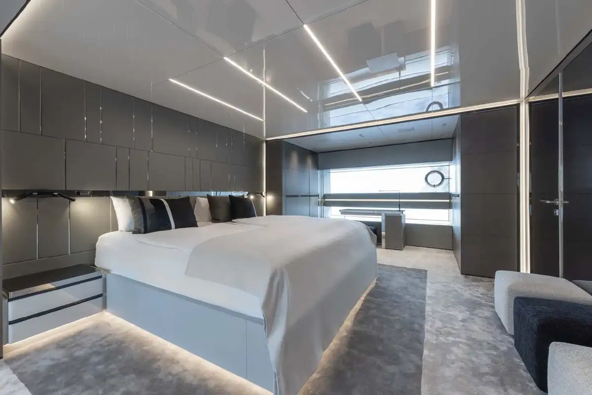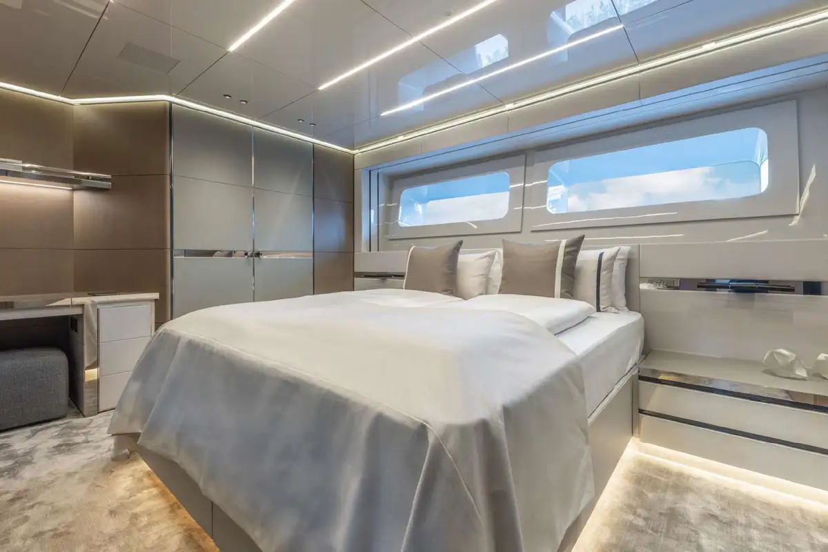 NO STRESS accommodates 10 guests in five cabins. Her luxurious master suite is paired with 2x VIP cabins, a double cabin, and a single cabin. Some of her key features include a spacious, walkaround bow with a 10 square-metre pool, an aft cockpit DJ station overlooking a large beach club, and large floor to ceiling windows throughout the interior bringing plenty of natural light.