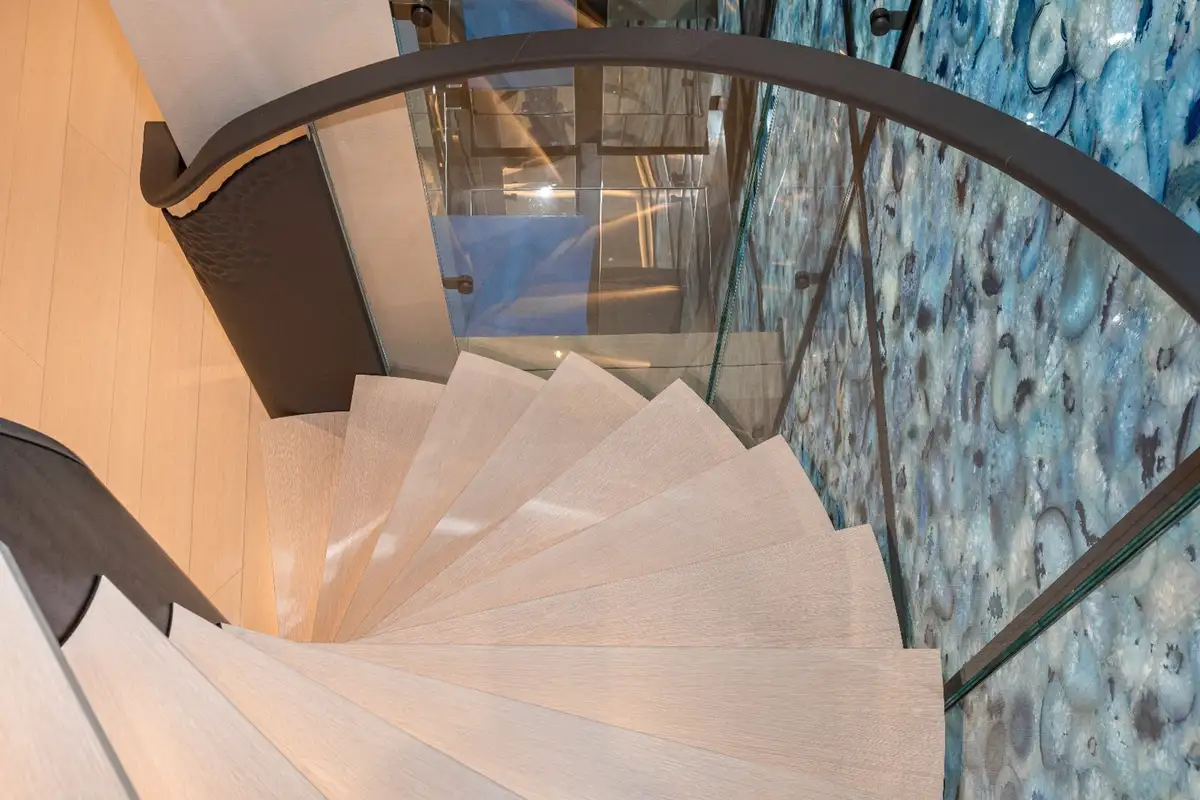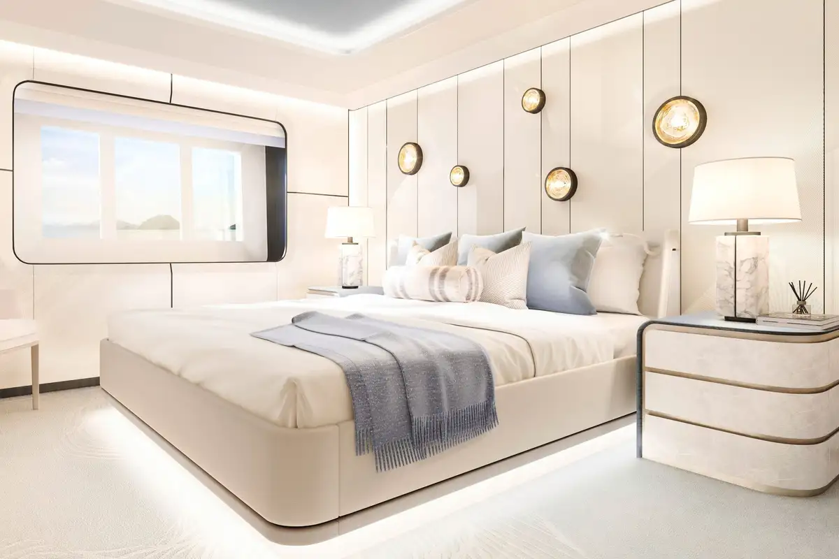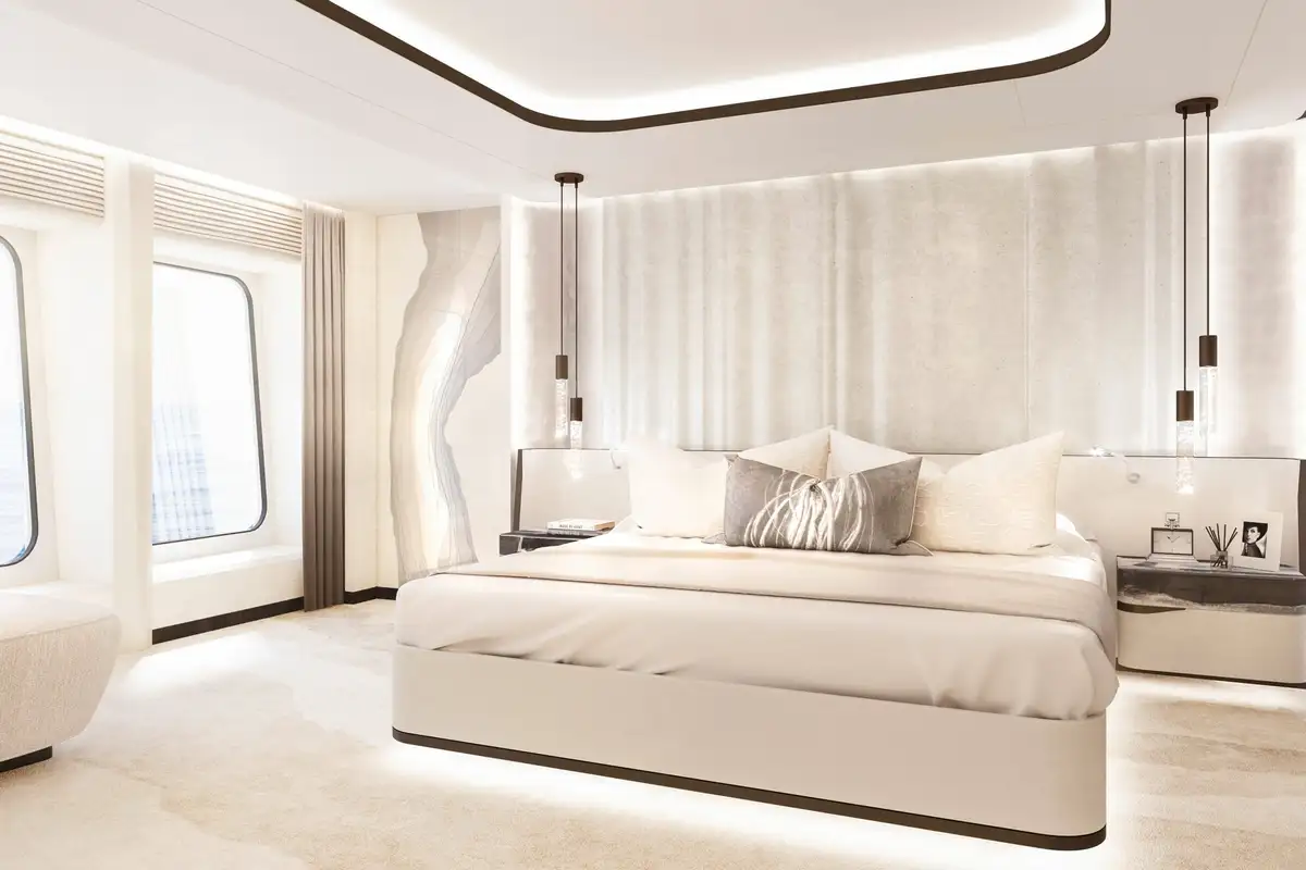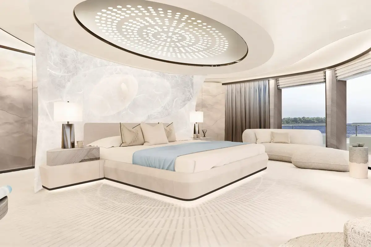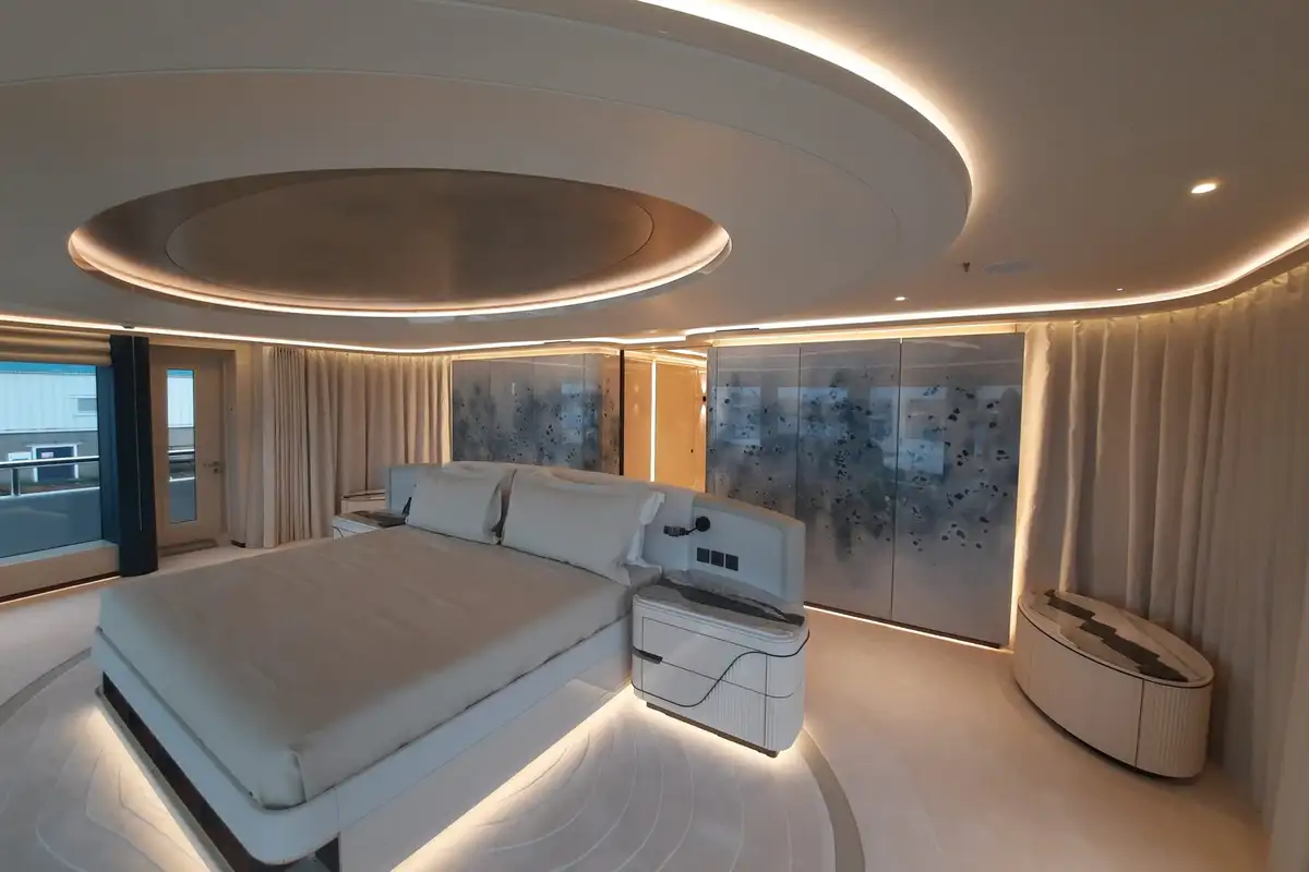 12 guests can find sumptuous accommodation on board NOME. The most lavish is the owner’s suite, found on the owner’s deck, and is full beam with curved floor-to-ceiling glass windows looking forward and out onto private deck with sofas. It also boasts a large bathroom, dressing room, office, and a lounge with a piano. On the main deck, there are two VIP suites with a VIP rotunda giving private access to these cabins. The remaining accommodation can be found on the lower deck, where three cabins – one twin, one double, and one convertible – provide excellent space for additional guests.