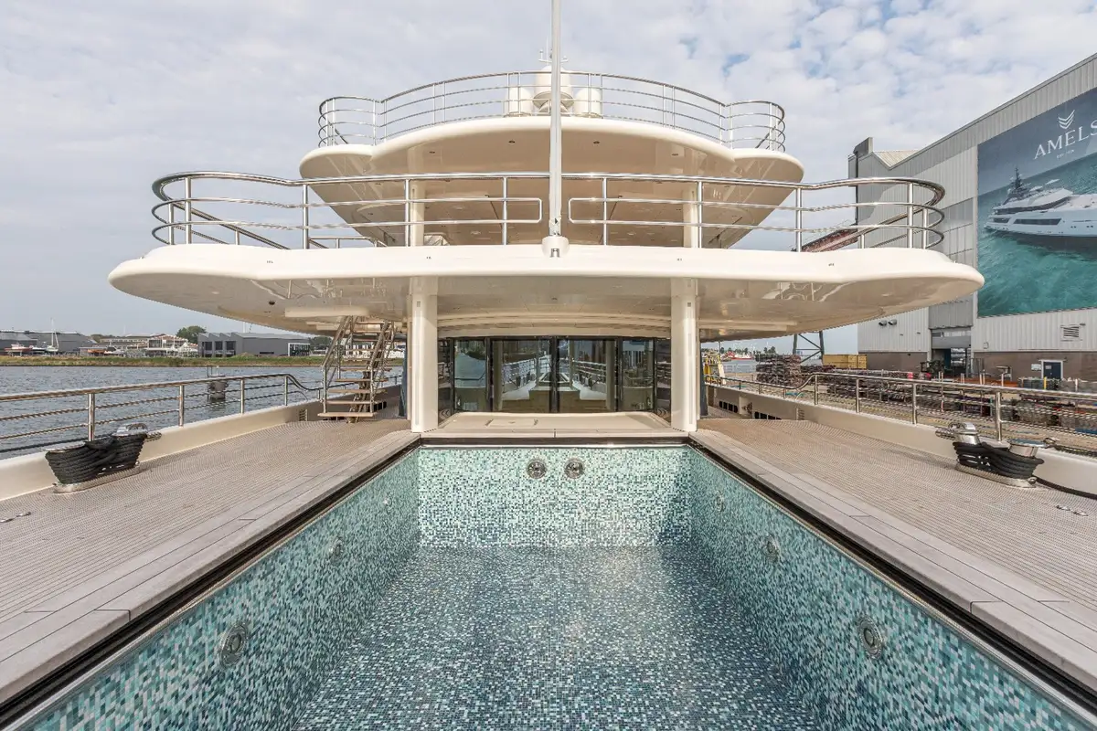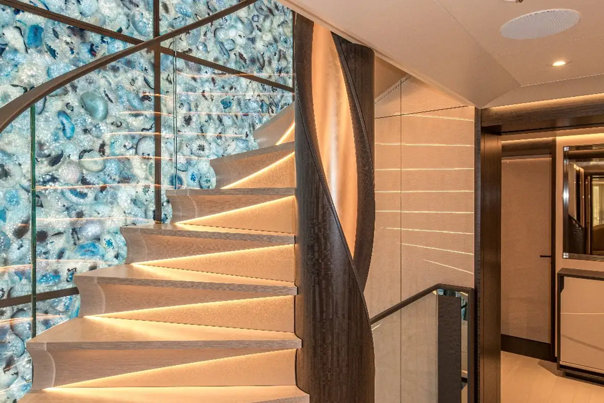 Delivered in 2025, 74m (242ft) NOME is the eighth hull in the successful Amels 242 range. Naval architecture by Damen Yachting, exterior design by Tim Heywood and interiors by Winch Design all come together harmoniously to create this extraordinary yacht, cohesive with its blue colour scheme visible on the exterior, with semi-precious blue agate stones, blue marbles, and blue mosaics throughout.