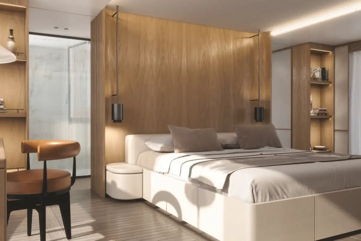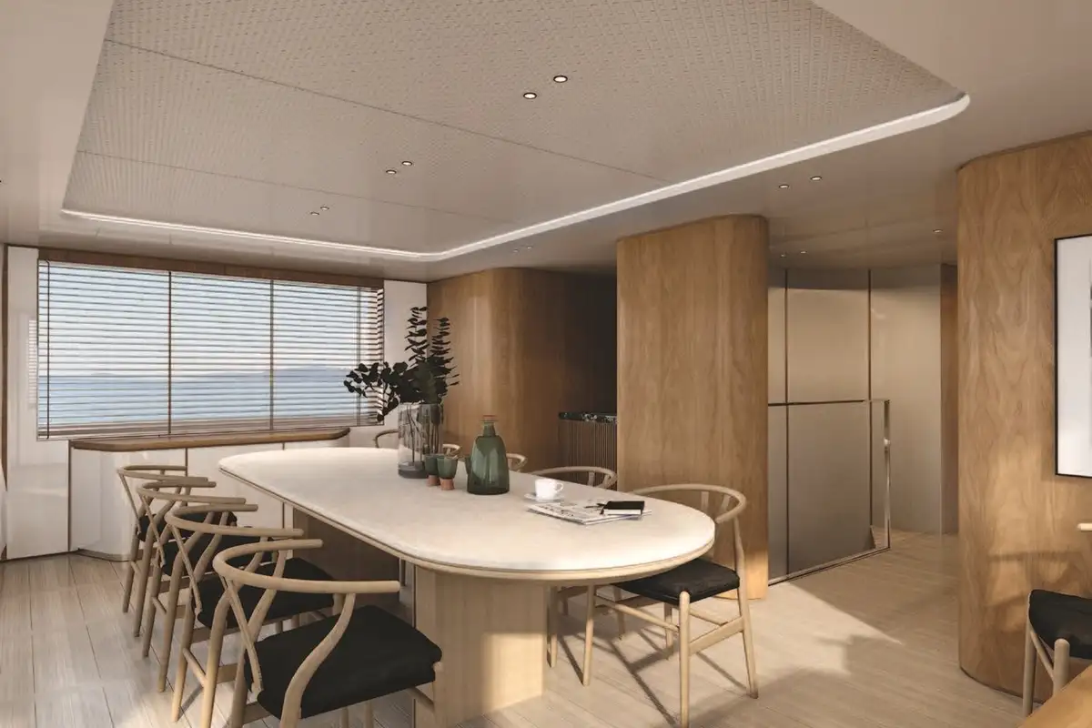 The exterior design of the new series is defined by three-deck layout, a vertical bow and sleek stylistic lines that slope down to the water’s edge. All lines lead to the Oasis Deck, whether that’s from the cascading deck spaces, or via the straight lines along her profile. The Oasis Deck is the heart of this all-new Benetti and has been fitted with “five signature features”. The Oasis Deck is equipped with fold-out wings on either side of the space that expand the space when in use; an infinity pool with glass sides; 270-degree view aft, undisturbed by furnishings or railings; a strong connection with the interior spaces; and a commitment to social design. Inside is strictly modern and a range of furnishings and materials have been used throughout. Her main saloon is kitted out with teak panelling which are cut by large floor-to-ceiling windows. The space benefits from twin-crescent settees, draped in satin white.