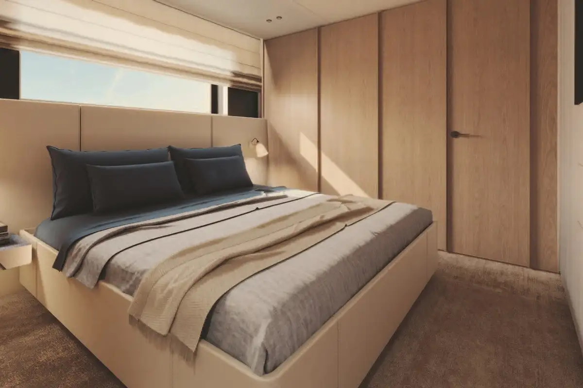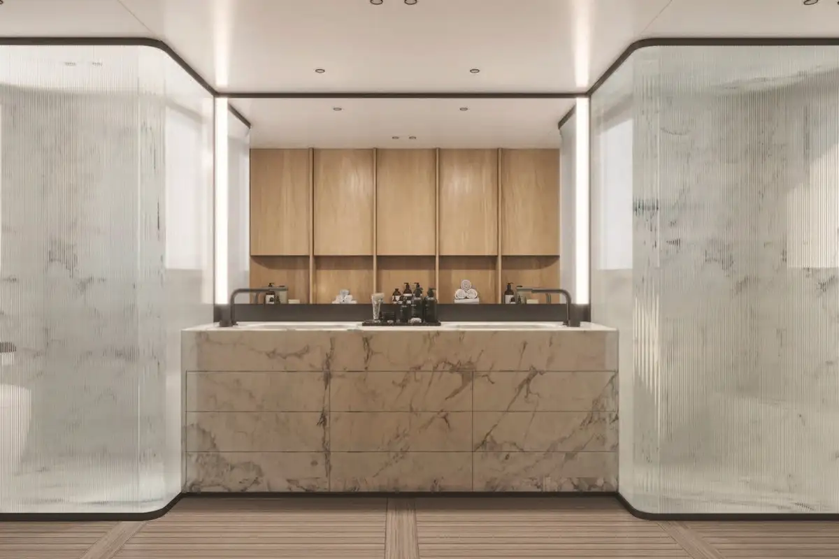 The minimalist design is found throughout the yacht and each suite is also fitted with the light teak panelling and furnished with an earthy and light palette. Her ensuites have additional materials as they have veined, stoned wash basins and heavy glass for the shower area. The BENETTI OASIS 34M has five staterooms, comprising two VIPs and two twin suites located on her lower deck, and an owner’s suite on the main deck. The owner’s suite features full-height windows, private terraces and a full-beam bathroom. Each suite has been furnished in the same materials and fixtures found throughout the yacht, to provide a deep sense of harmony. Like all Benetti yachts, the spaces can be customised to suit an owner’s needs and tastes. In terms of performance, the BENETTI OASIS 34M sports twin MTU engines, which give her a cruising speed of 14.5 knots and a top speed of 16 knots.