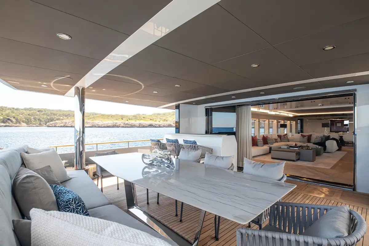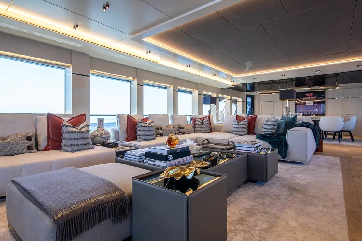 Expansive floor-to-ceiling windows across the yacht's profile provide bounds of natural light on board - predominantly noticeable in the contemporary main saloon (with dining table for 10) which is bright and welcoming.
