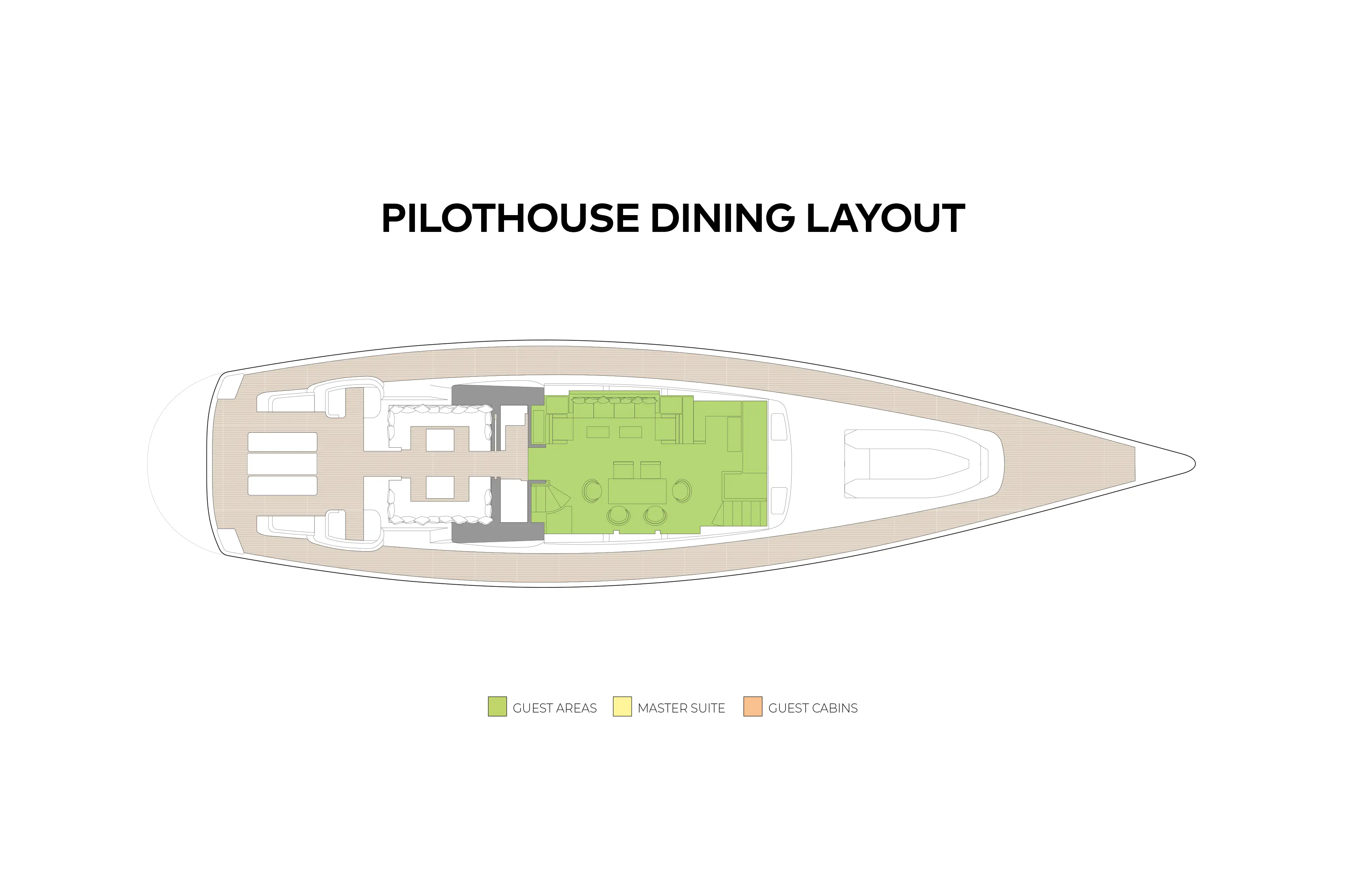 Venture inside and discover PATEA’s bright and airy deck saloon with panoramic 360-degree views through large picture windows and skylights. Exuding warmth and sophistication, the satin-finished light oak floors and American walnut cabinetry create a warm and inviting atmosphere to relax. The saloon can be arranged to accommodate a full lounge area or elegant dining space, complemented by an internal helm station that doubles as a stylish bar. Below deck, PATEA can comfortably accommodate up to eight guests in four cabins, including a full-beam owner’s suite, a double cabin, a convertible cabin, and an additional en-suite cabin that can also serve as a TV lounge. The layout thoughtfully ensures privacy and functionality, with separate crew and guest areas.